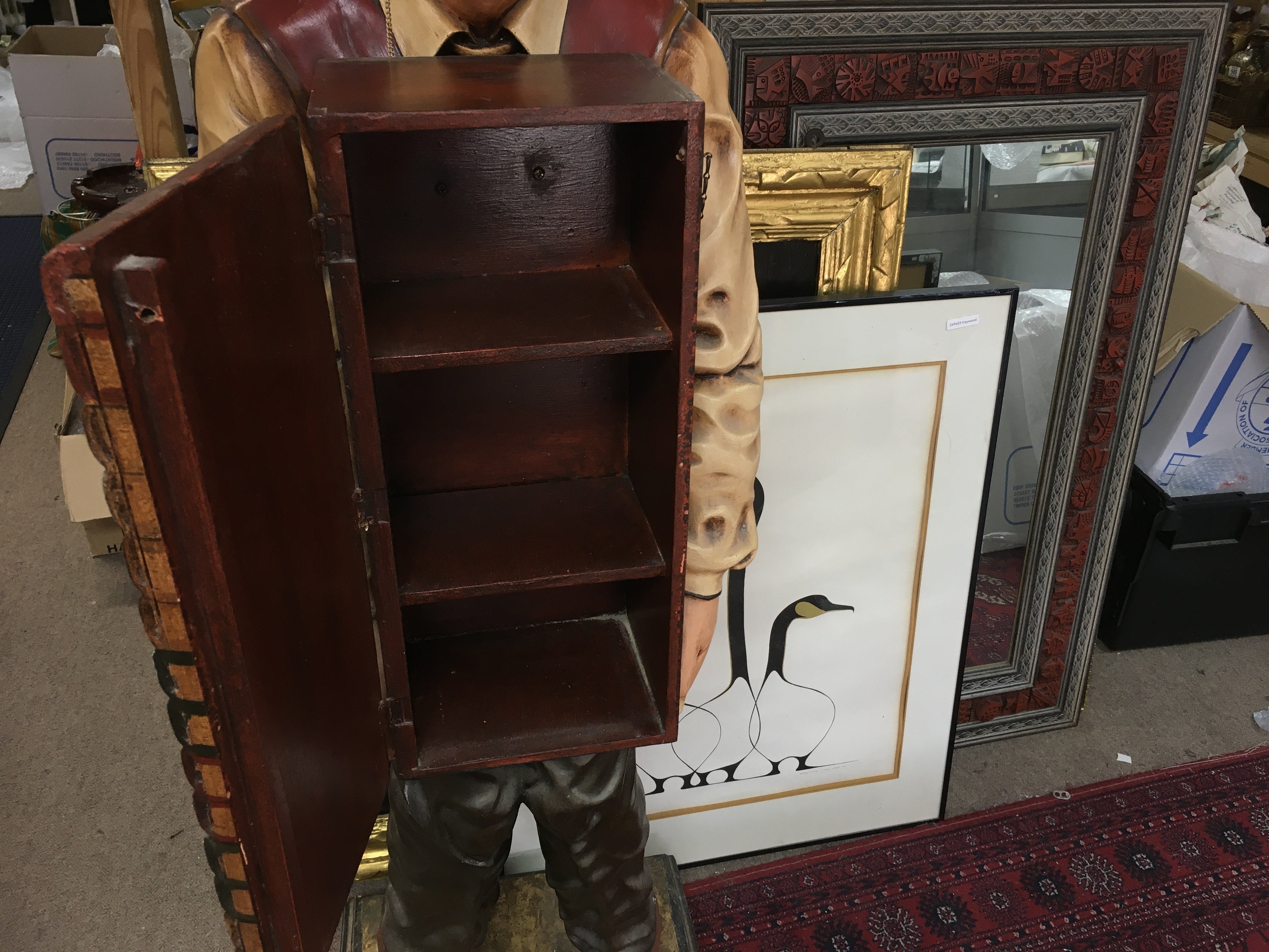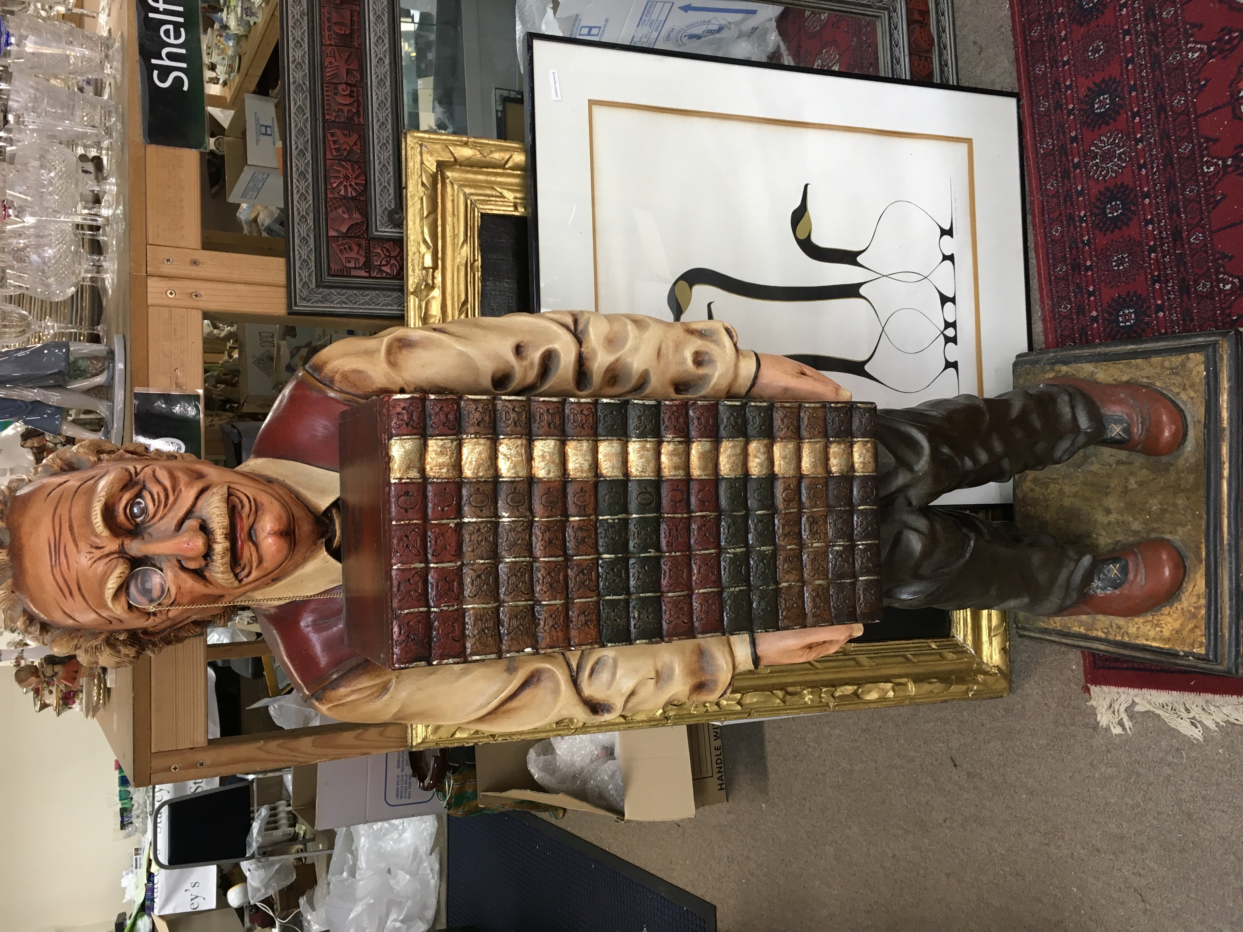 Fiberglass sculpture of Albert Einstein holding a stack of books which is actually a wooden cabinet 53 inches tall.