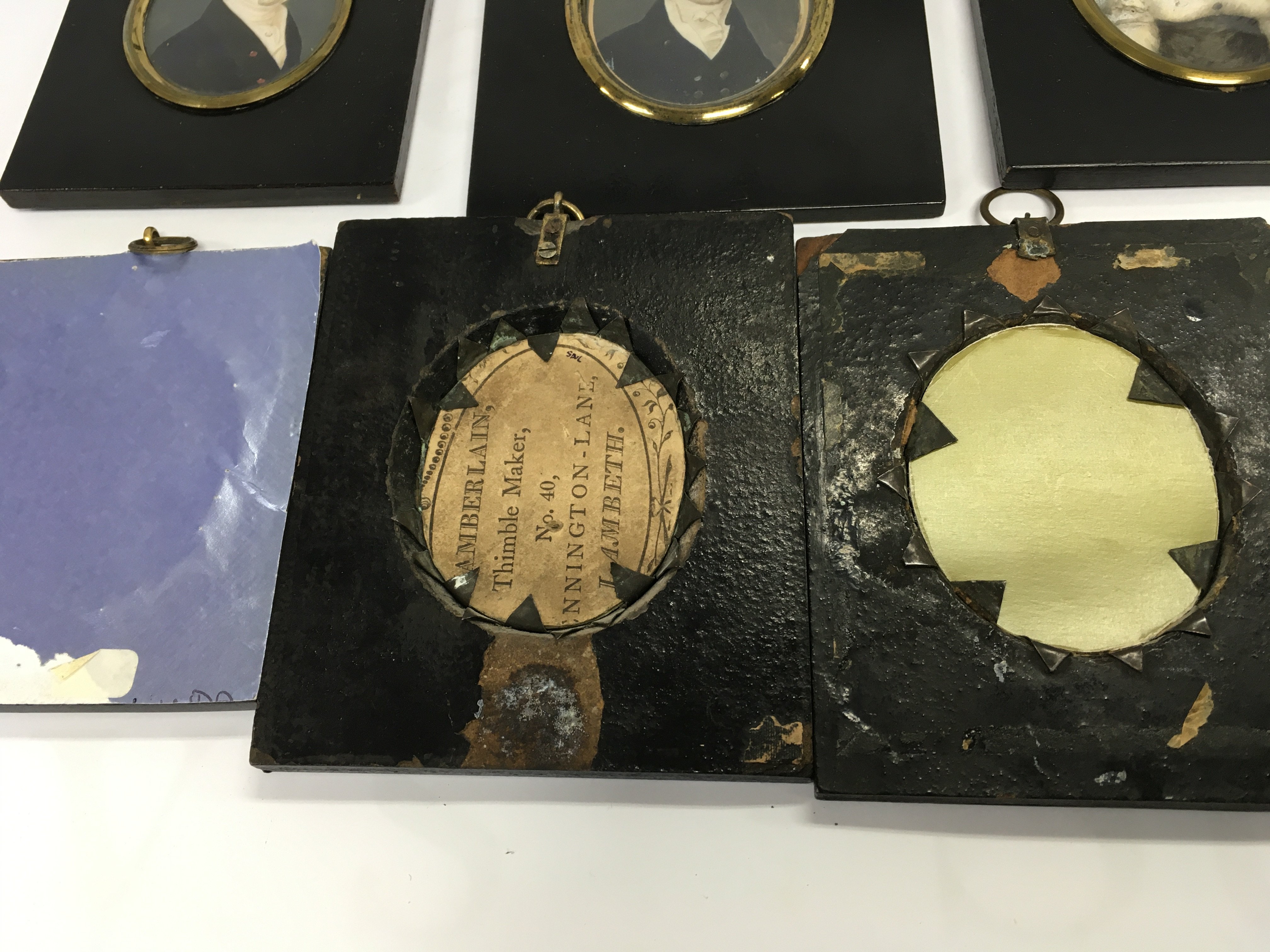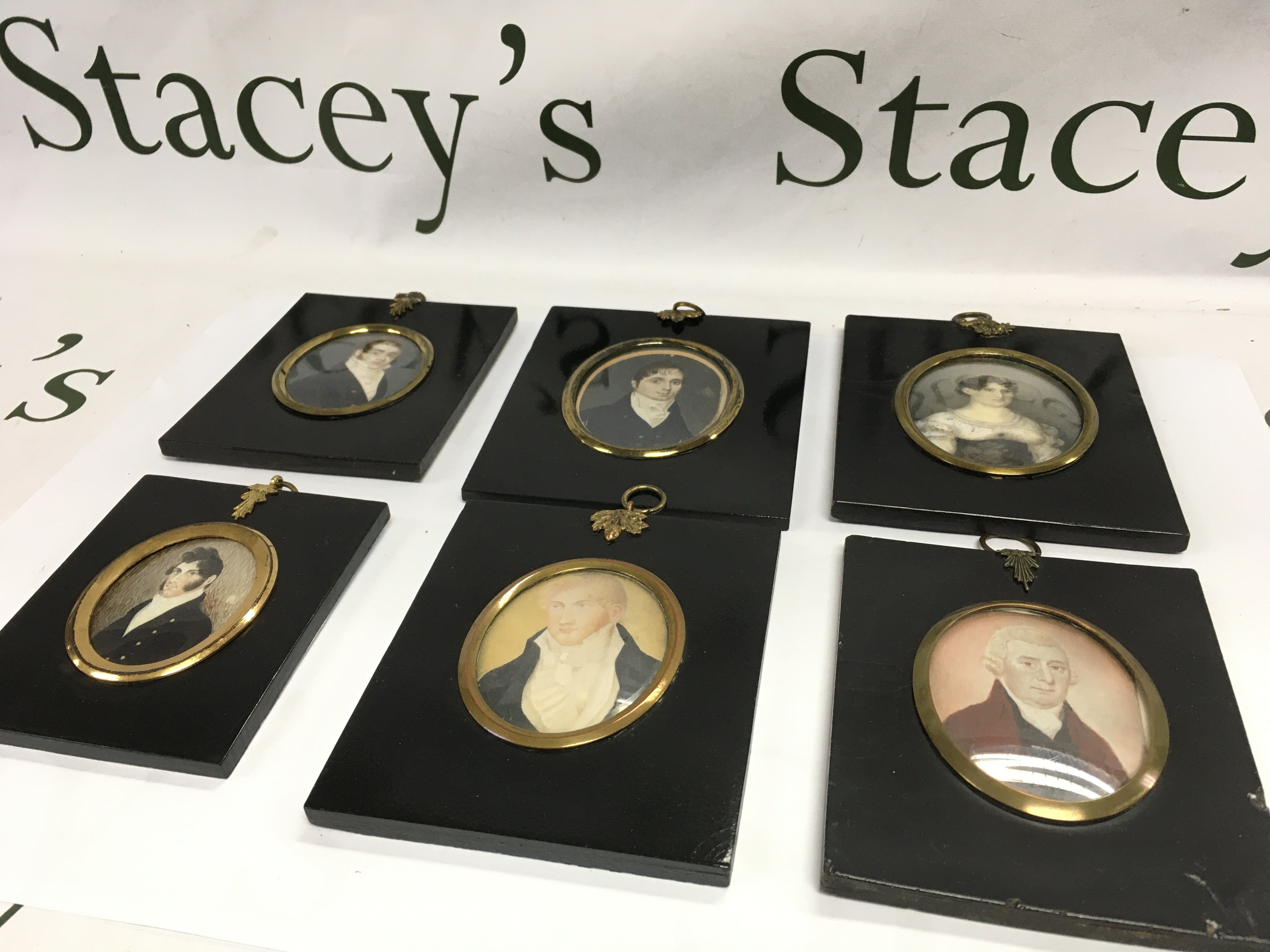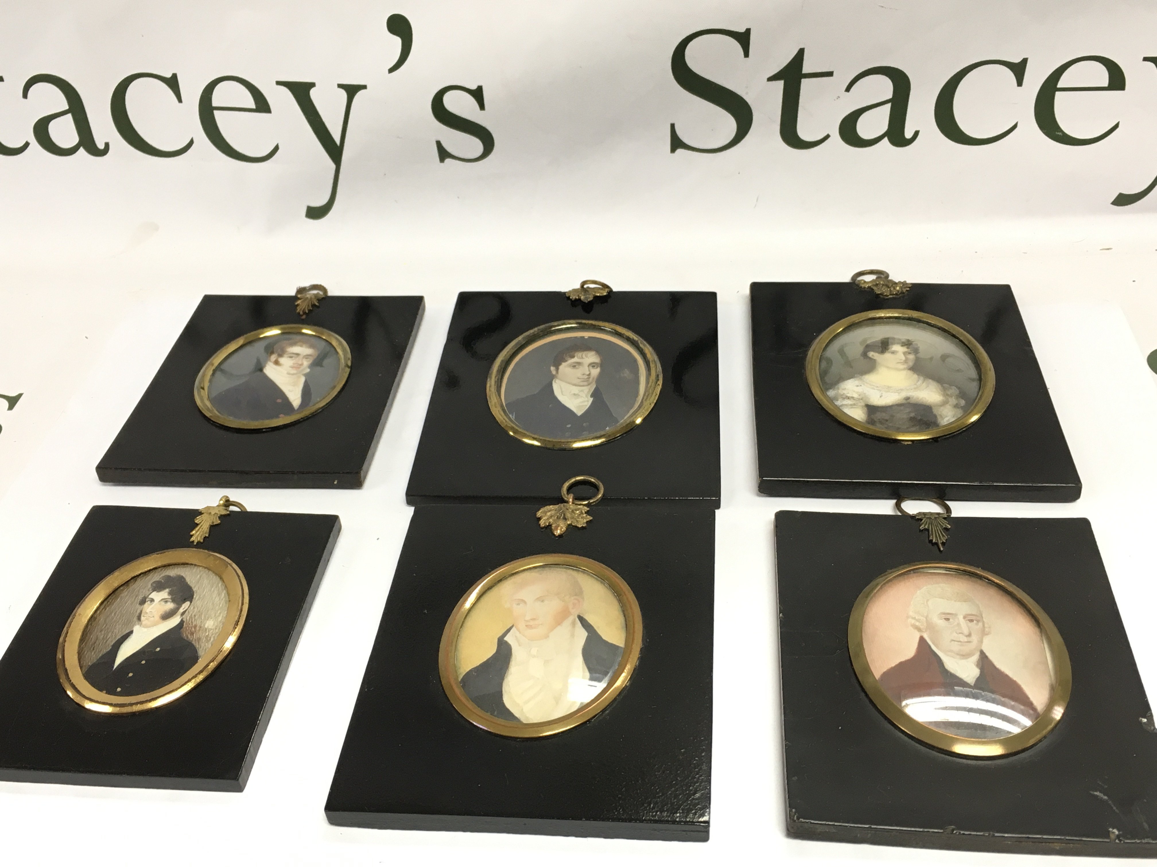 A collection of six 19th century ebonised, framed portrait miniatures including five gentlemen and one lady