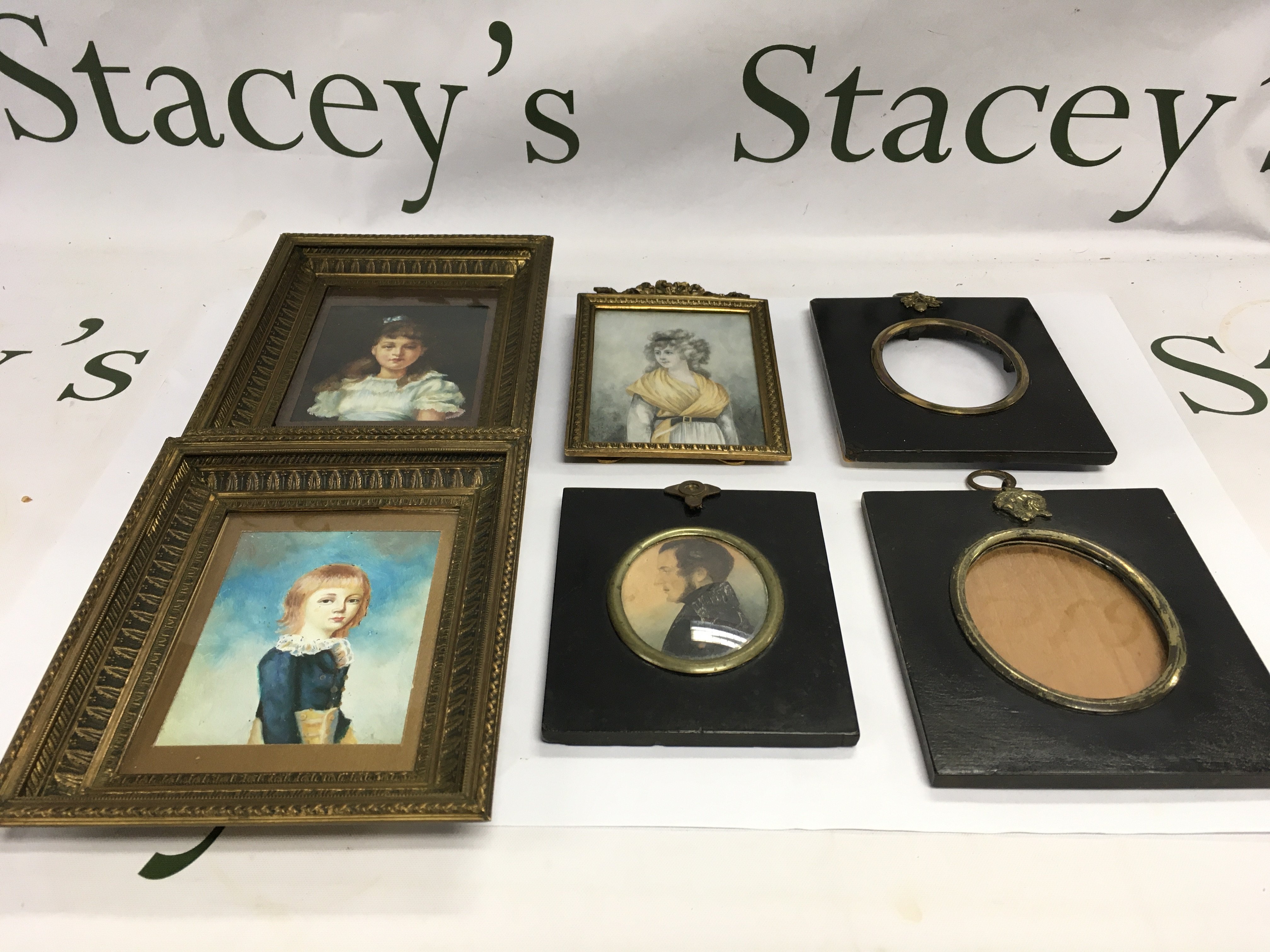 Four framed miniatures, comprising Henry Jacob Birch by Sylvester Douglas, two gilt framed portraits of ladies, oval Officer portrait and two ebonised frames