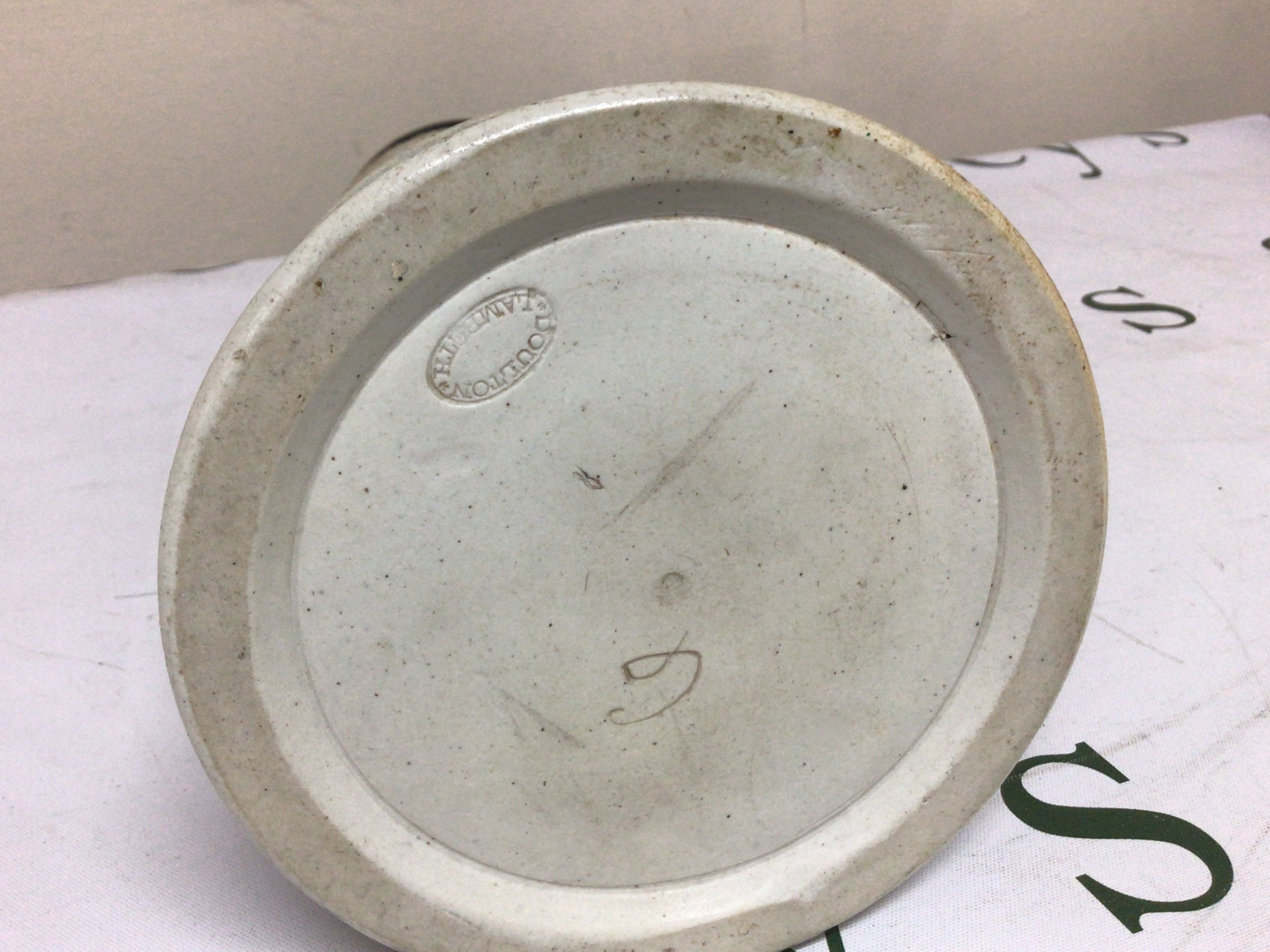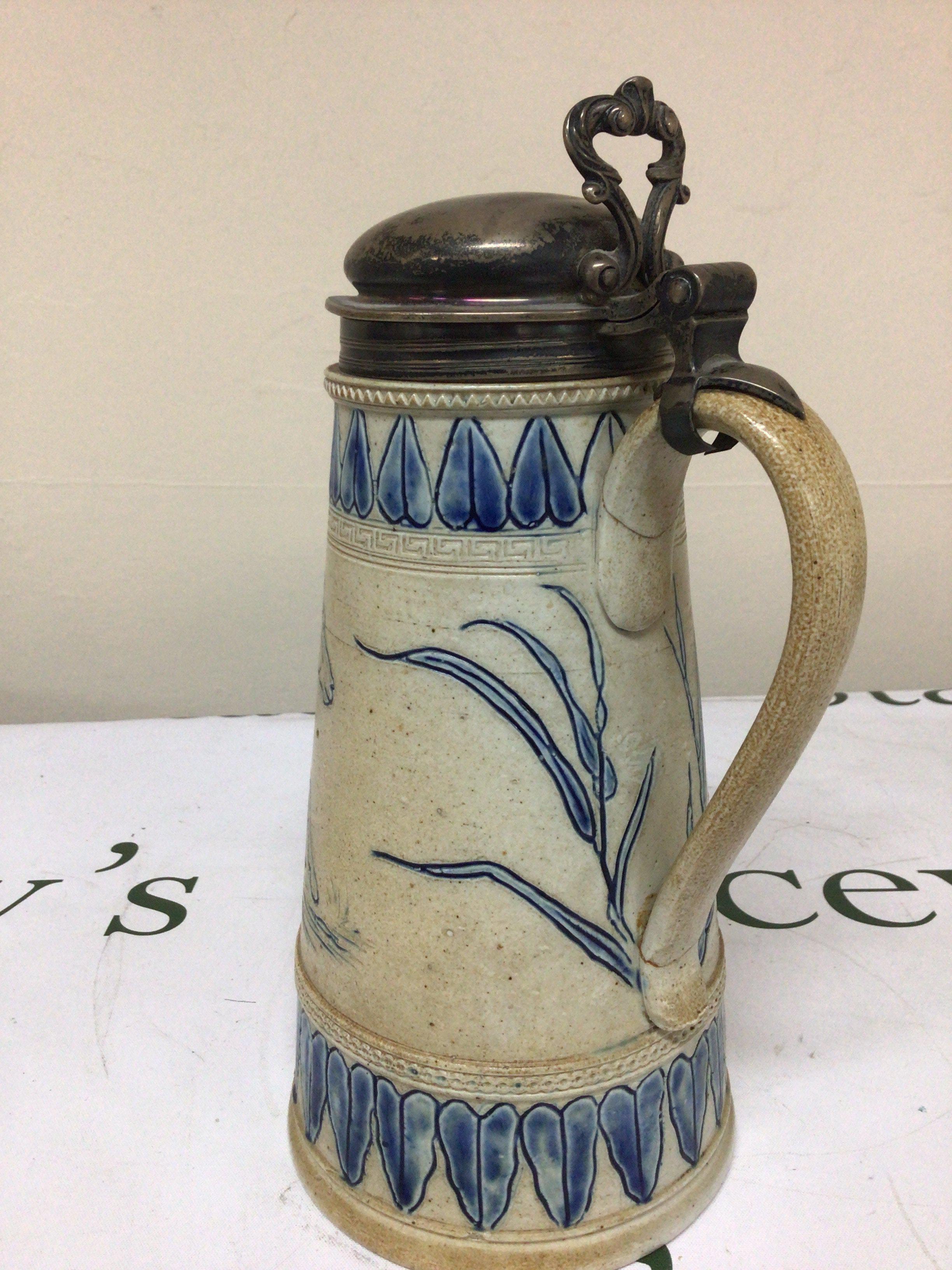 A Lambeth Doulton Victorian stoneware jug with a silver hinged top the sides with horses and a repeat pattern boarder. damage to the handle Hight 26cm marks to the base.