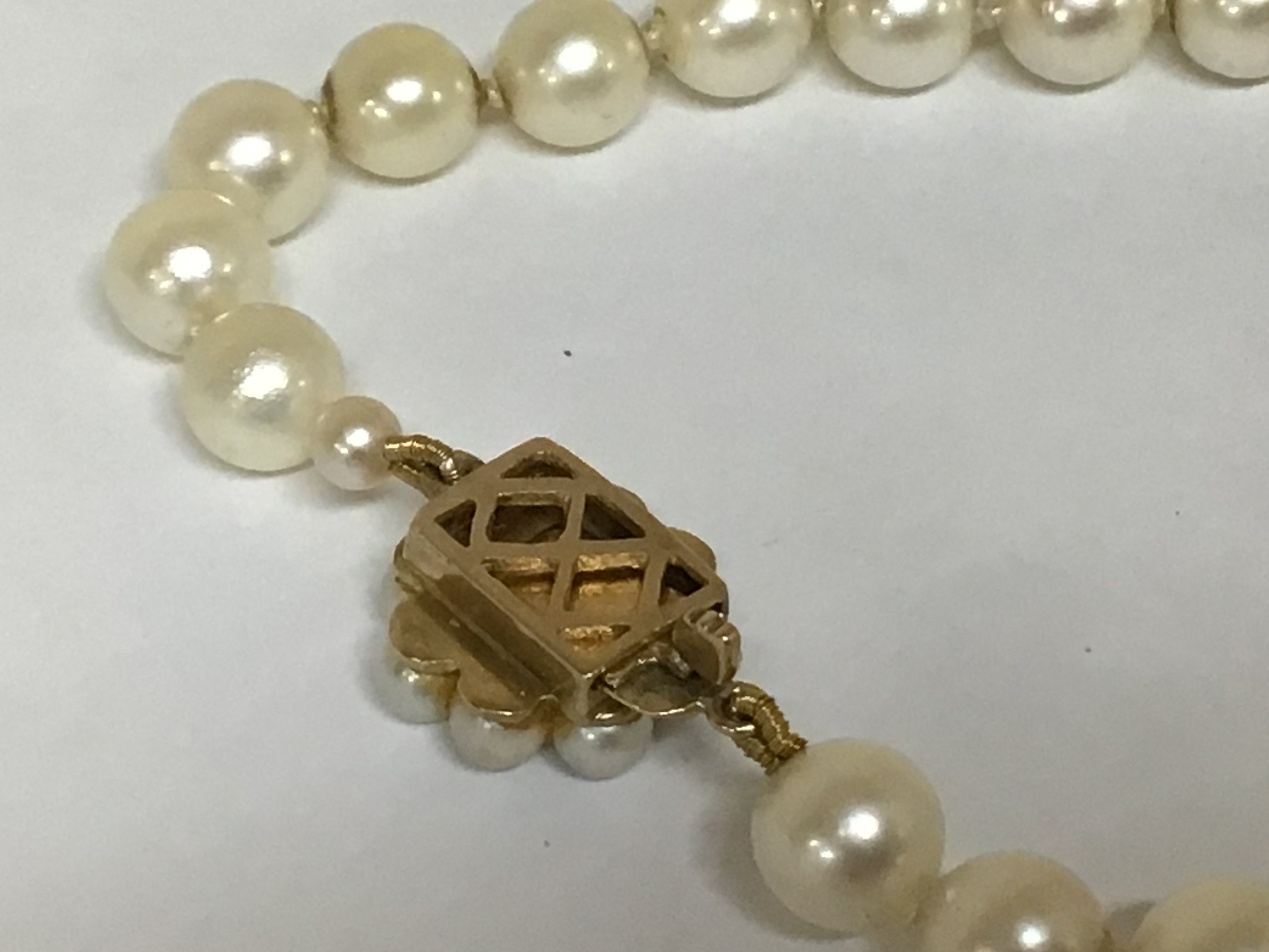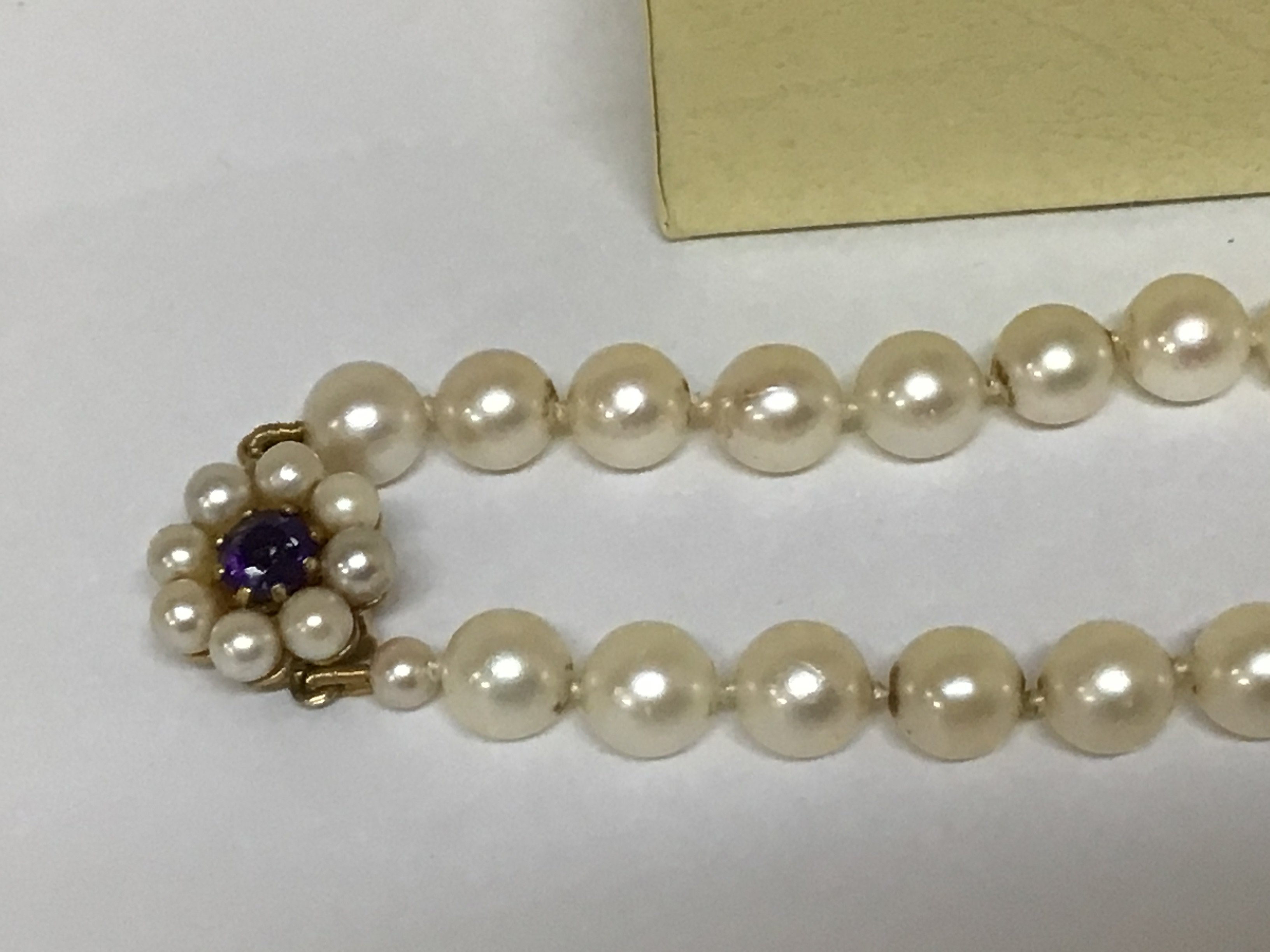 A Pearl necklace with an unmarked gold clasp set with an Amethyst length 48cm approximately. These are possible Mikimoto Pearls.