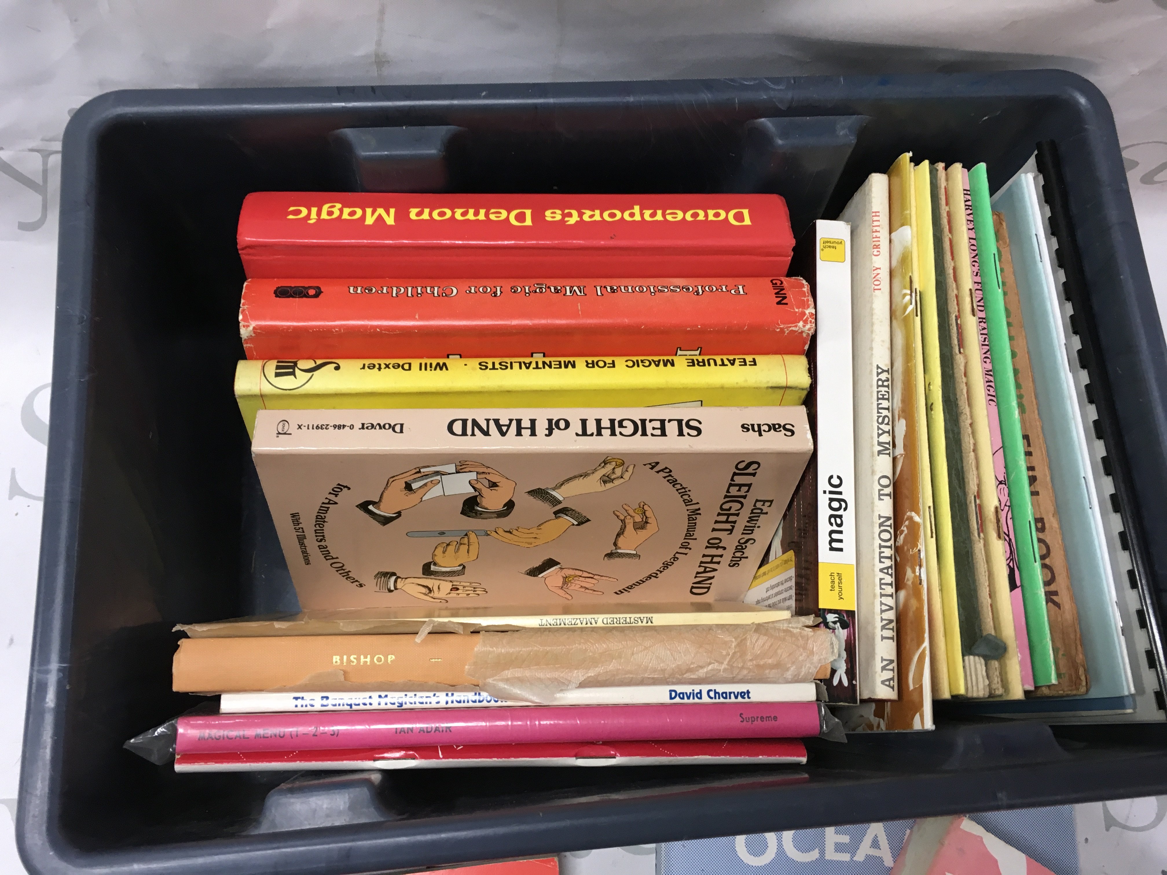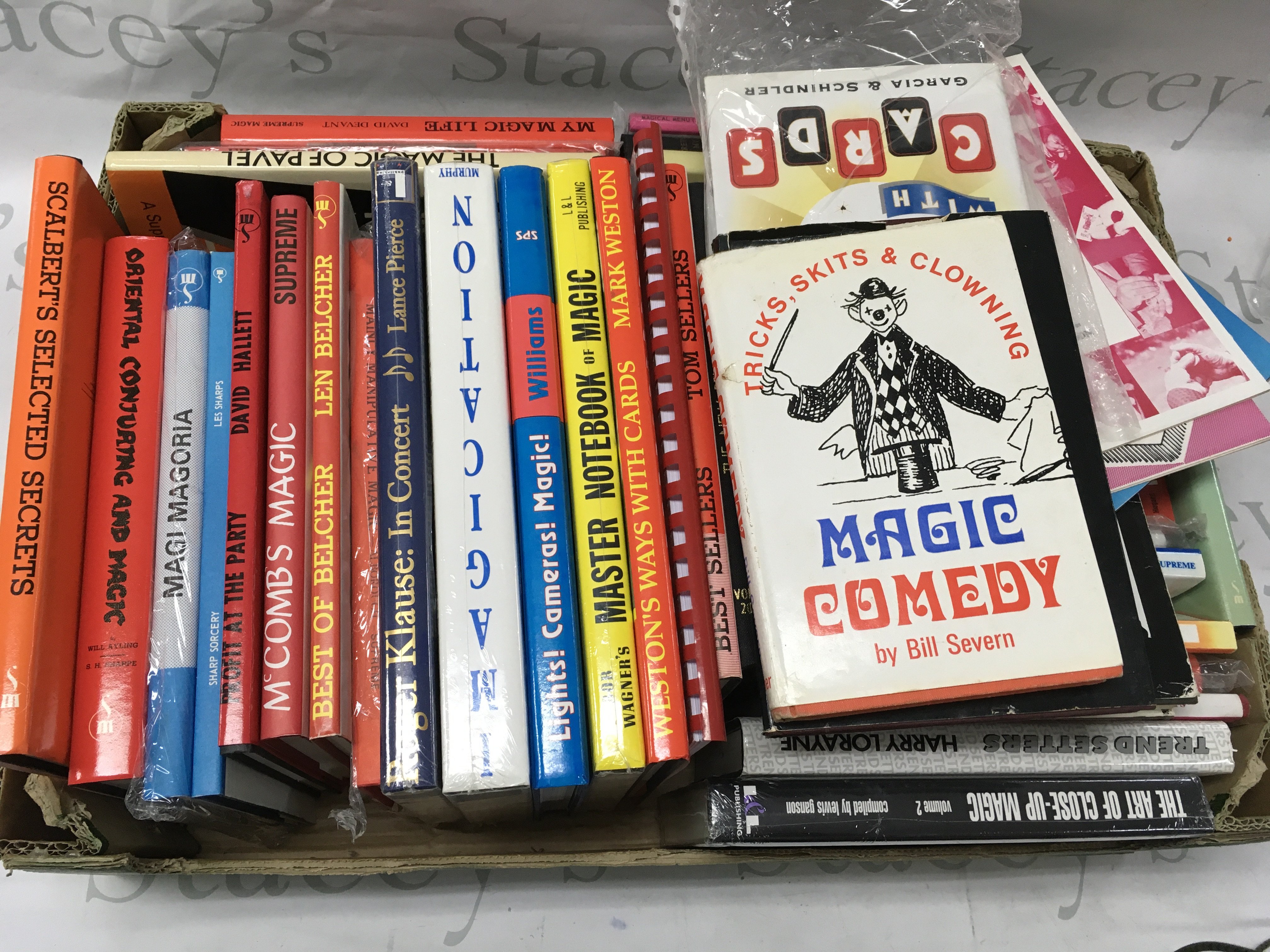 Two boxes of magic books including various magician handbooks and some encyclopaedias as well as some clown comedy books.