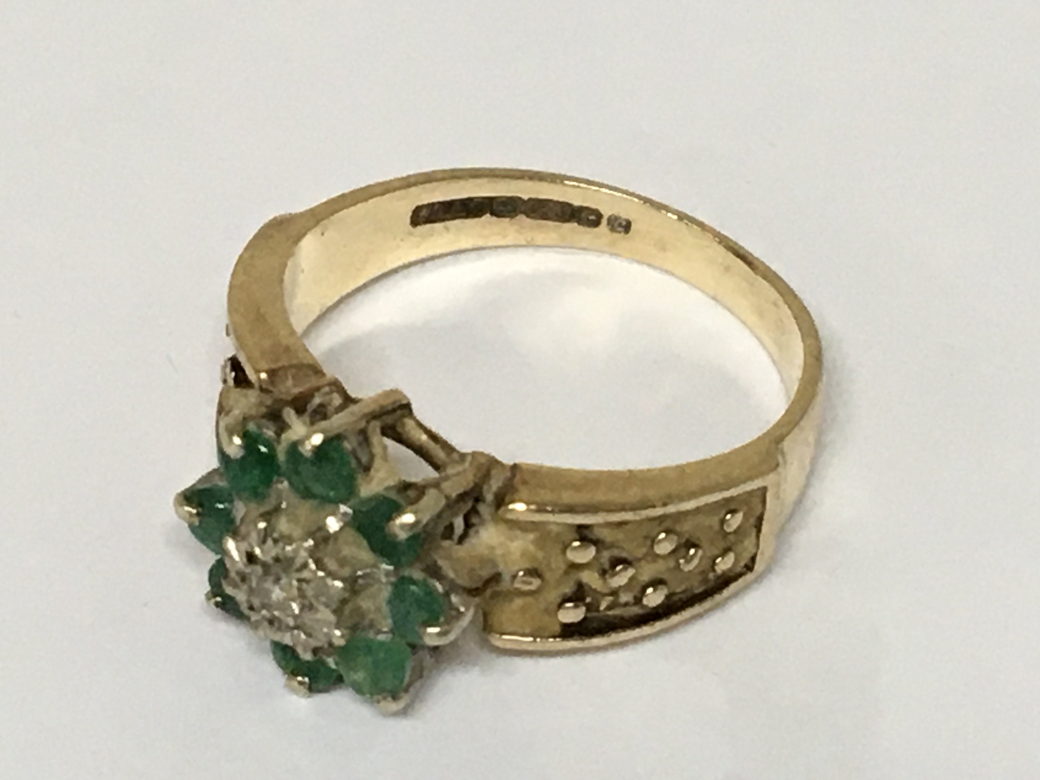 A9carat gold ring set with a pattern of emerald and small diamonds. Weight 4g