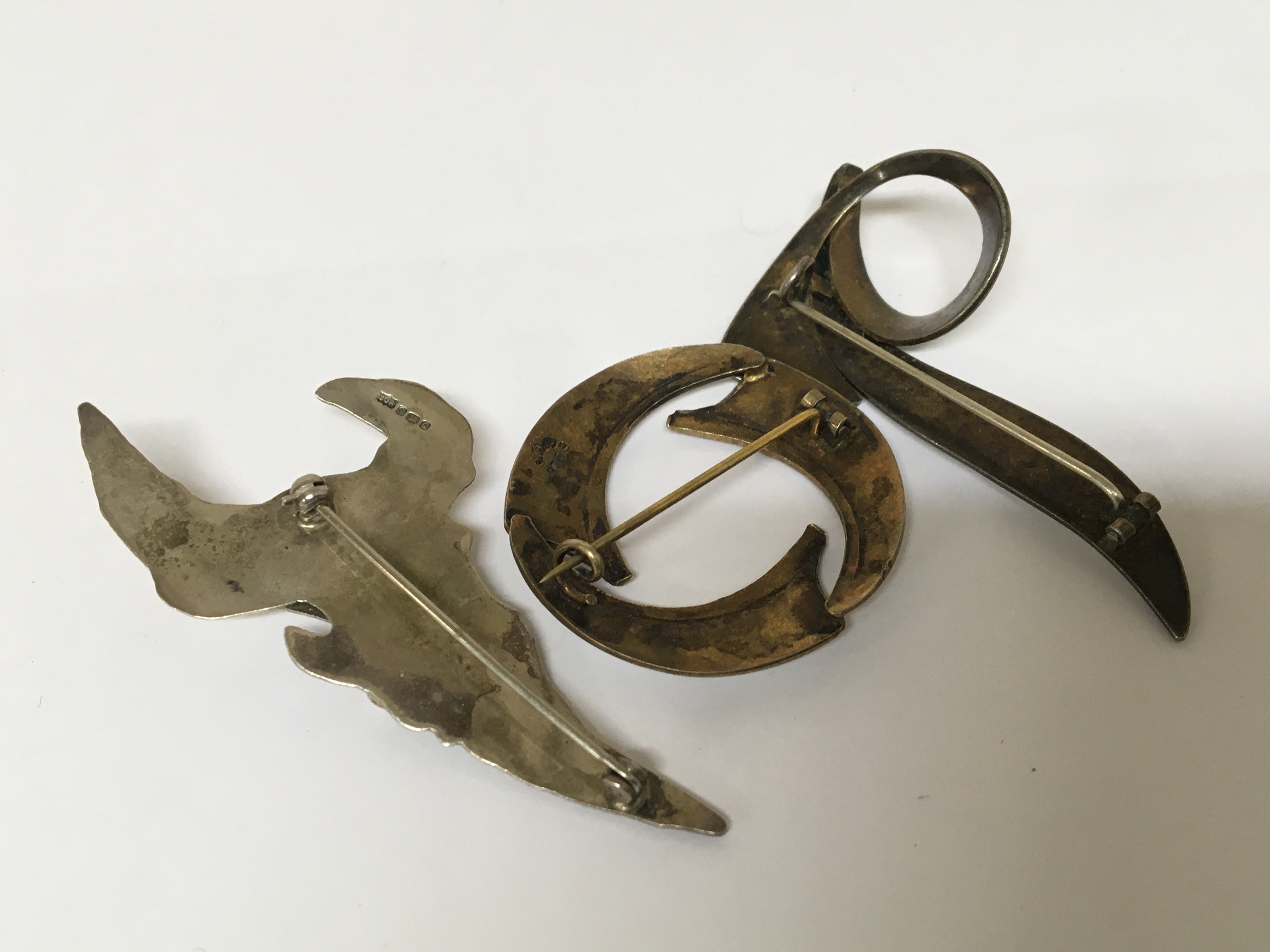 Two silver and enamel modern design brooches and one other silver modern design brooch. (3)