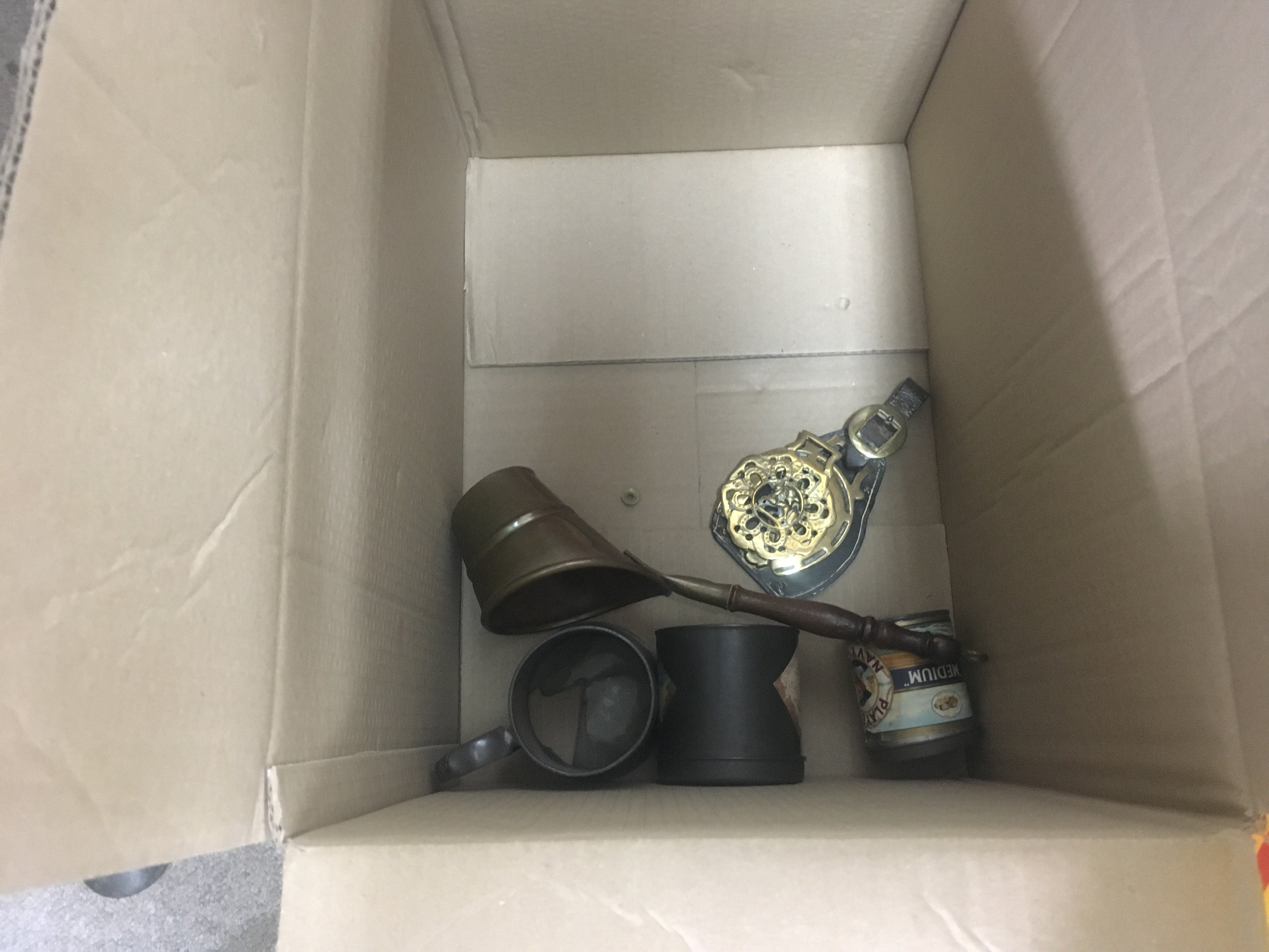 A box containing glass bottles advertising various ceramics and a pewter jug.