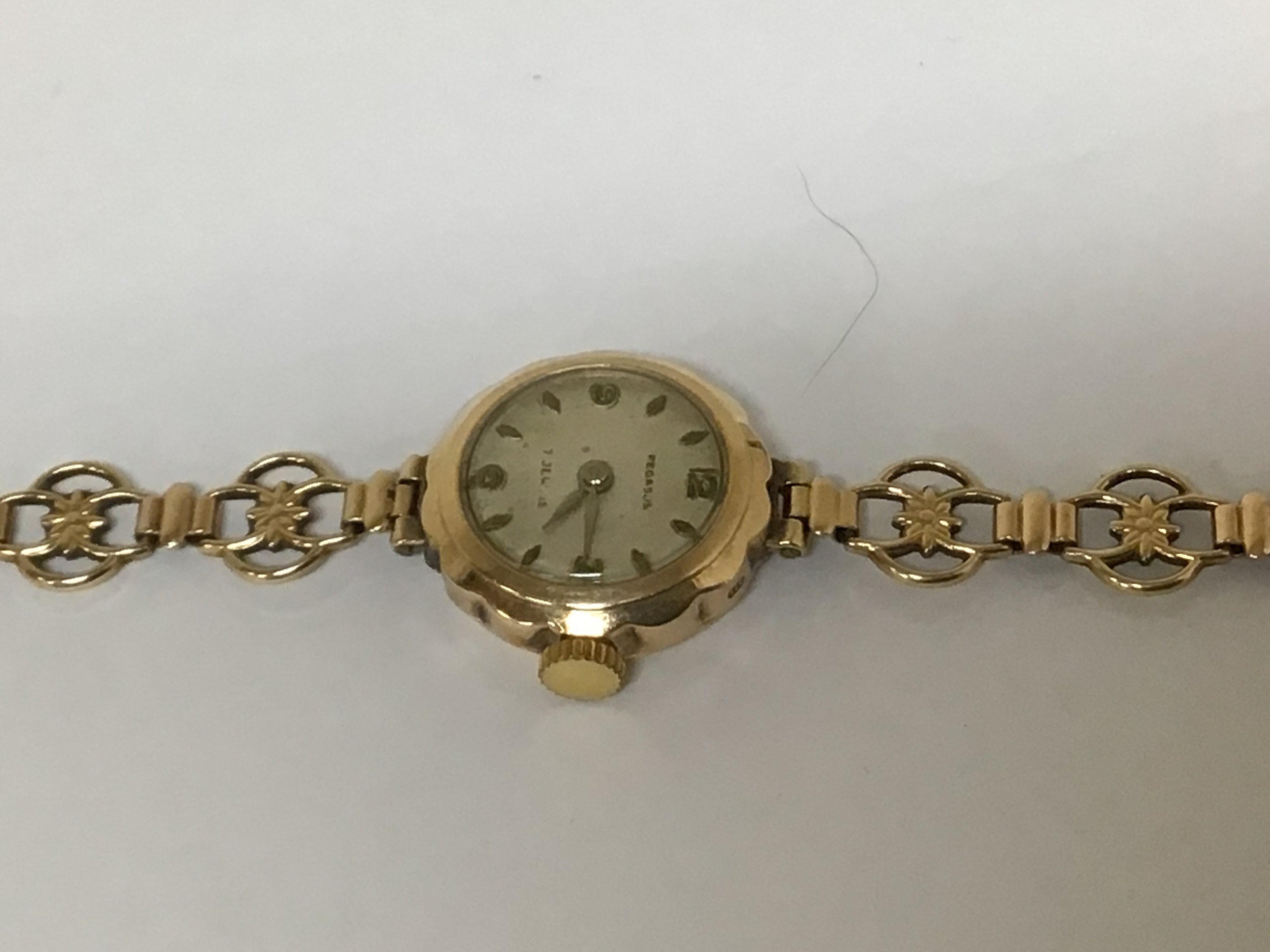 A Vintage 9carat gold ladies watch maker Pegasus with an attached 9carat gold open link bracelet. Weight 12g
