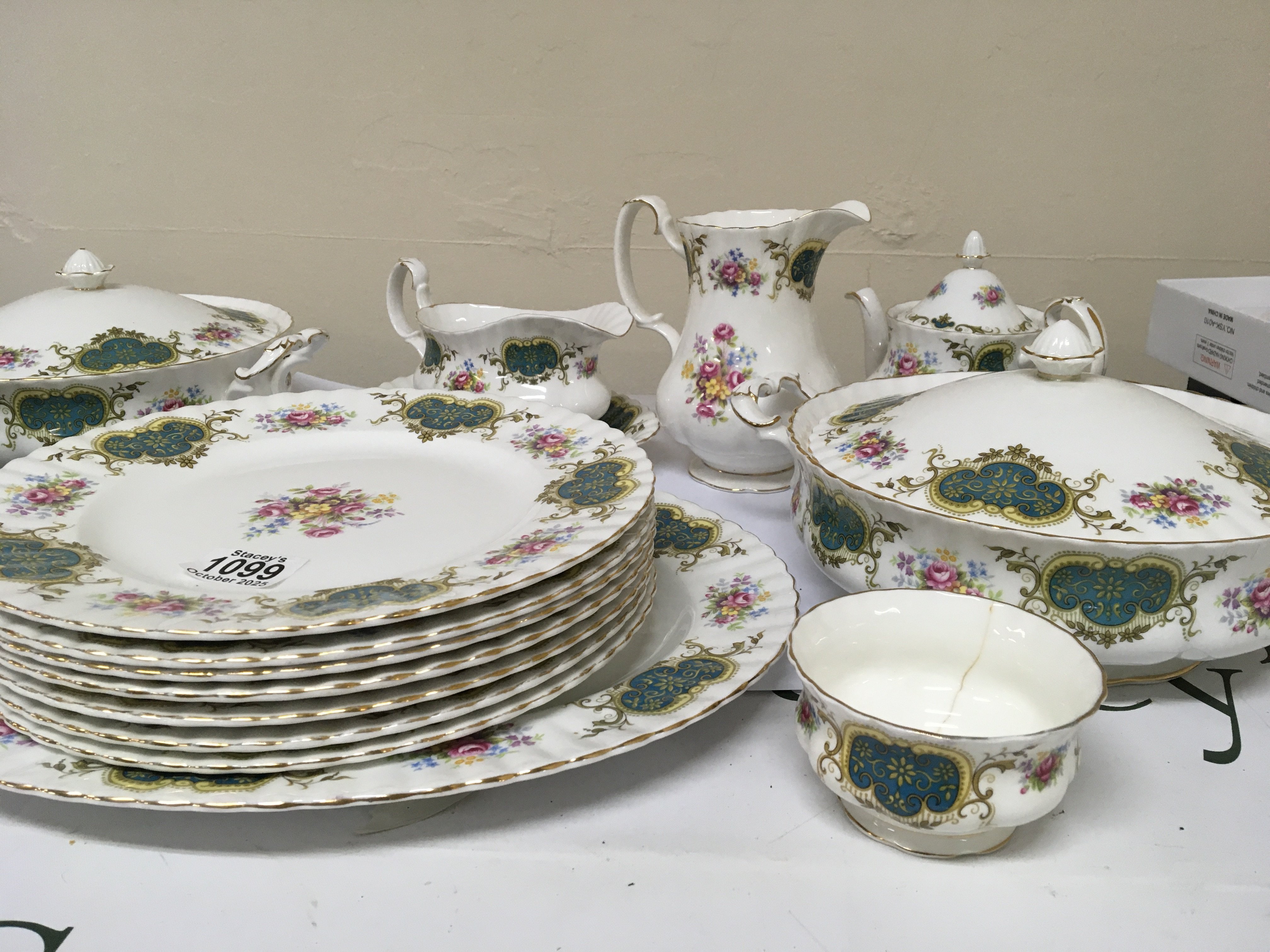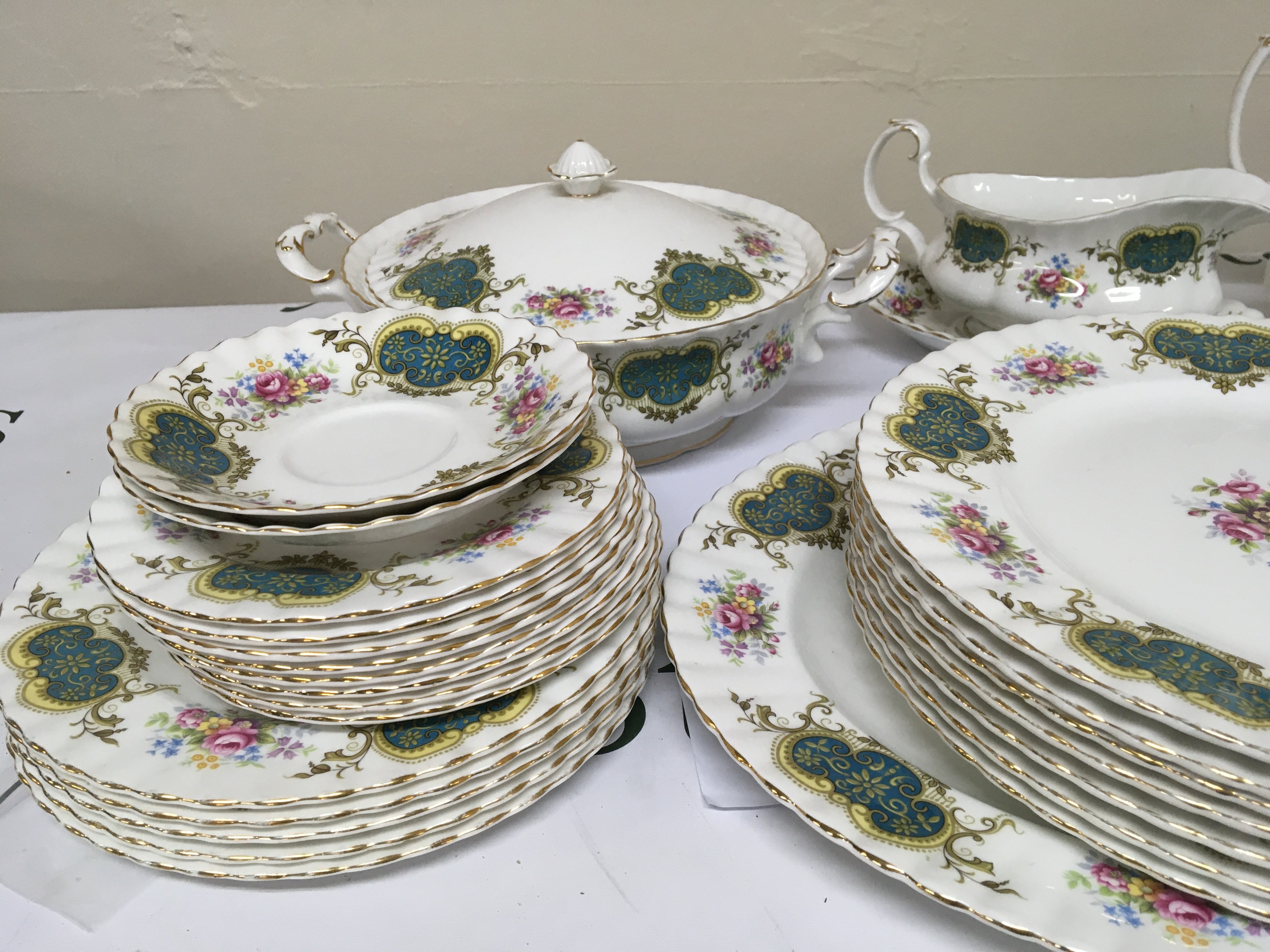 A Royal Albert bone china Berkeley pattern dinner service comprising two tureens small tea pot jug sauce boat plates. Sugar bowl cracked.