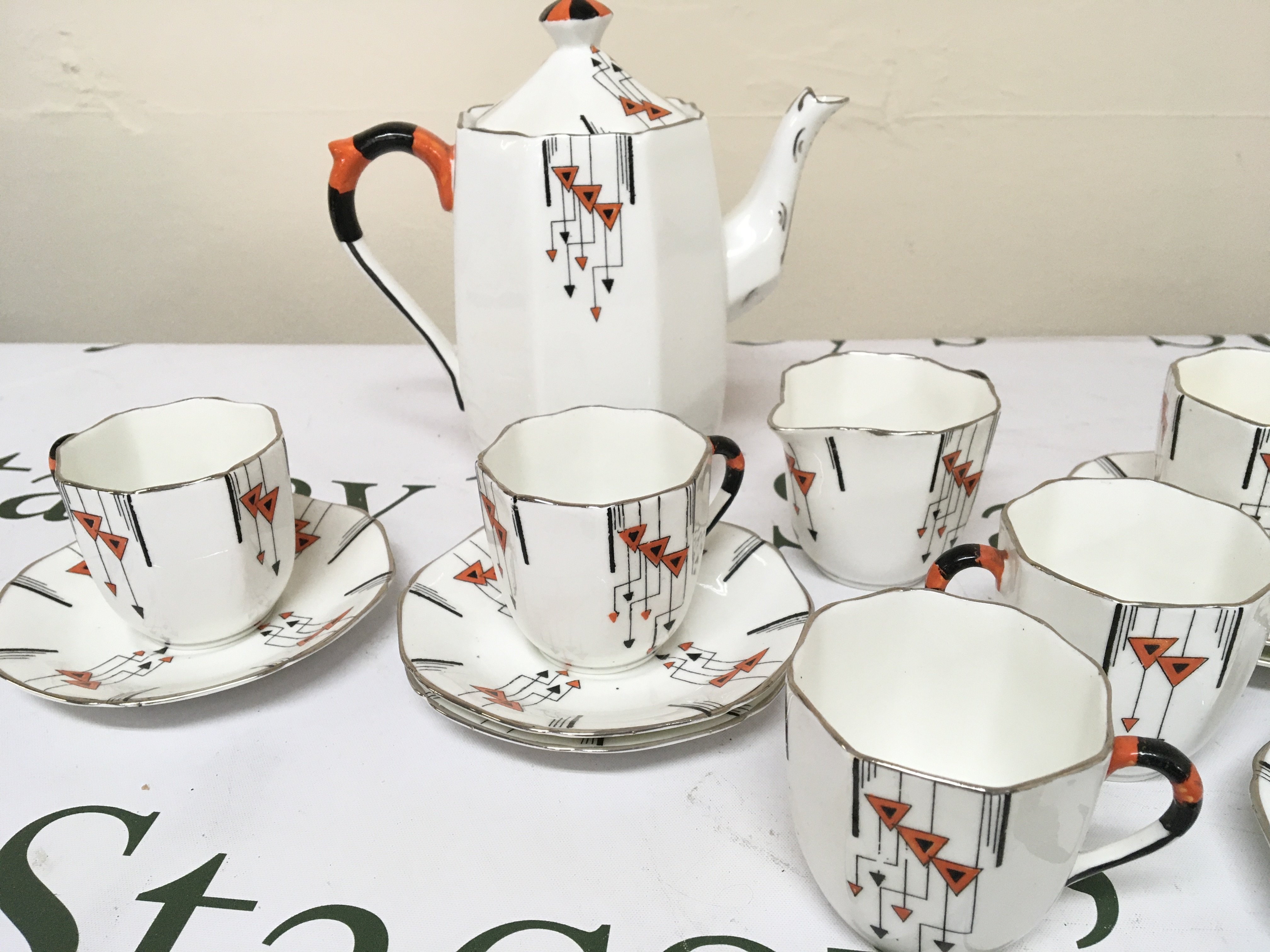 A decorative Art Deco design Sutherland China Coffee set transfer and hand painted pattern six place setting no obvious damage.