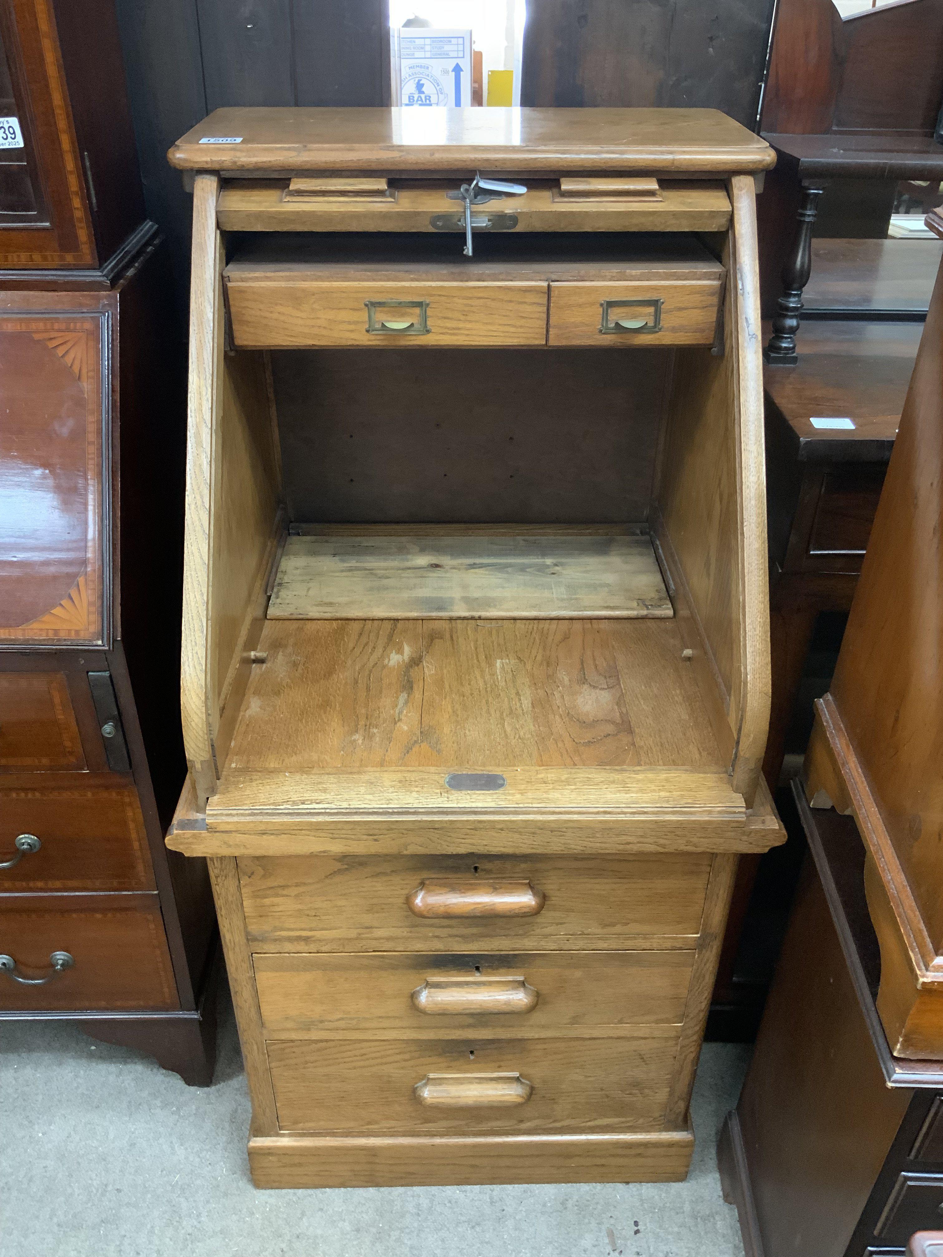A 1930s Lebus Oak Tambour fronted desk. 117cm x 63cm x 58cm