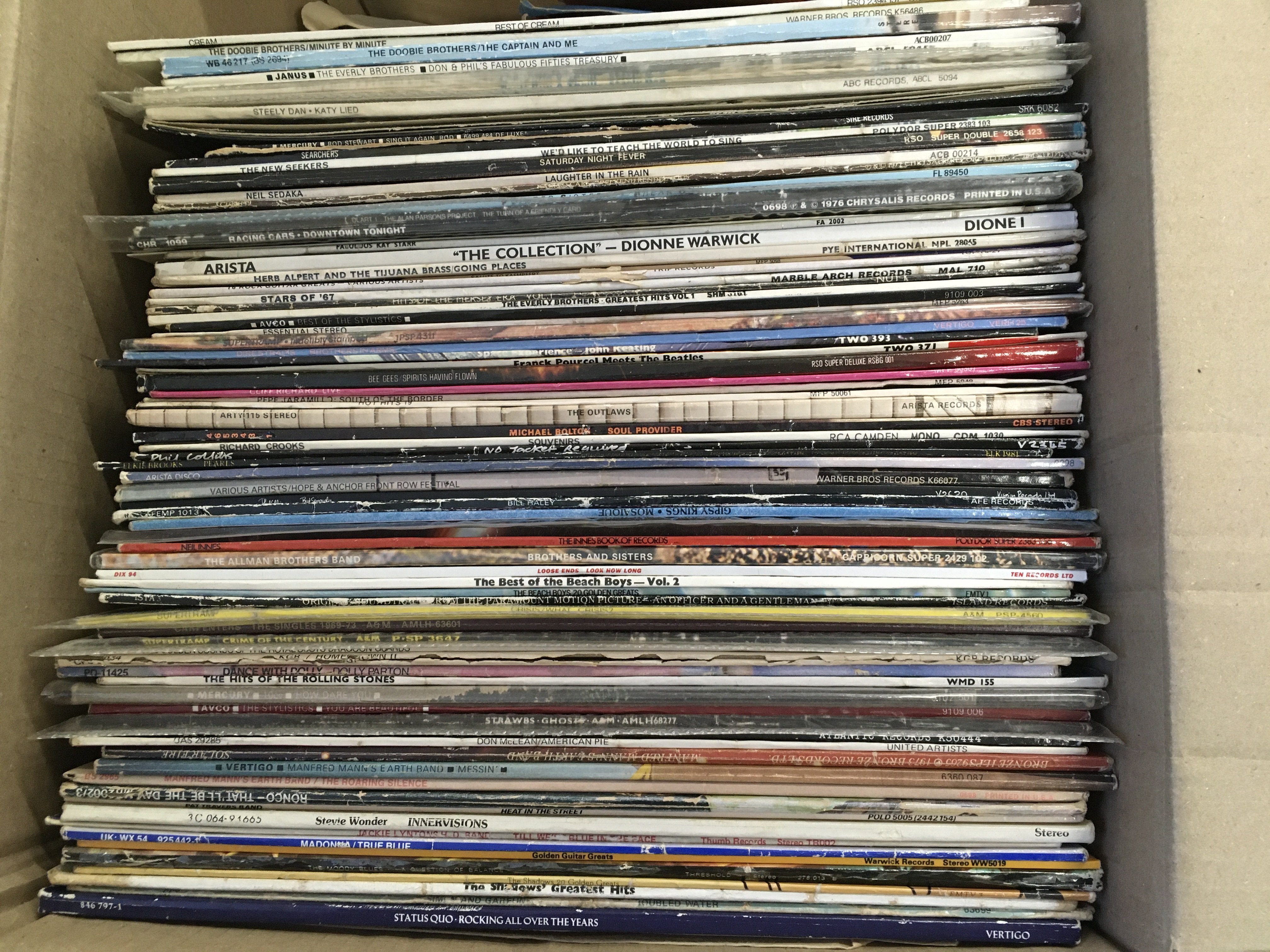 A box of LPs, 12" and 7" singles by various artists including Cream, Steely Dan, Manfred Mann's Earth Band and others.