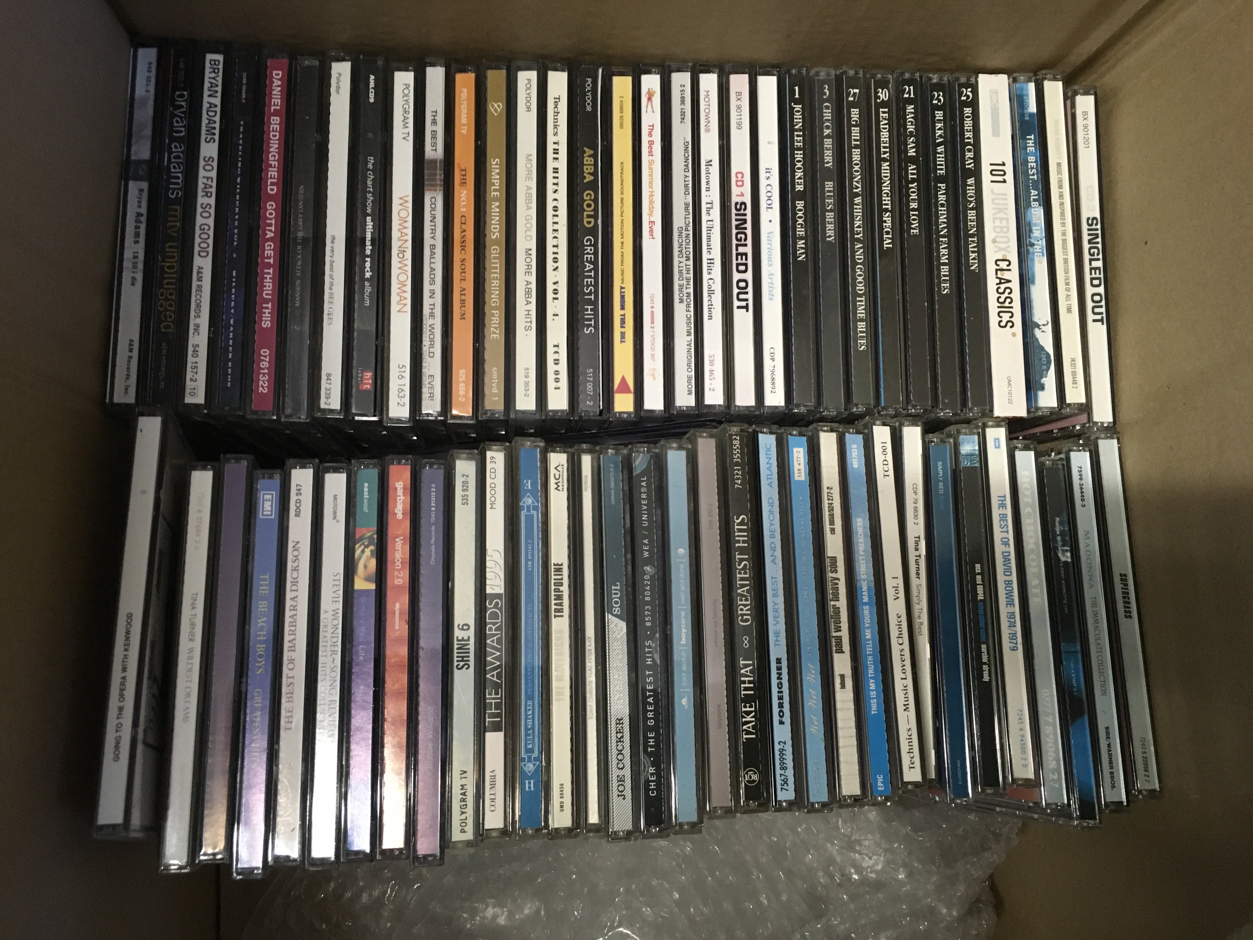 A large box of CDs by various artists including Paul Weller, Supergrass, Led Zeppelin and many more.