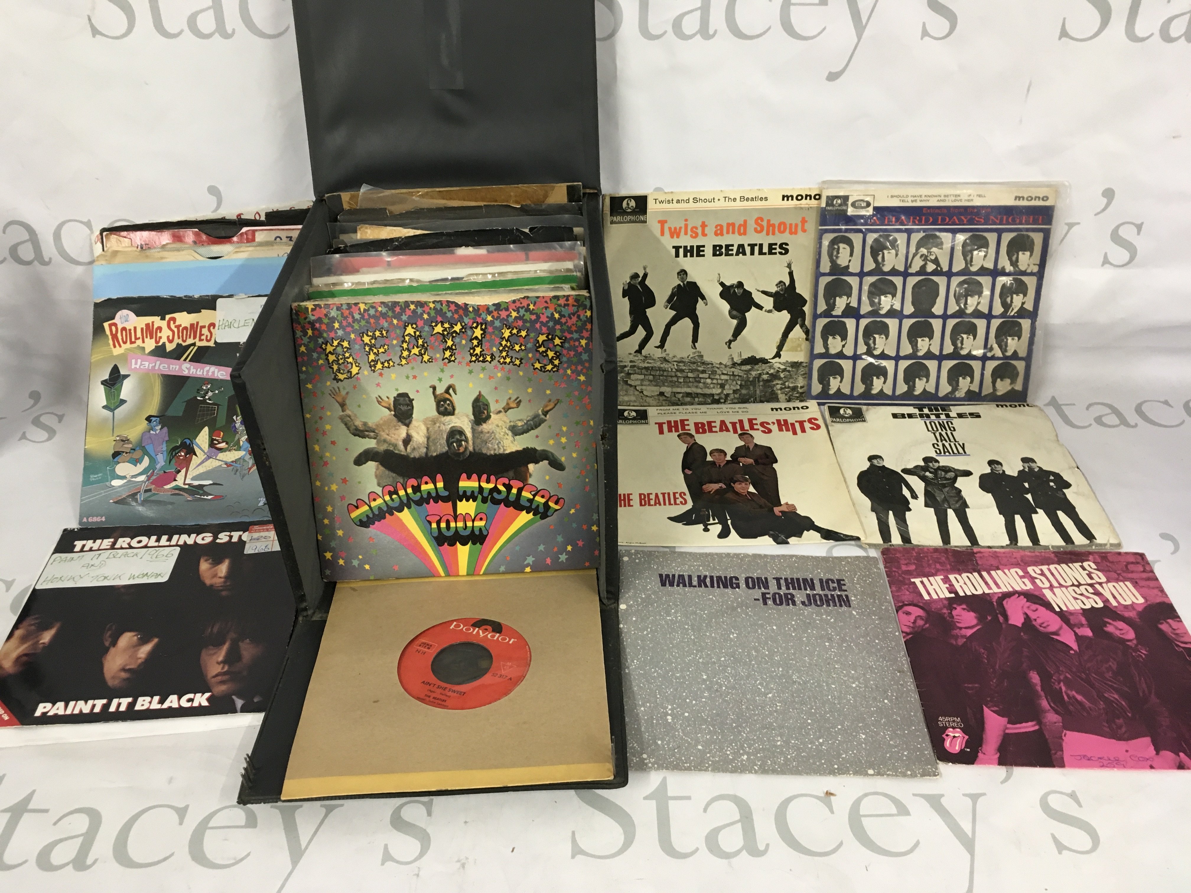 A record case of Beatles, Rolling Stones and related 7" singles and EPs.