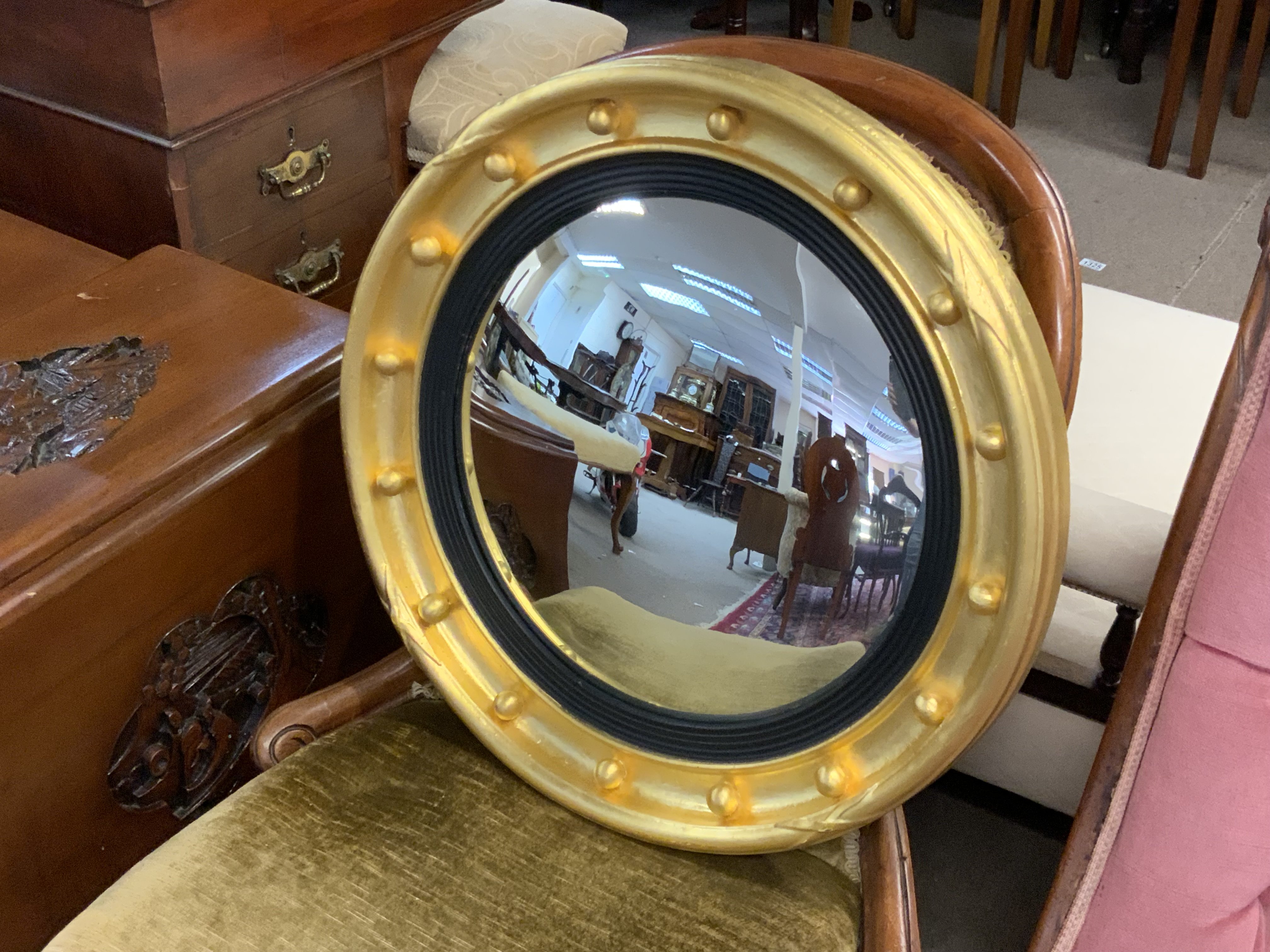 A gilt framed convex wall mirror together with a regency mahogany veneered wall mirror.
