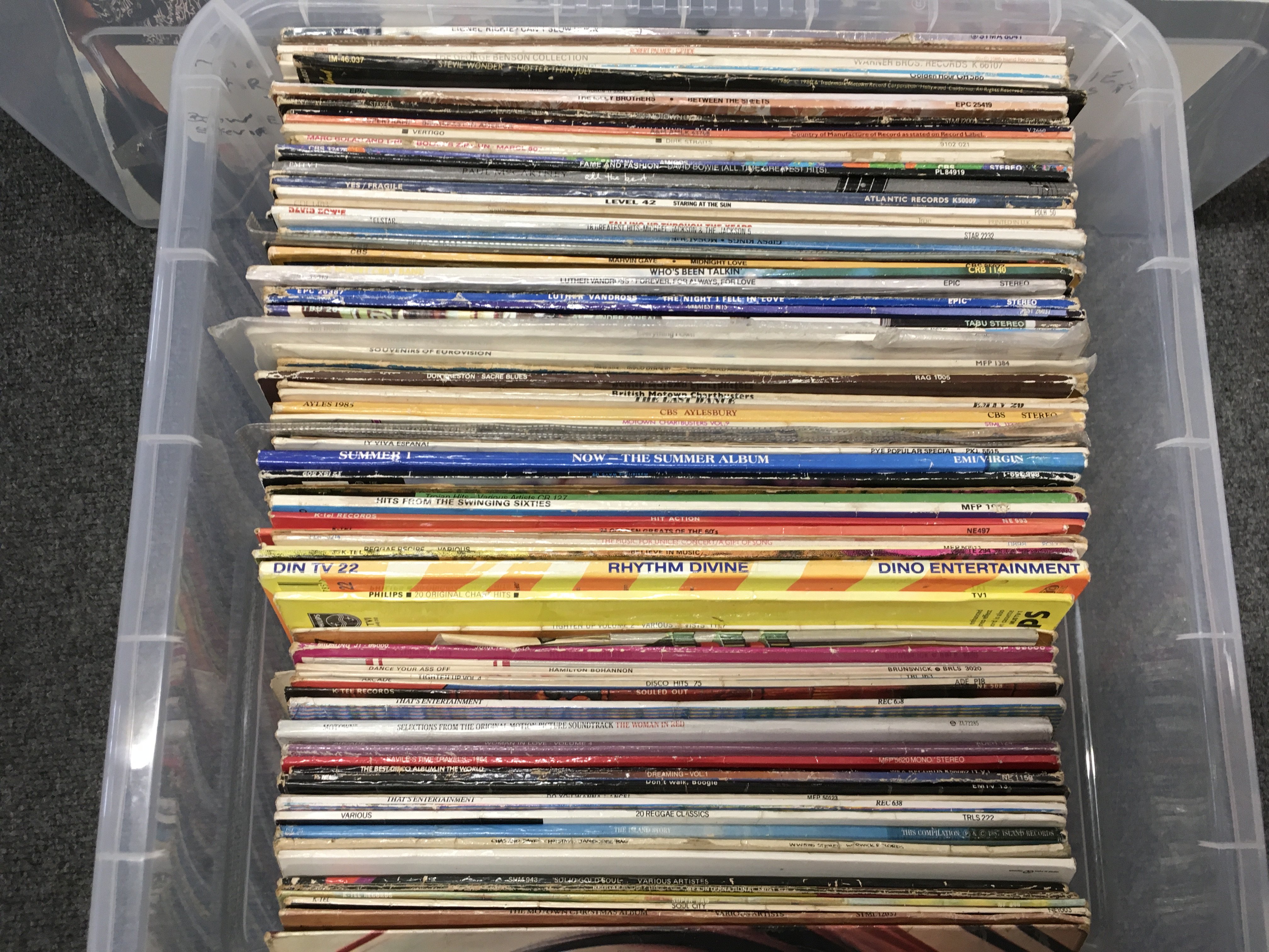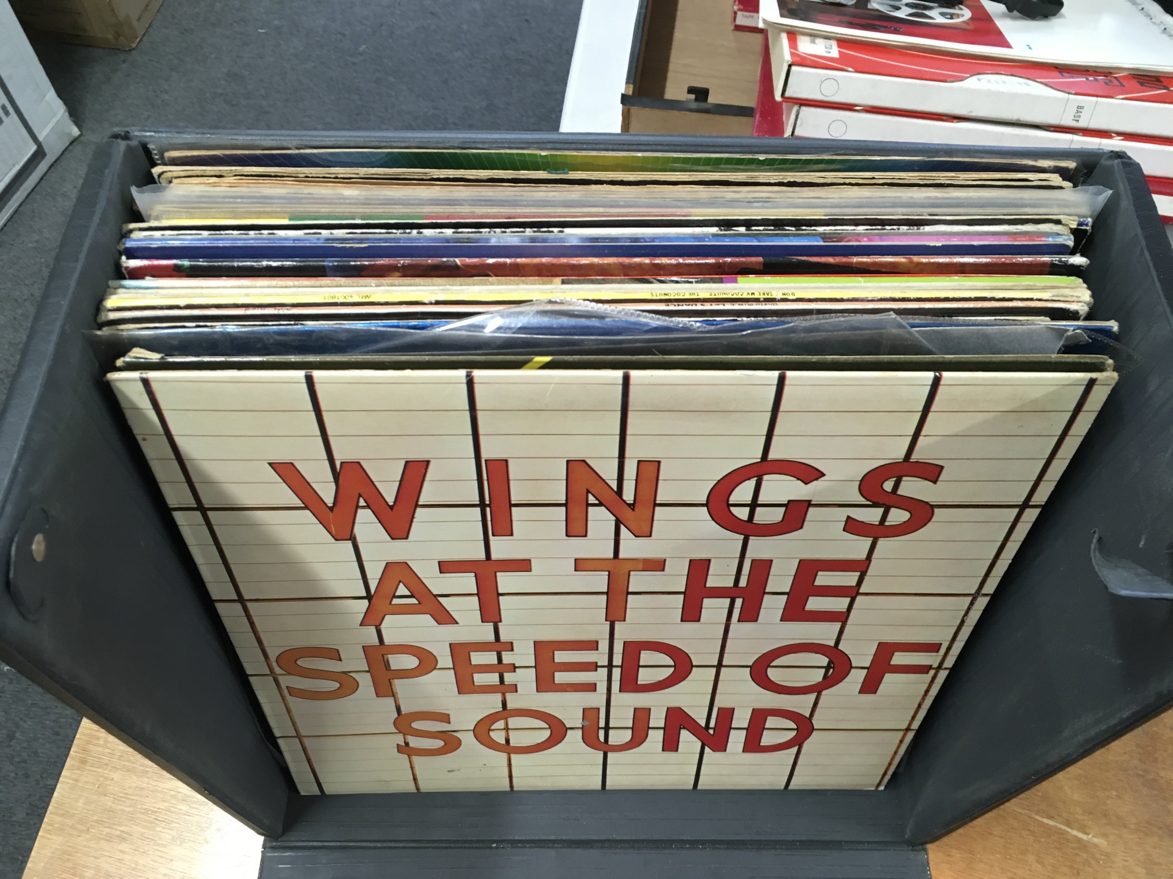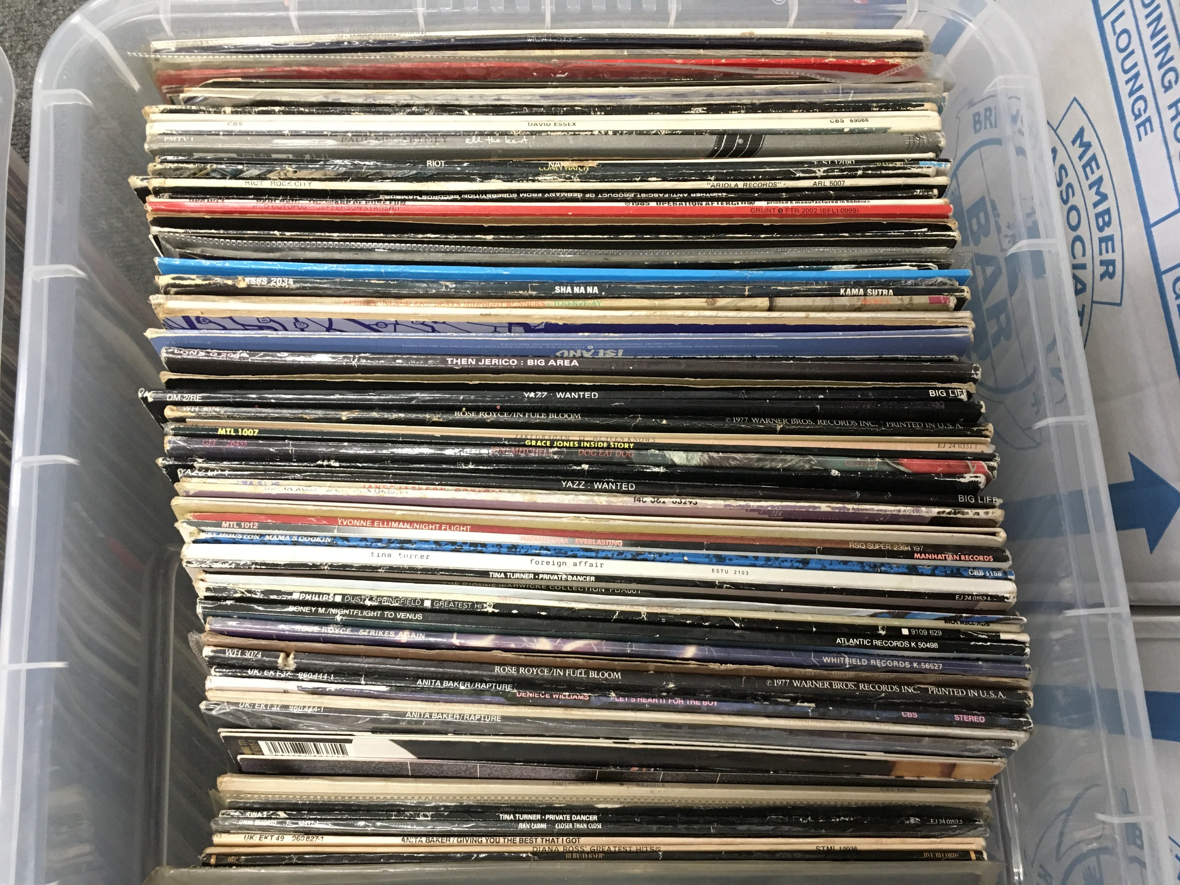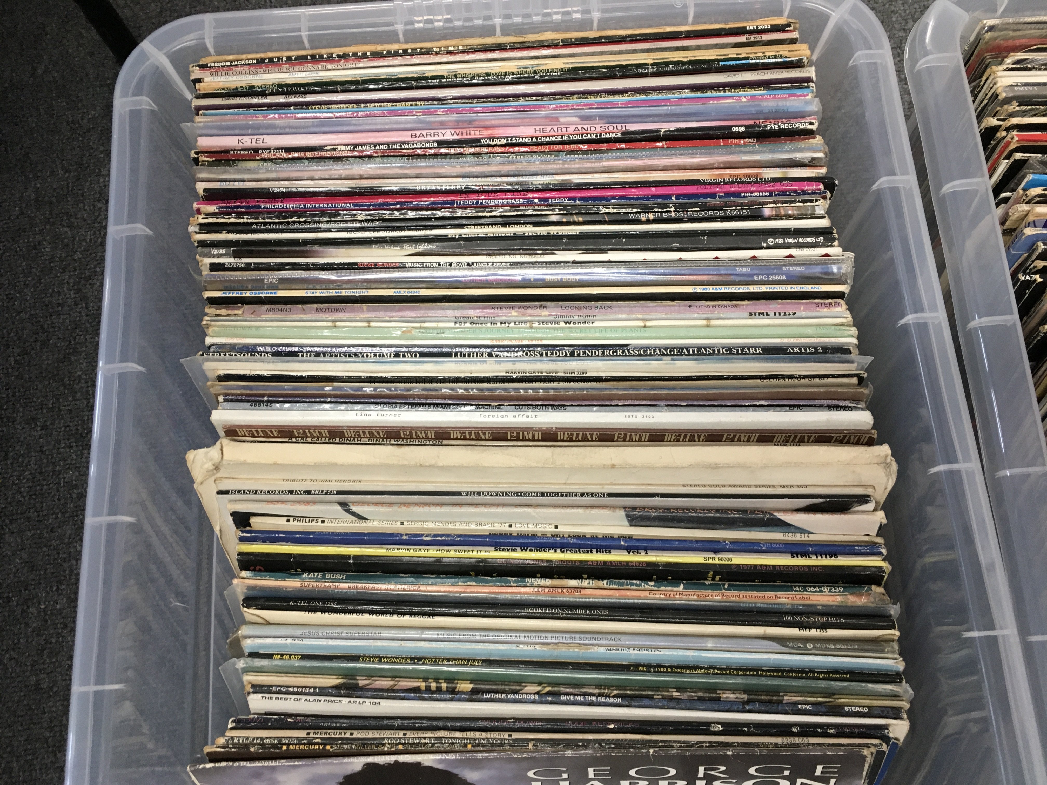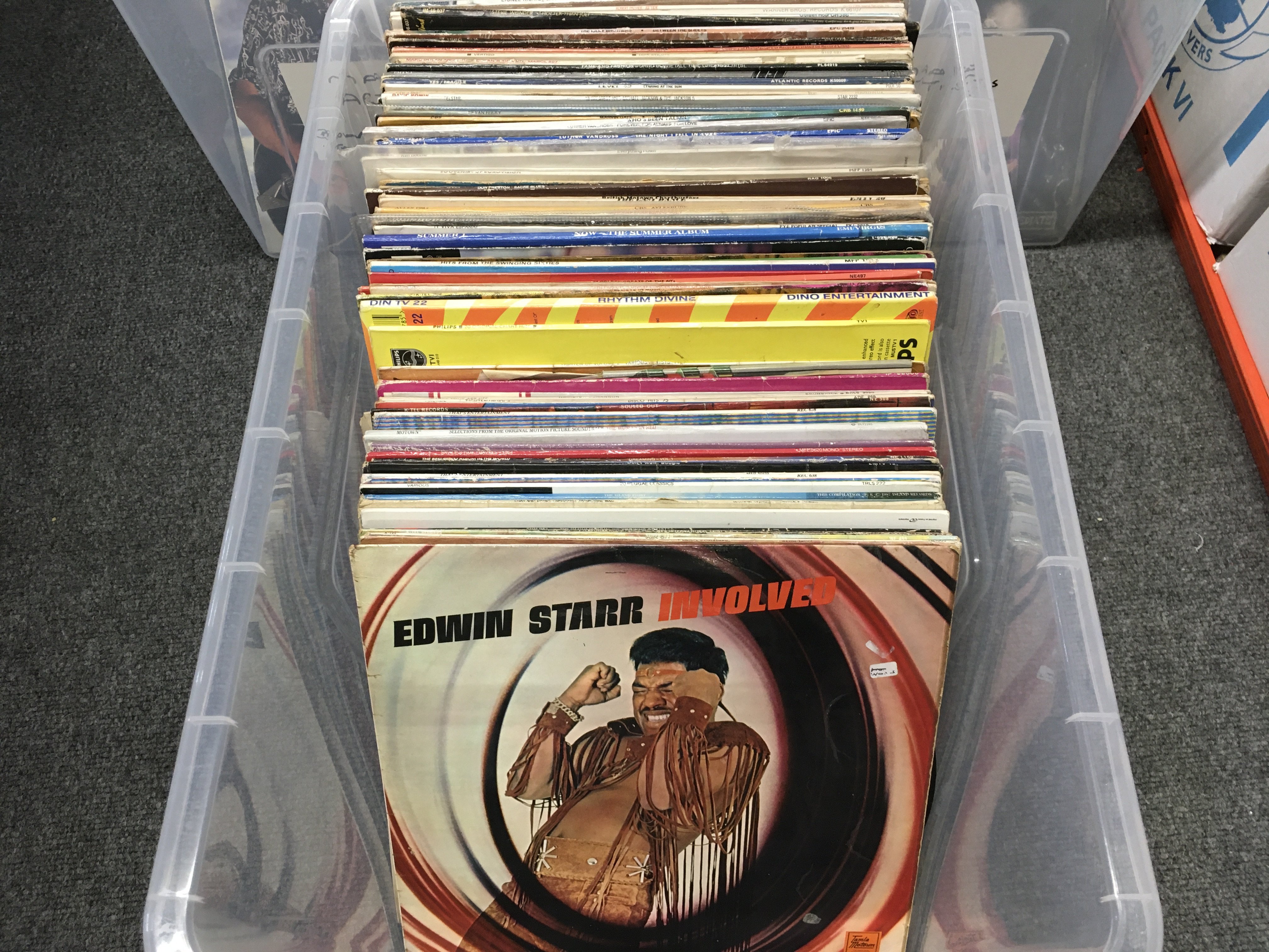 Three boxes of LPs and 12" singles by various artists including Paul McCartney, Kate Bush, Teddy Pendergrass and others plus a record case of album and 12" record sleeves.