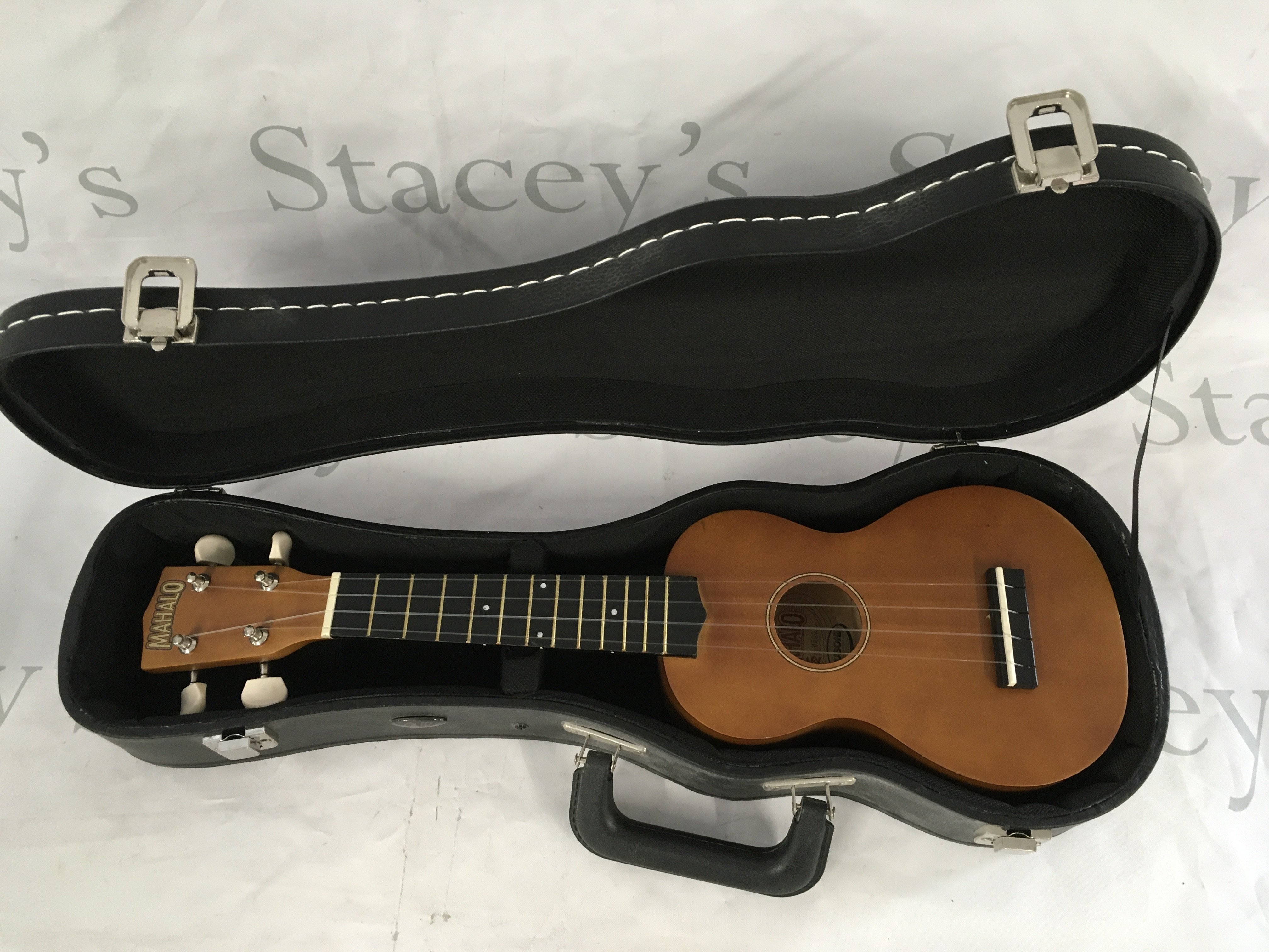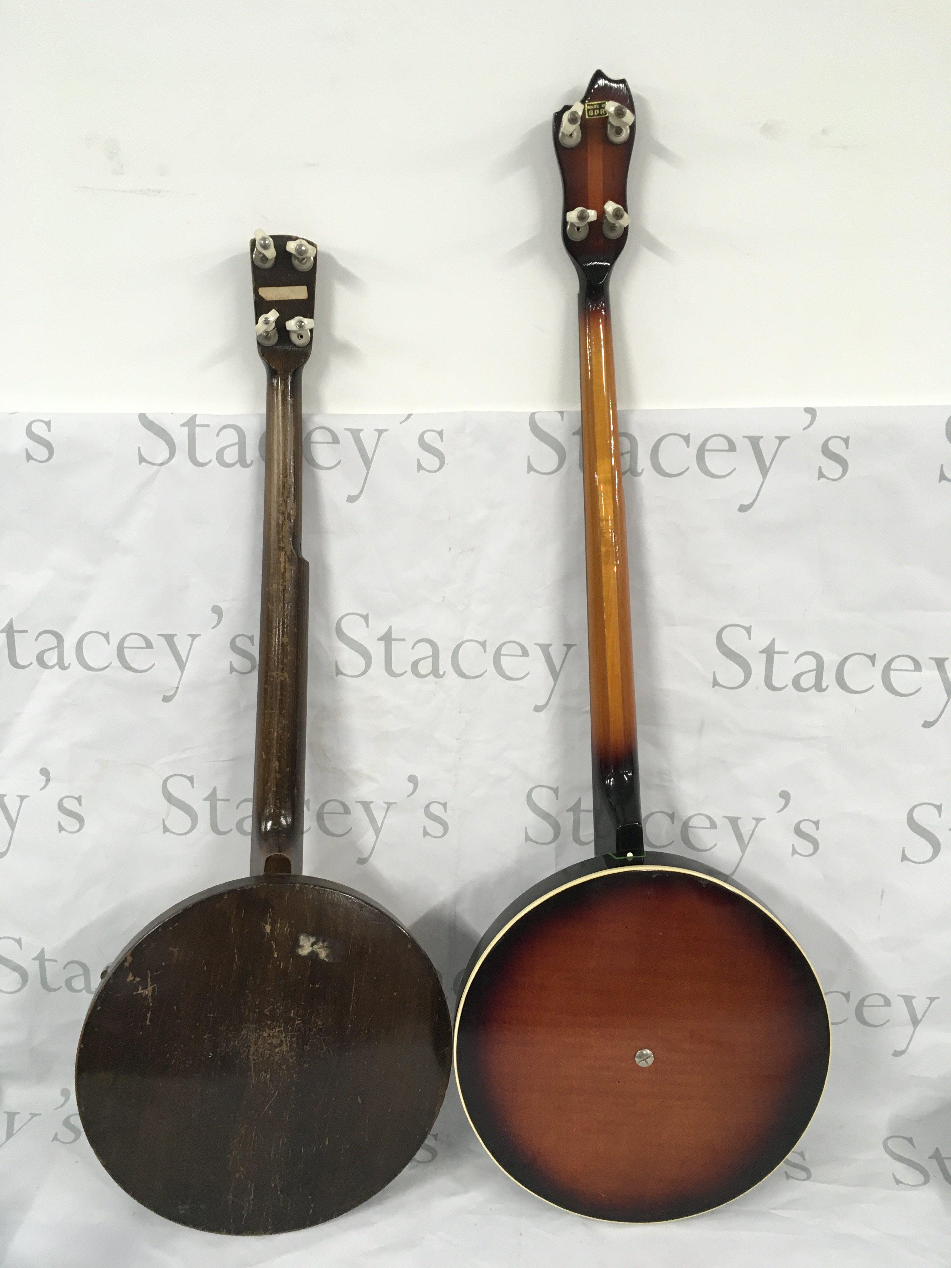 Two banjos with soft carry cases and a soprano ukulele with a hard carry case (3).