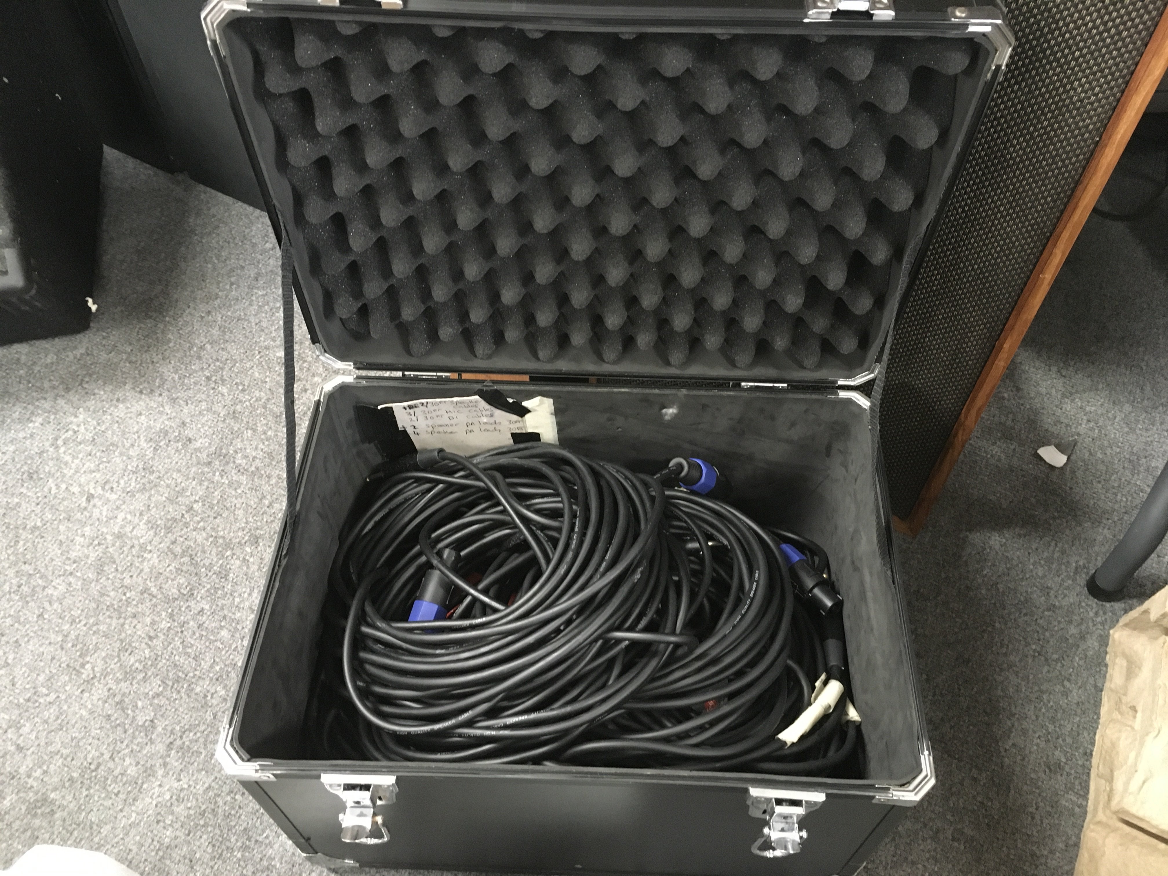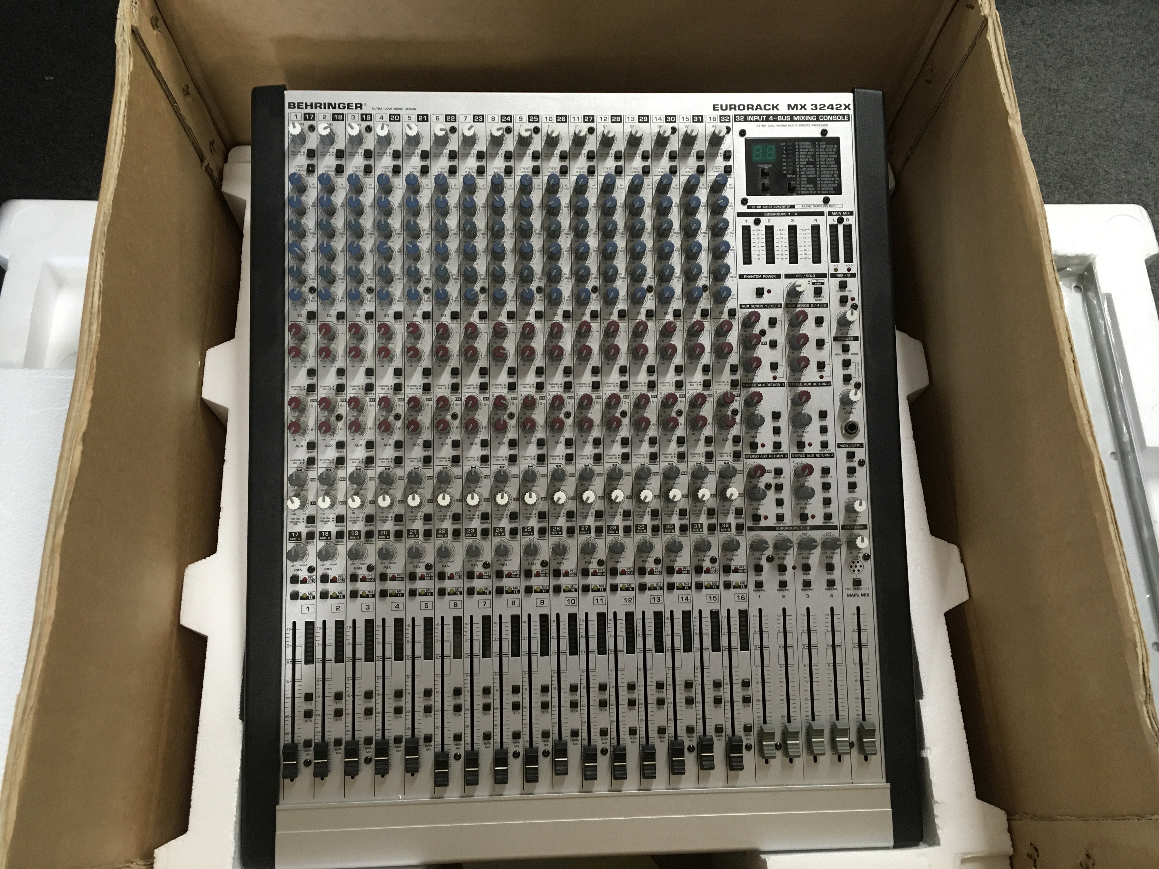 A collection of PA system equipment comprising a boxed Behringer Eurorack MX3242X 32 input mixing console, a pair of boxed Intimidation AKA 215 MKII speakers, two wedge monitors and stands.