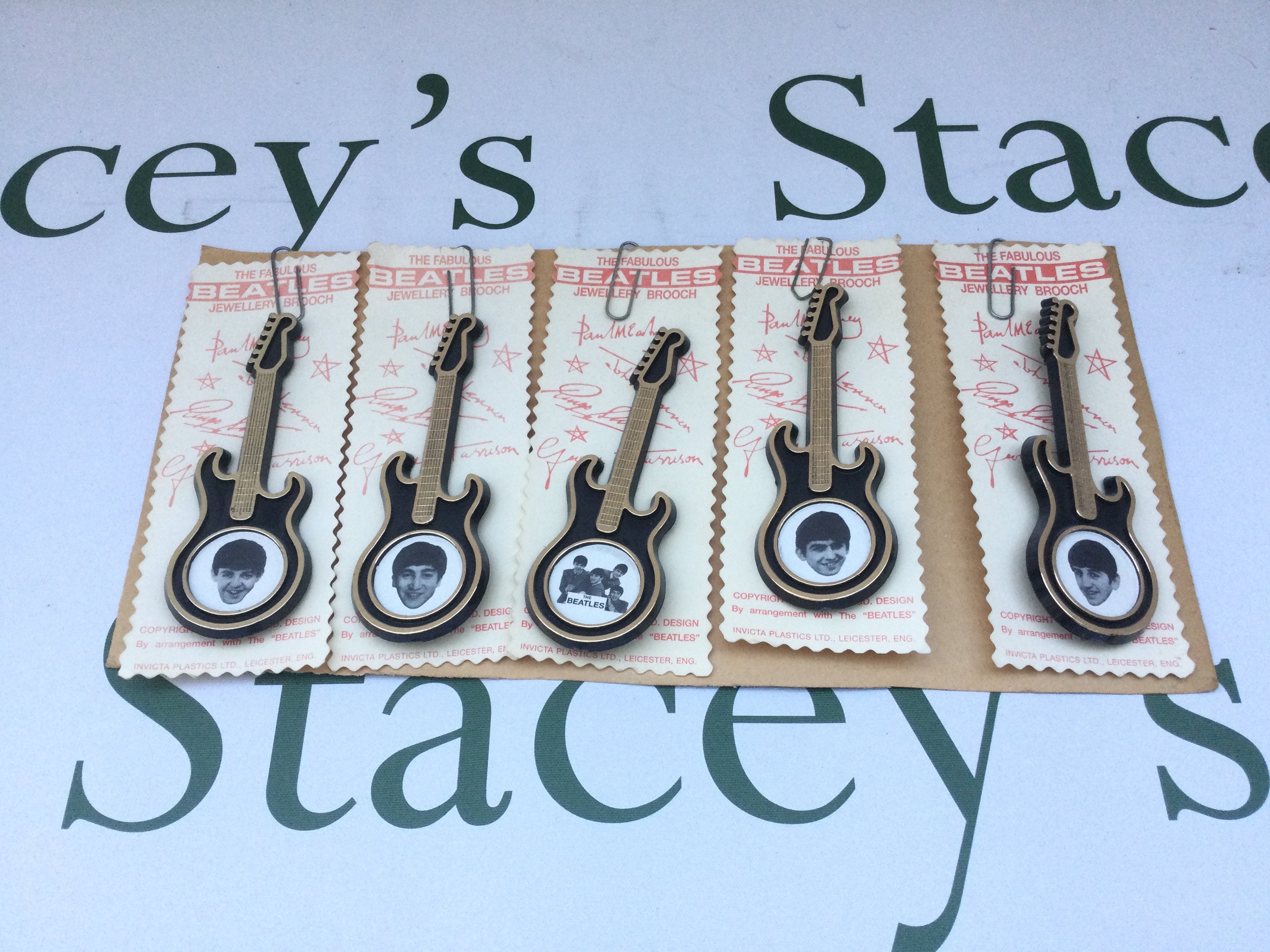 A full set of reproduction Beatles guitar shaped brooches by Invicta Plastics Ltd.