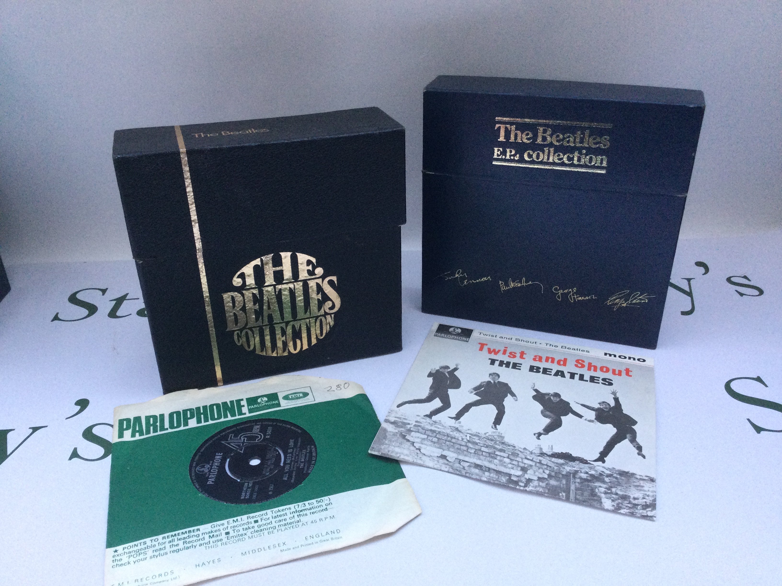 A Beatles boxed EP collection on vinyl plus a Beatles boxed 7" singles collection sadly incomplete, missing Love Me Do and All You Need Is Love is an earlier pressing (2).
