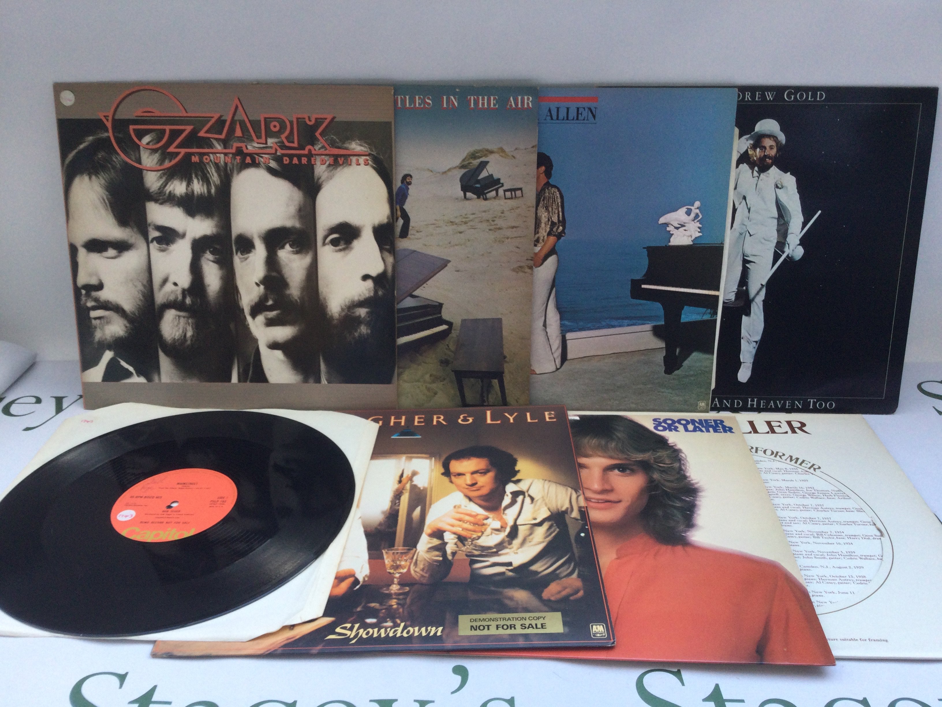 Two bags containing 22 promo copy LPs and 12" singles by various artists including Bruce Springsteen, Loggins & Messina, Carole King and others.