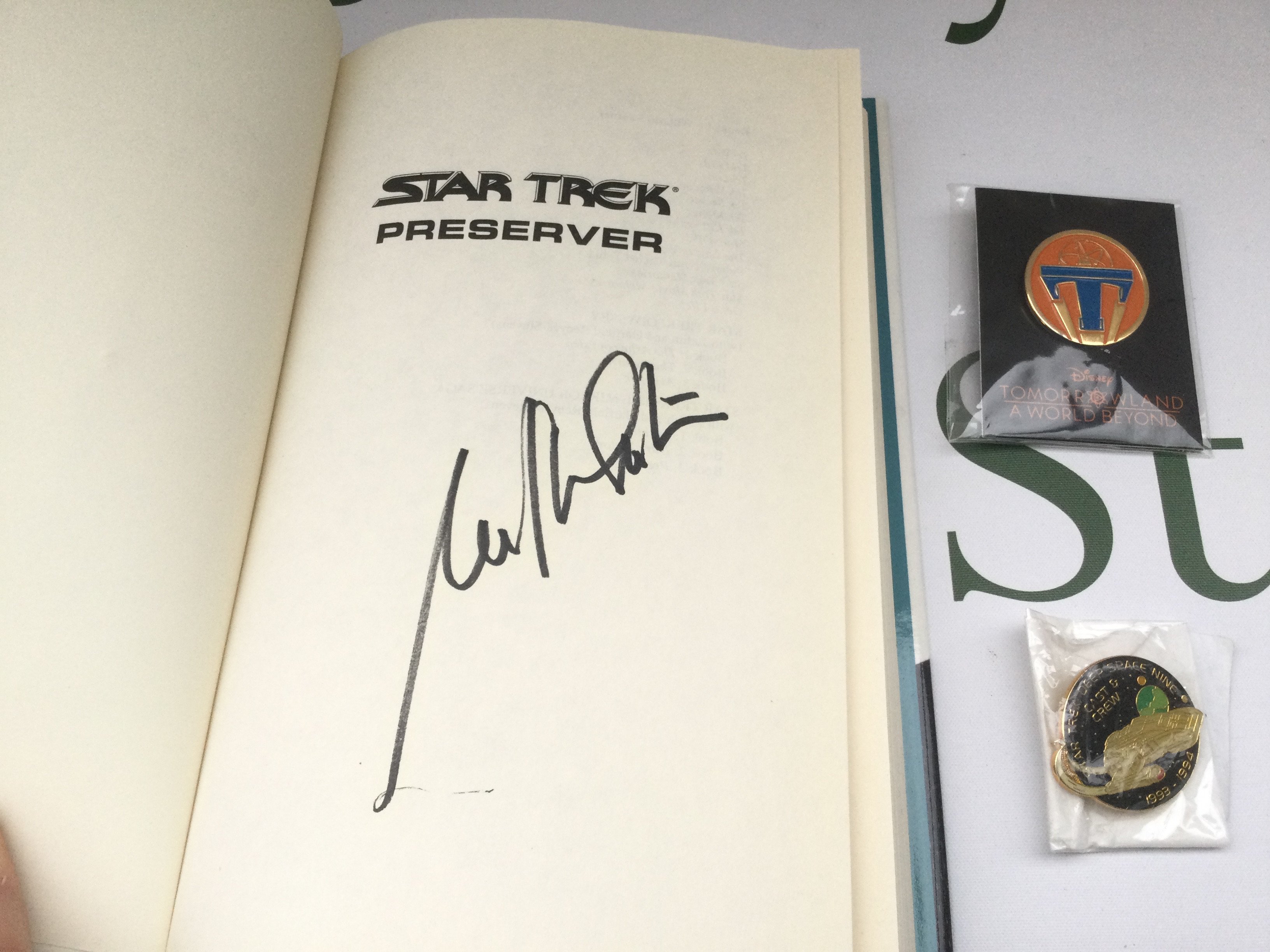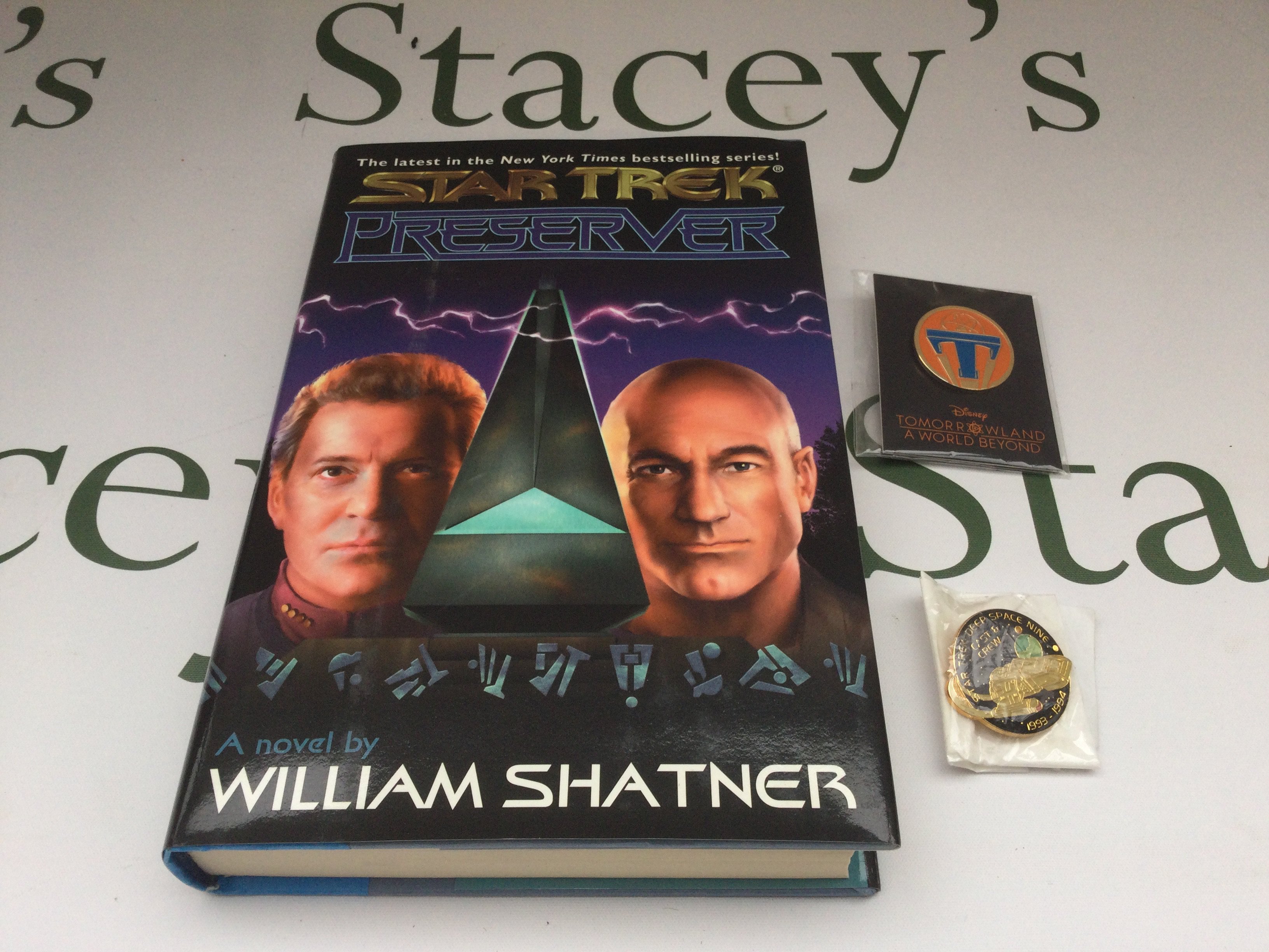 A William Shatner signed Star Trek hardback novel 'Preserver' plus two metal badges.