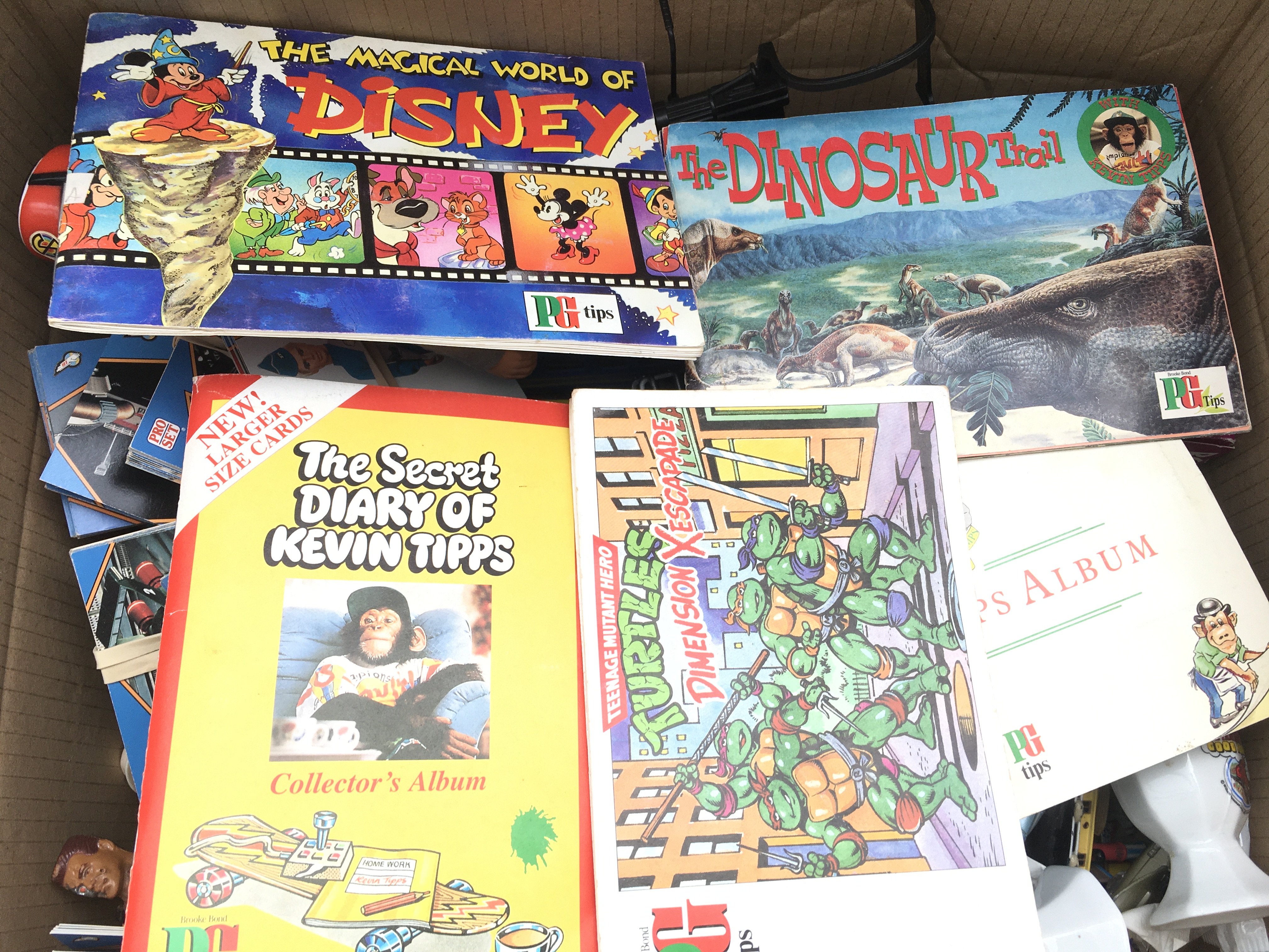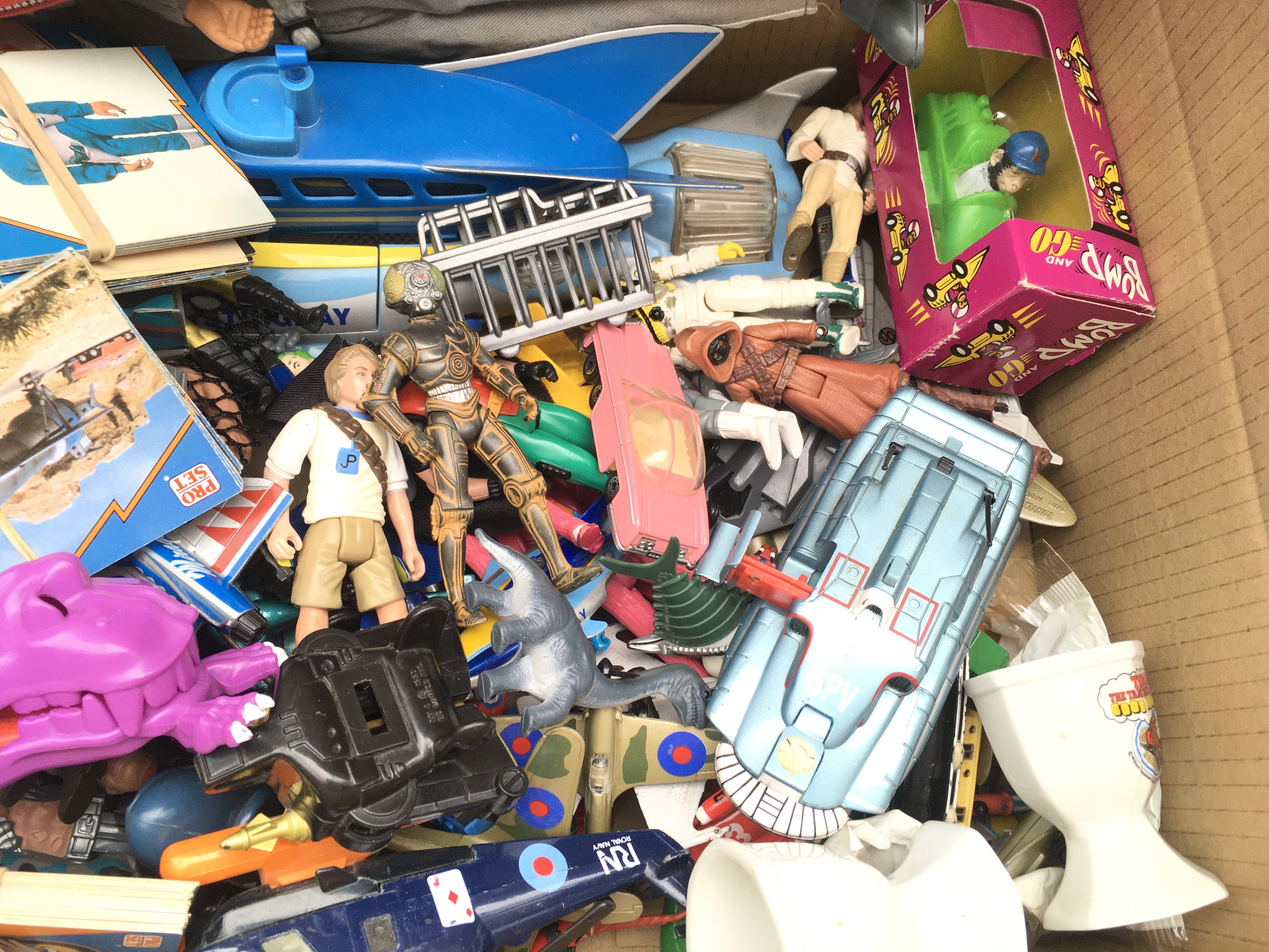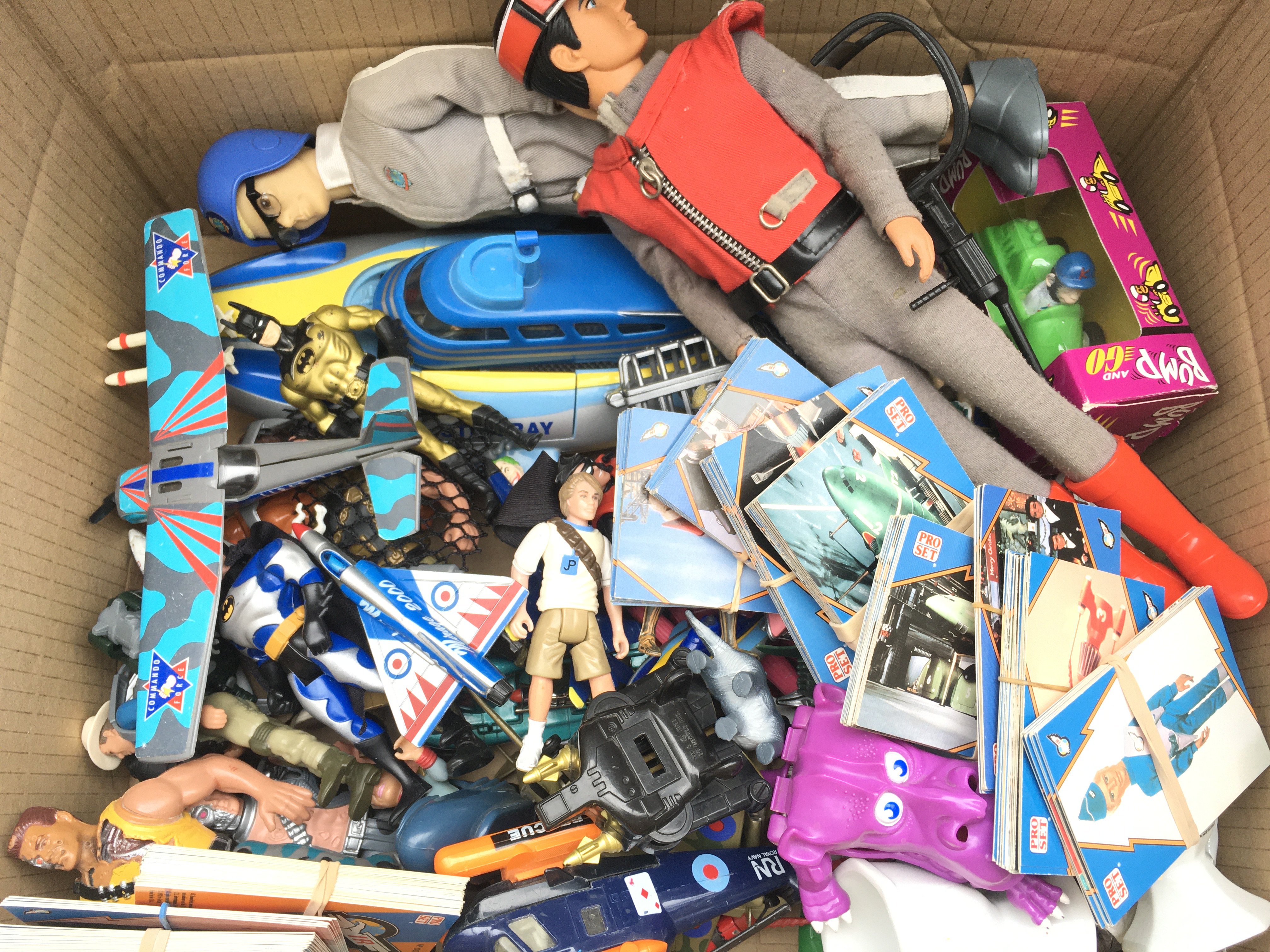 A Box Containing Various Toys And Collectors Cards. including Thunderbirds. Jurassic Park. Star Wars. Etc. No Reserve.
