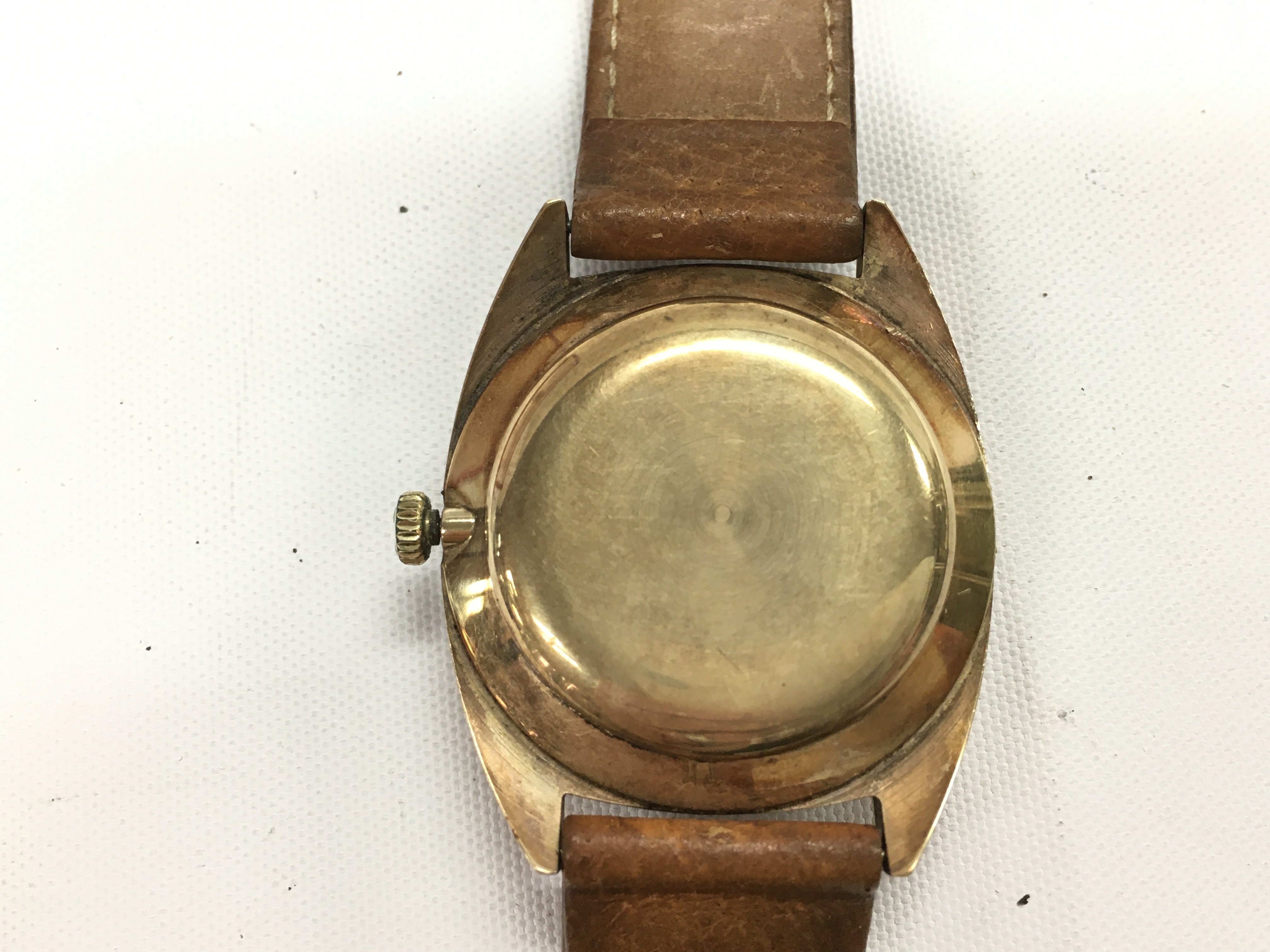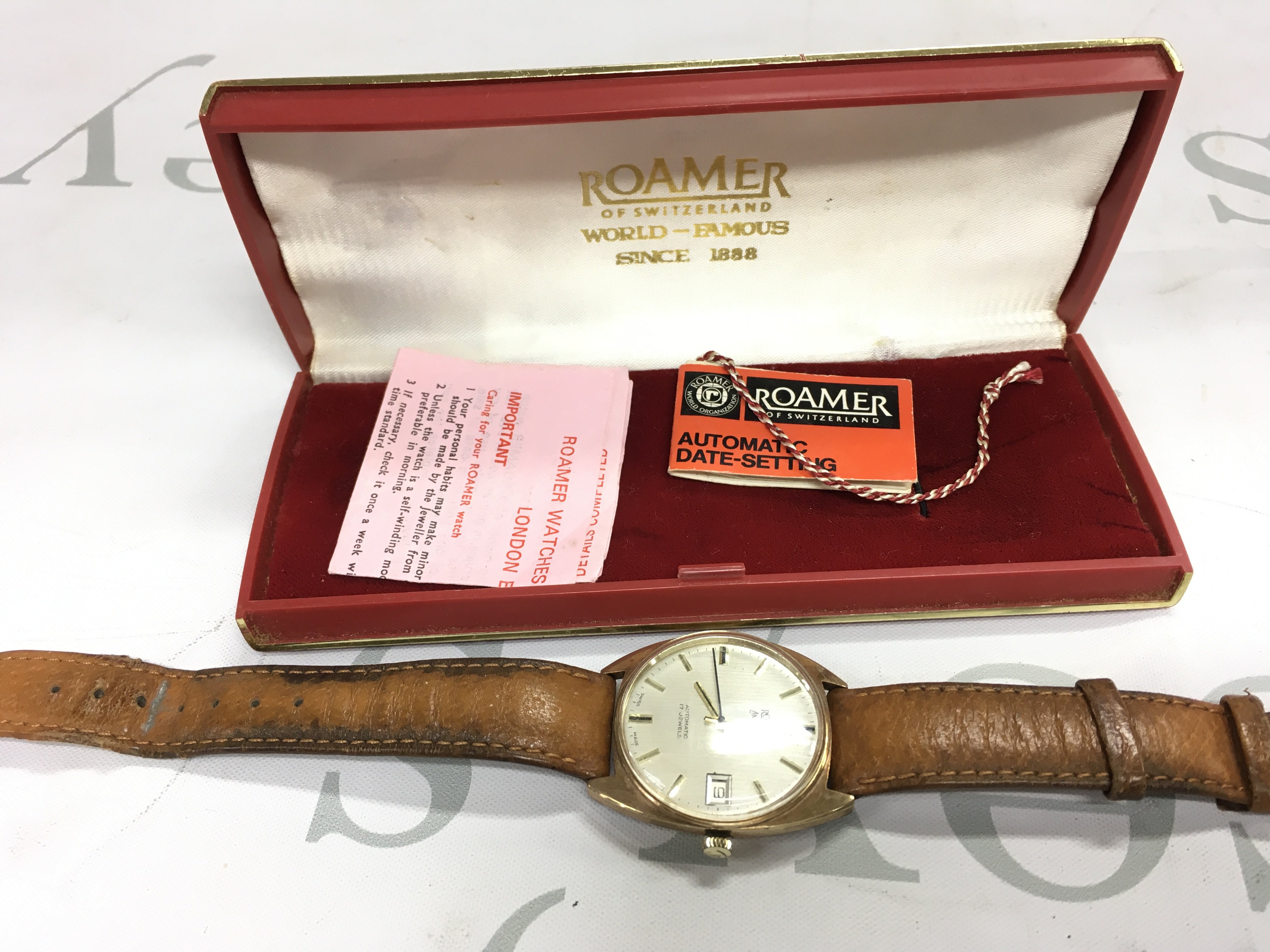 A vintage 9ct cased Roamer on a leather strap with box and tag. Postage B