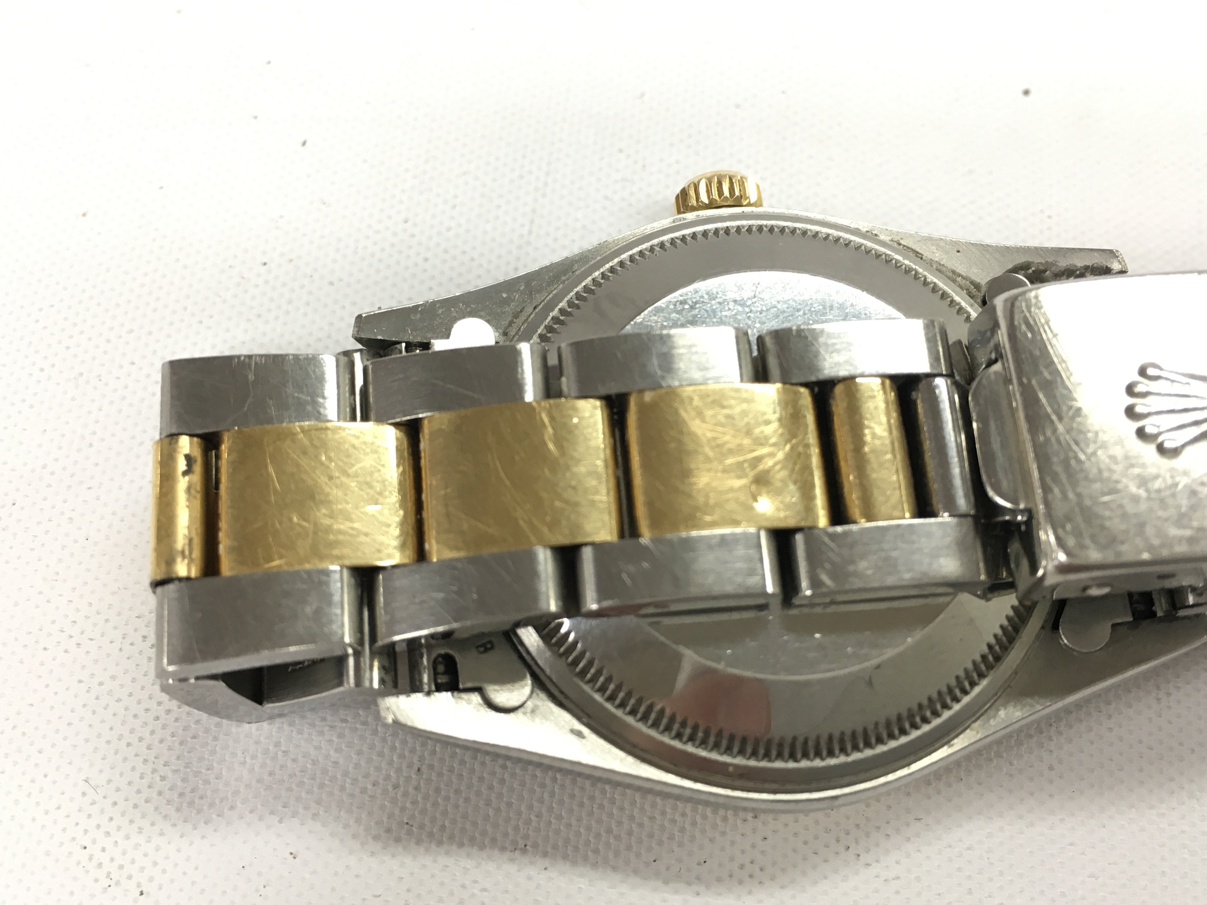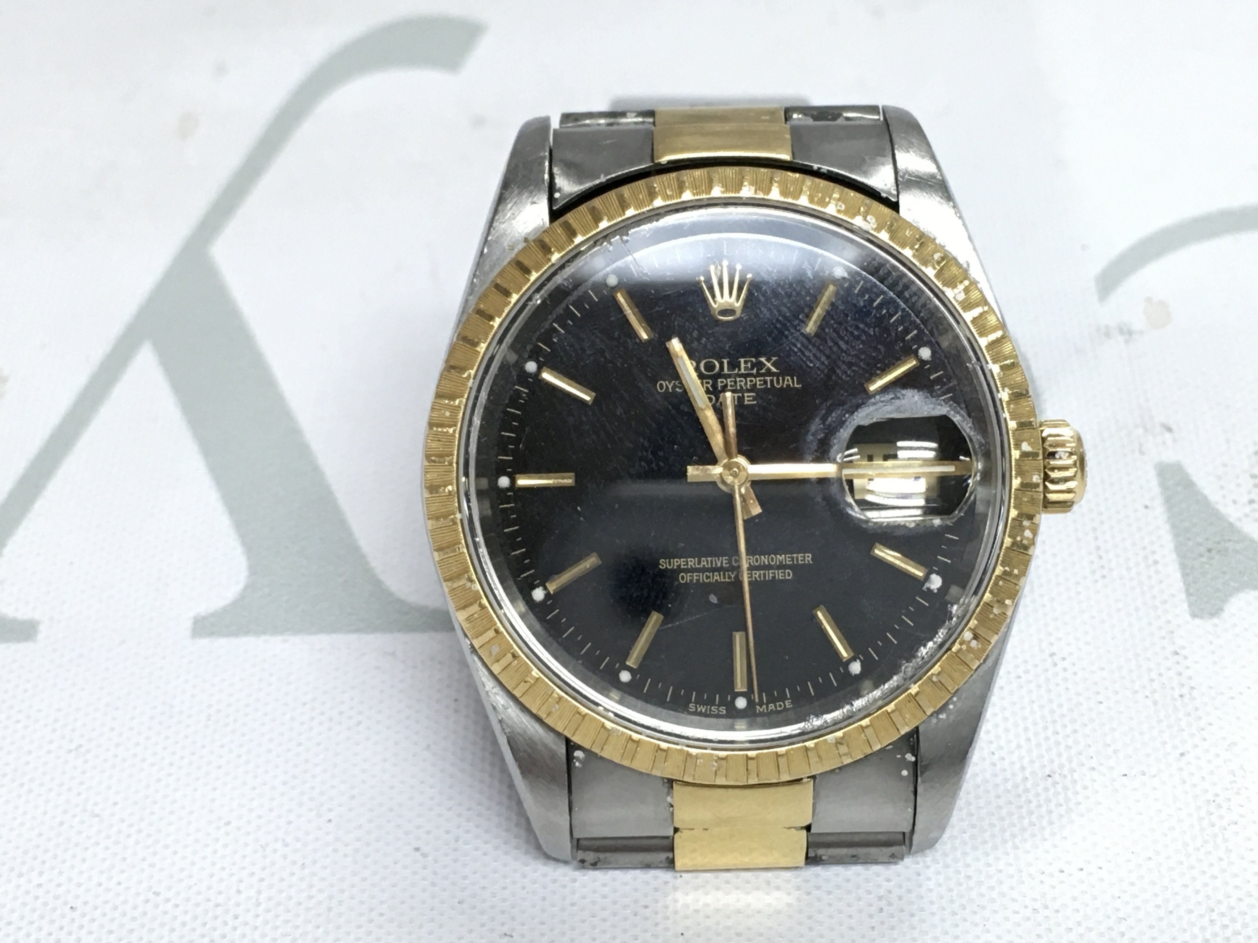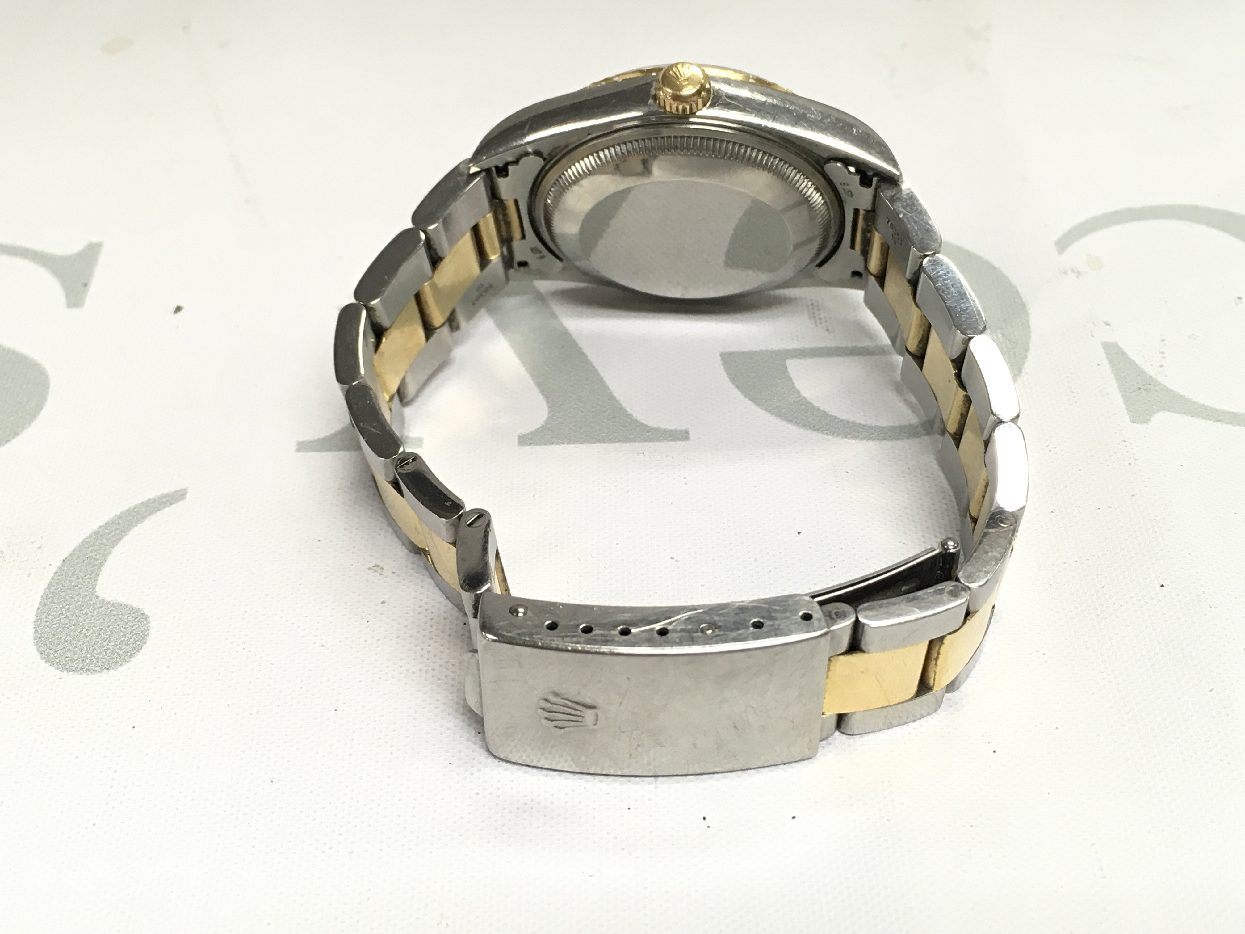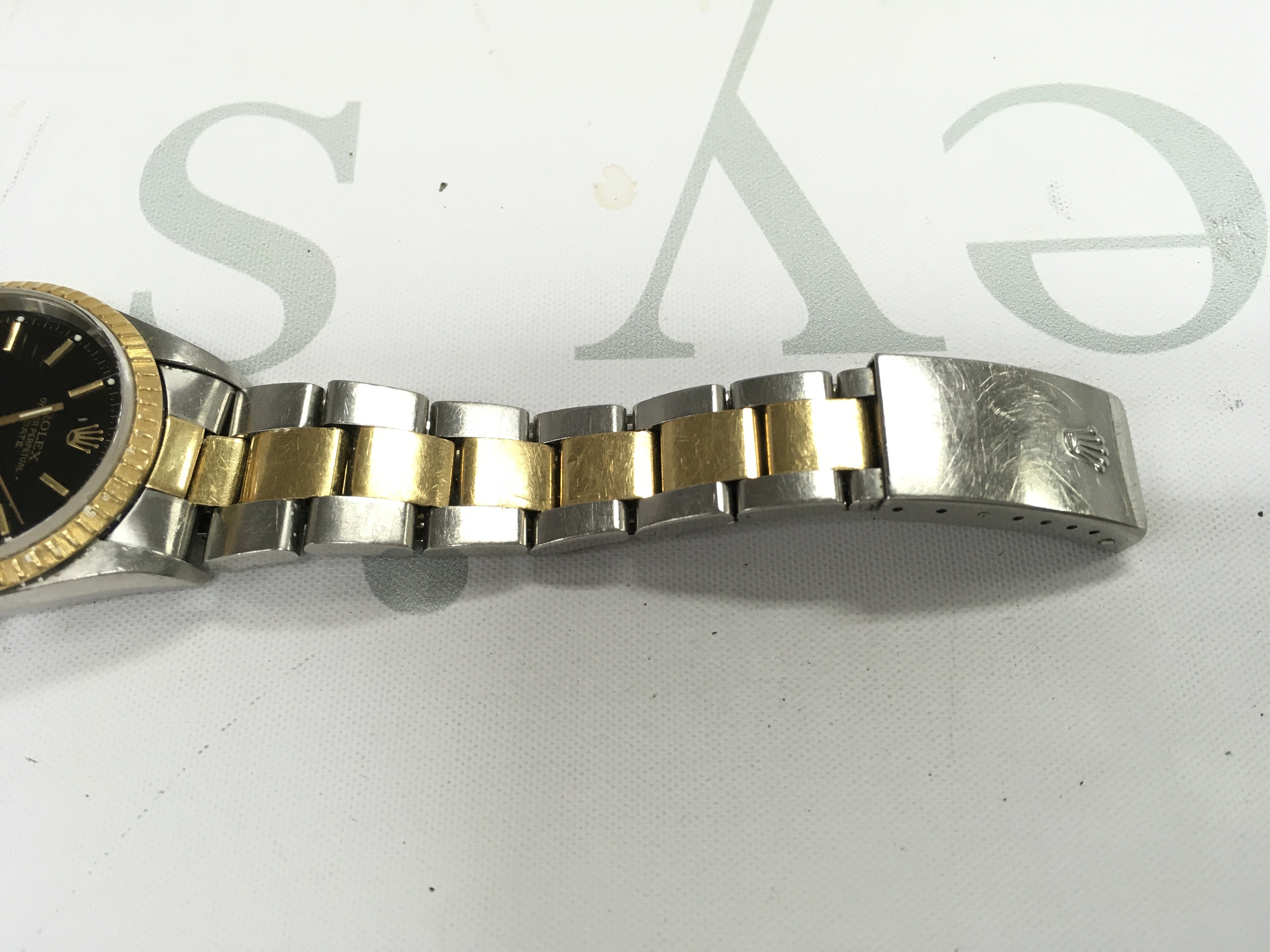 A Rolex oyster perpetual date. Gold and steel two tone watch. Black dial. Case Approx 36mm. Seen running. Watch would benefit from clean and service.