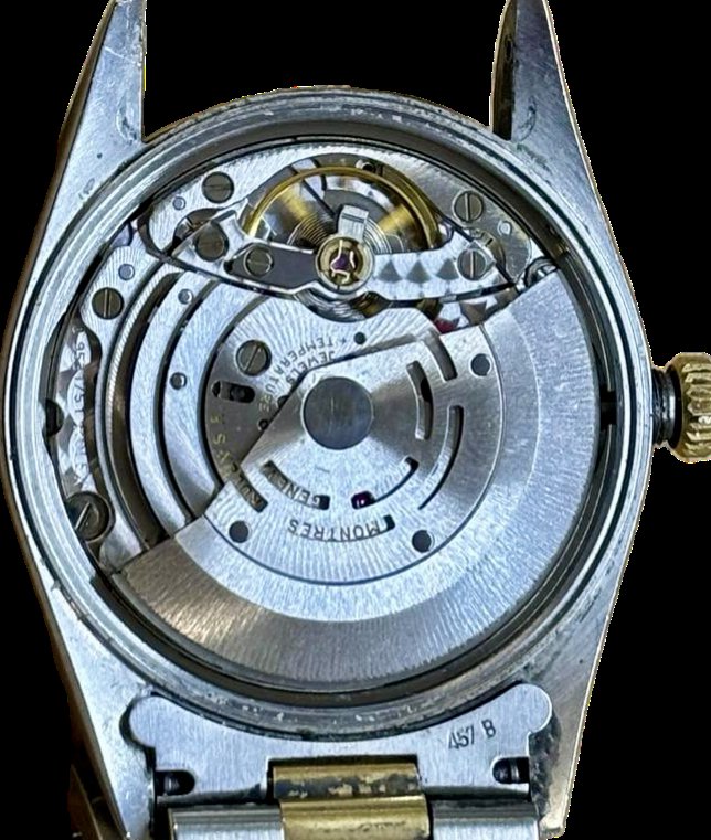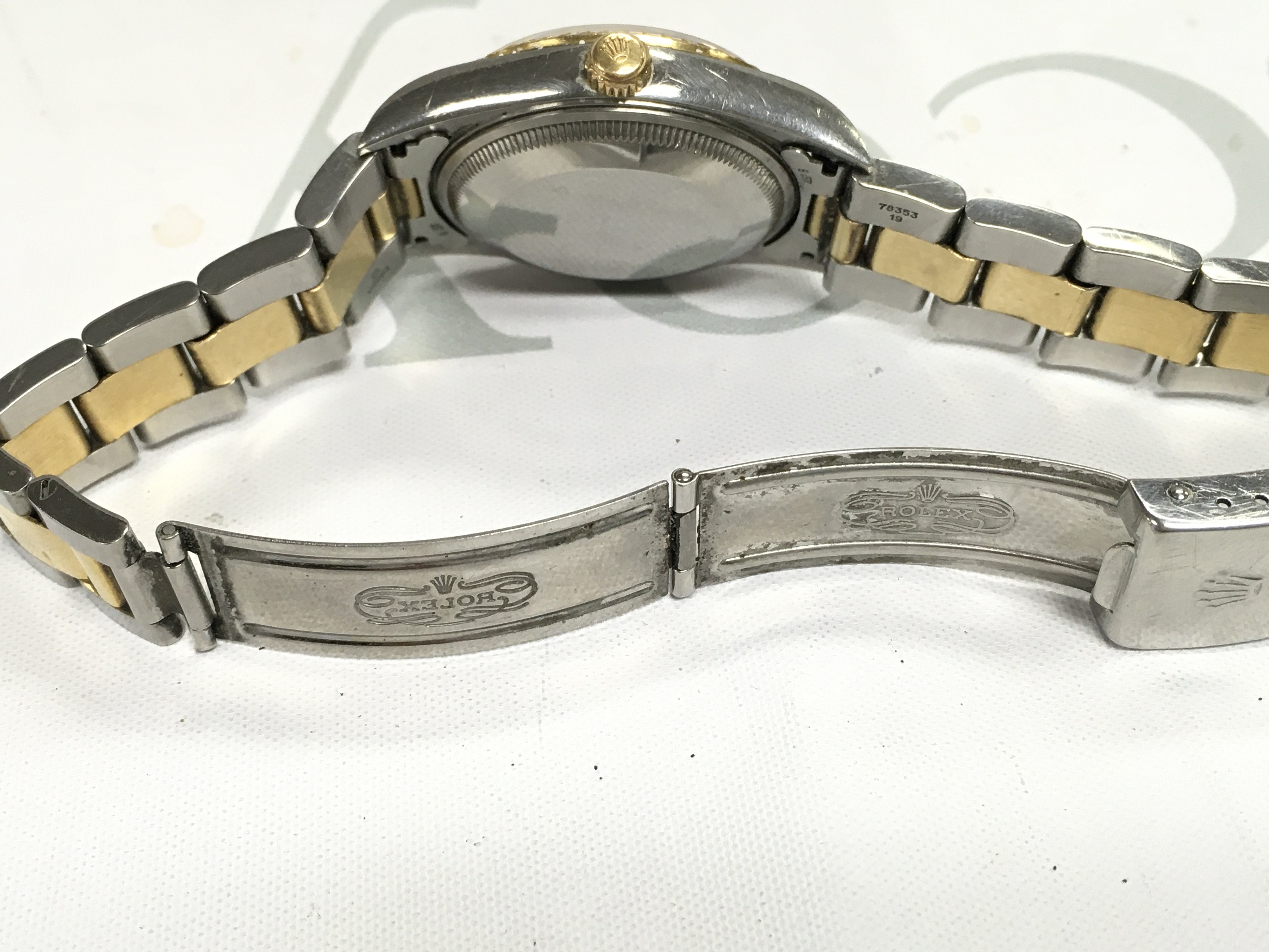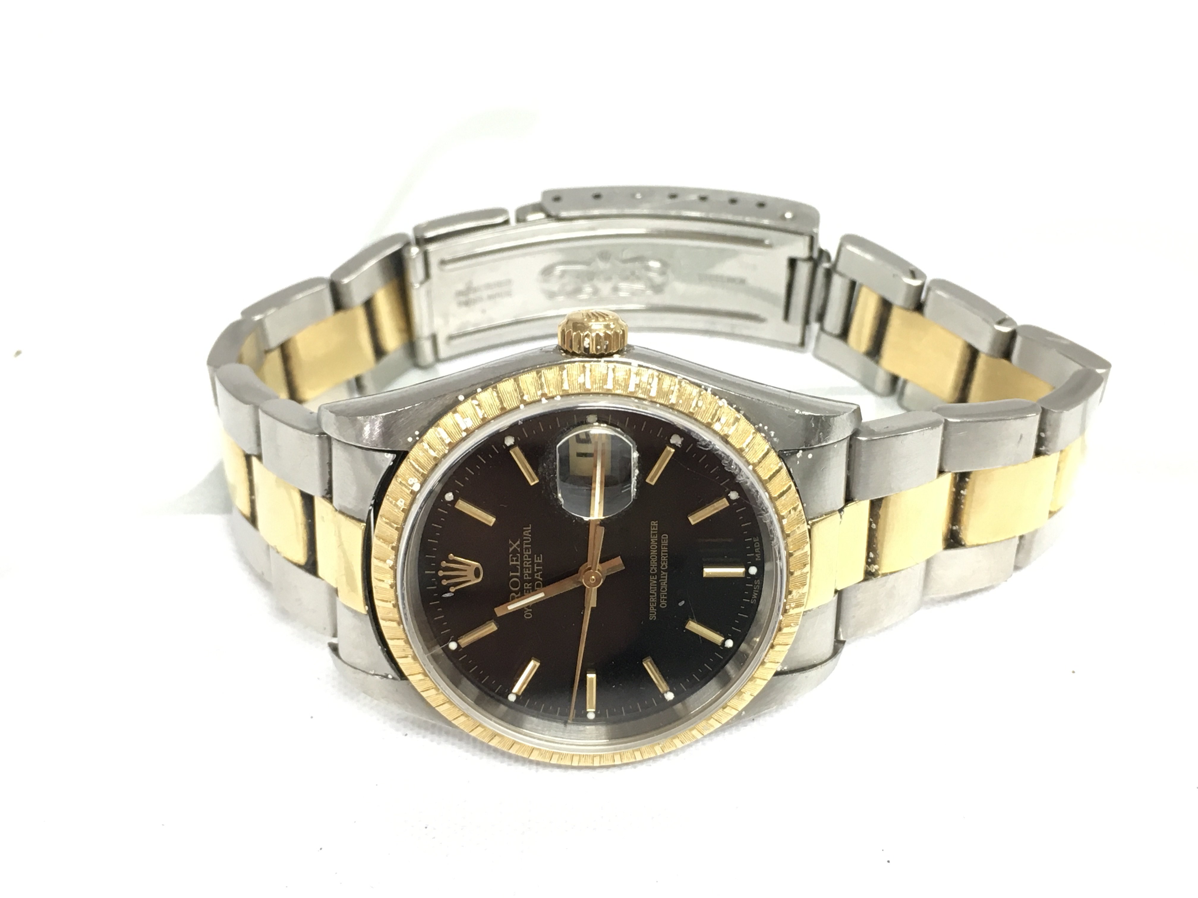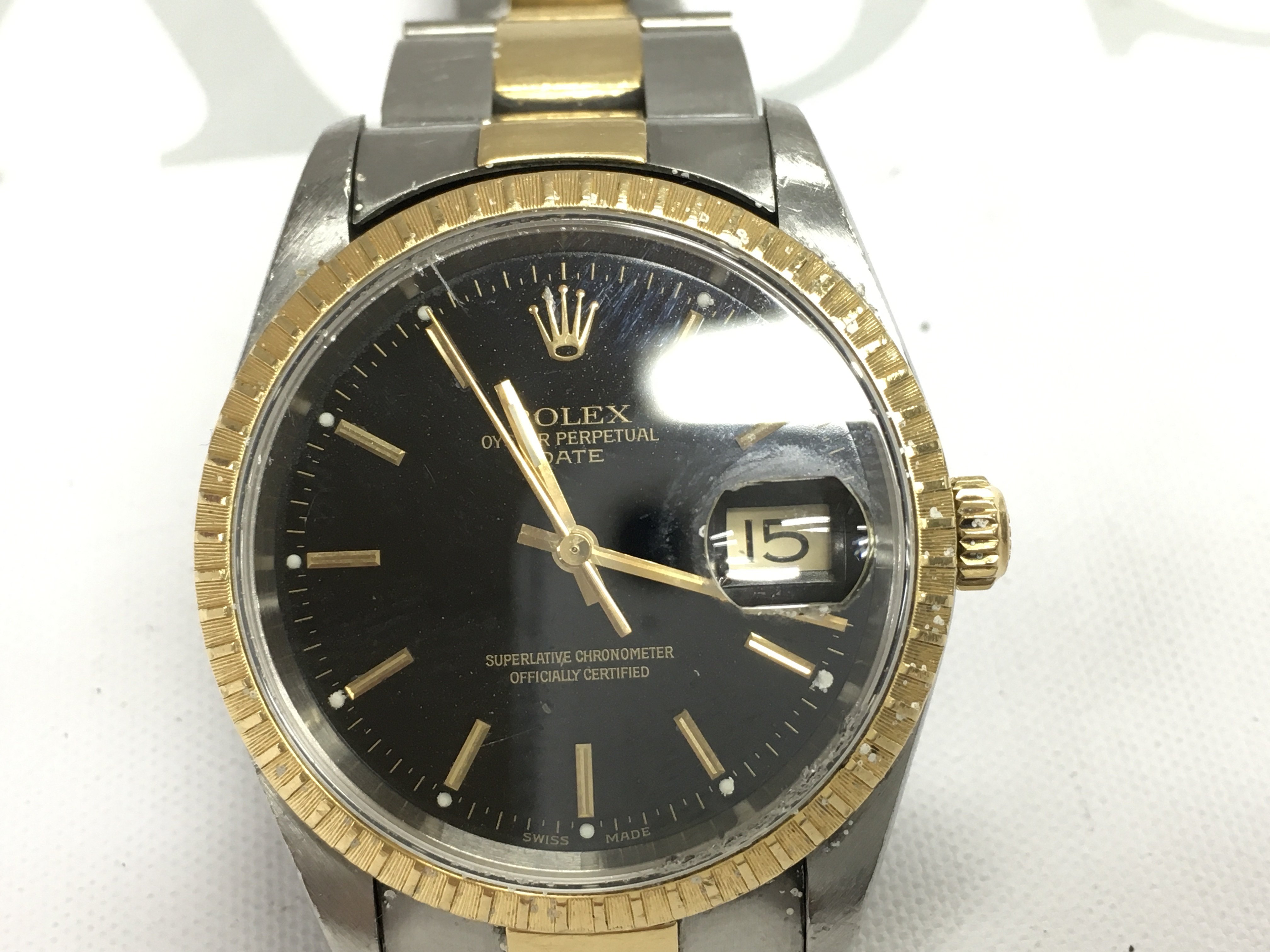 A Rolex oyster perpetual date. Gold and steel two tone watch. Black dial. Case Approx 36mm. Seen running. Watch would benefit from clean and service.