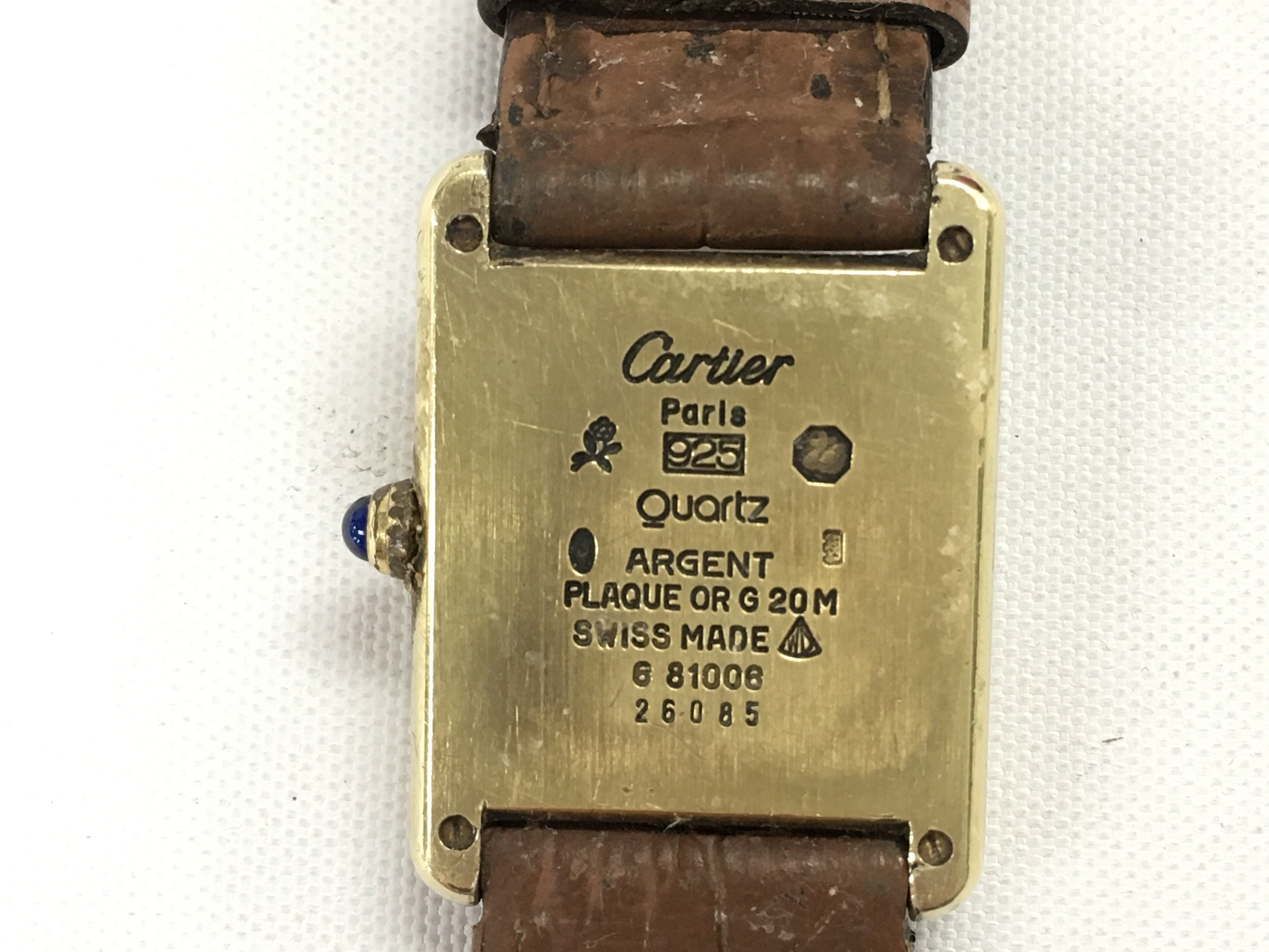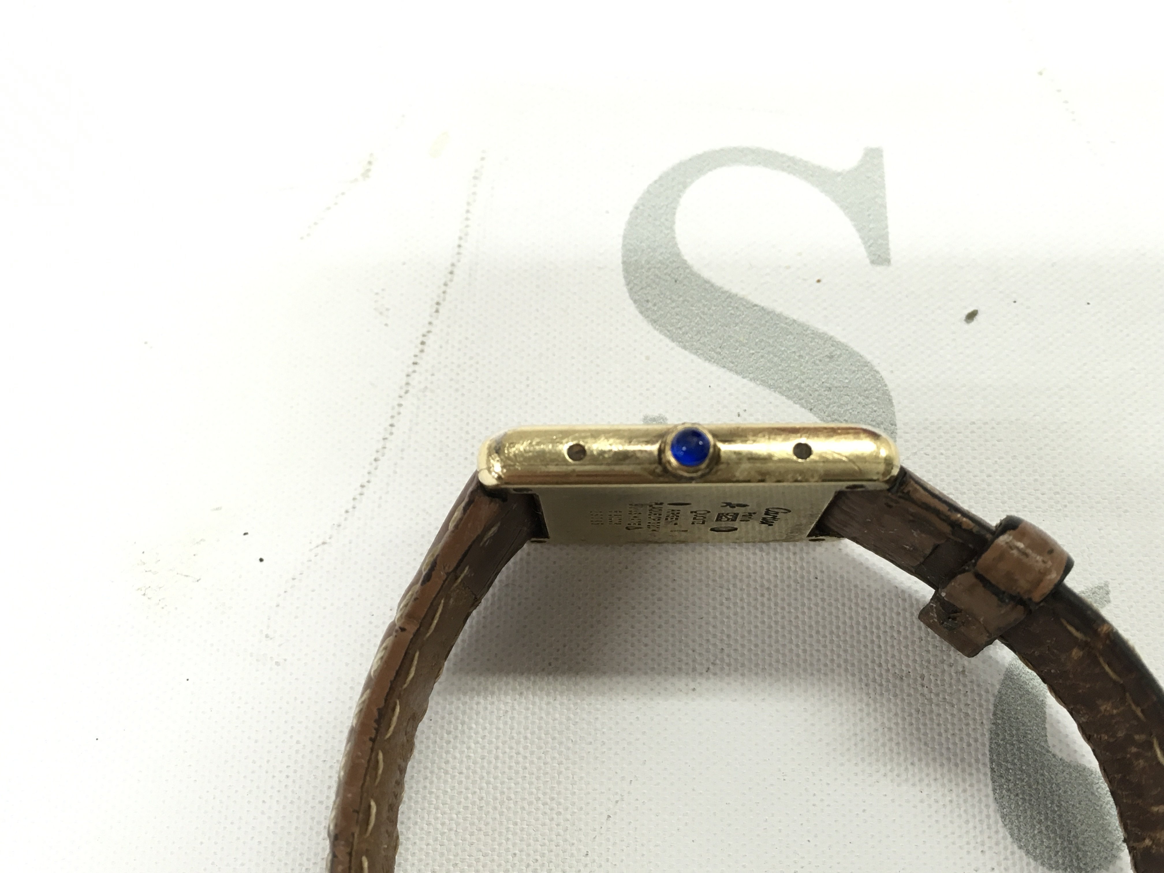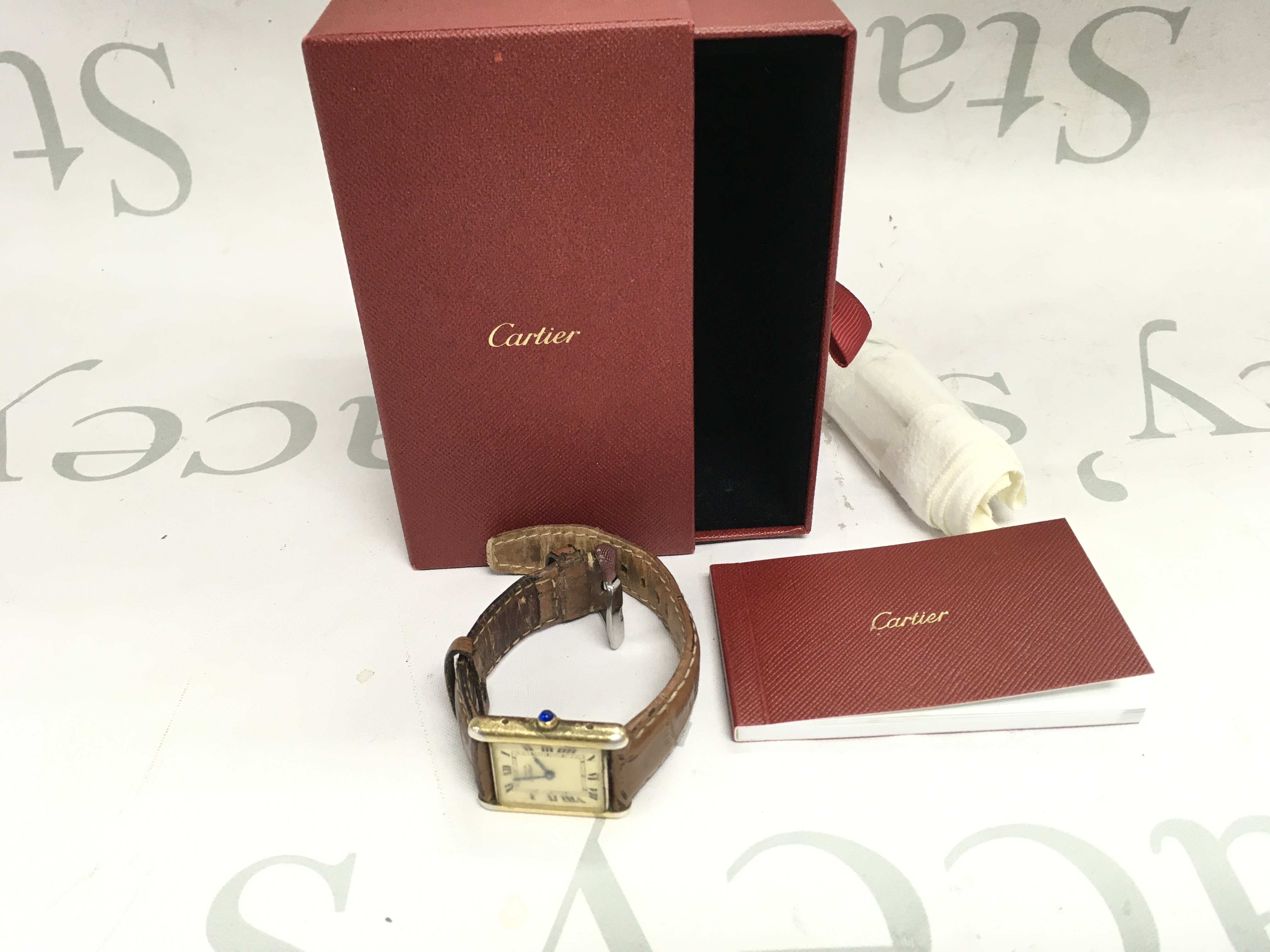 A vintage Cartier Tank must de watch. On replacement strap. Comes with a box and booklet.