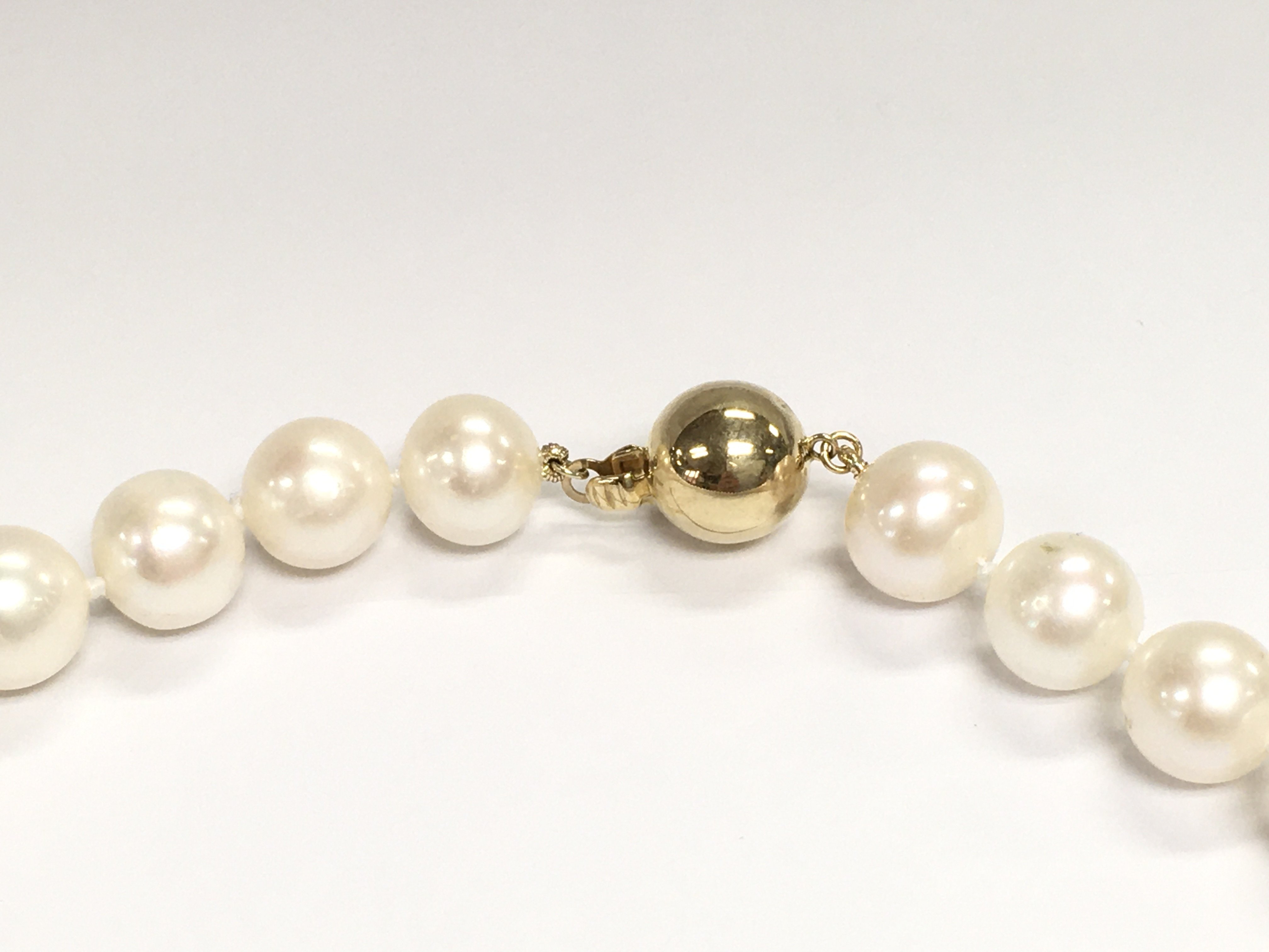 An 18inch string of white pearls with a 9ct yellow gold ball clasp. Postage B