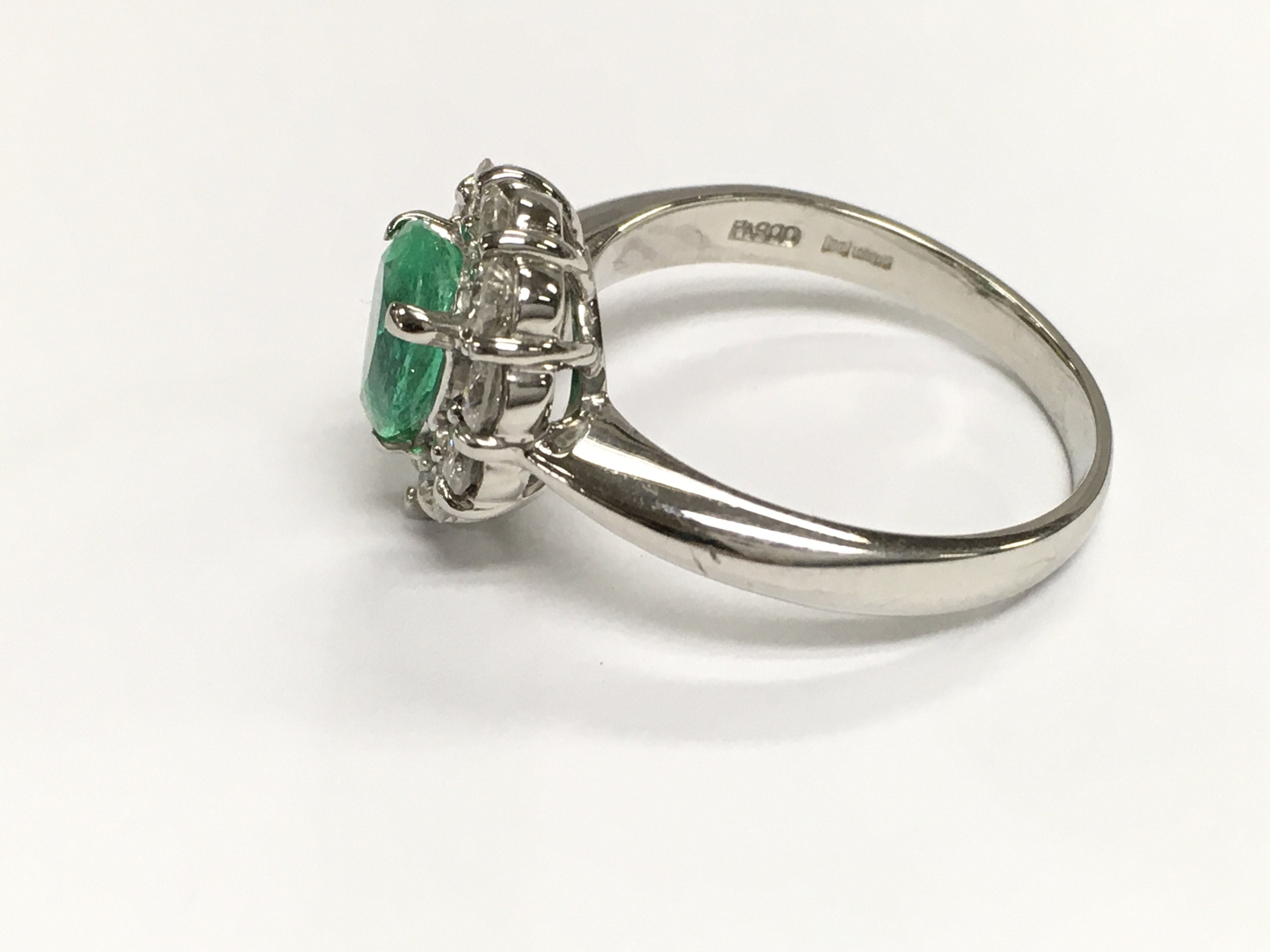 A platinum ring set with a pear shaped emerald with a border of diamonds. Emerald 1.12ct and 0.82ct diamonds approx. Size P 1/2
