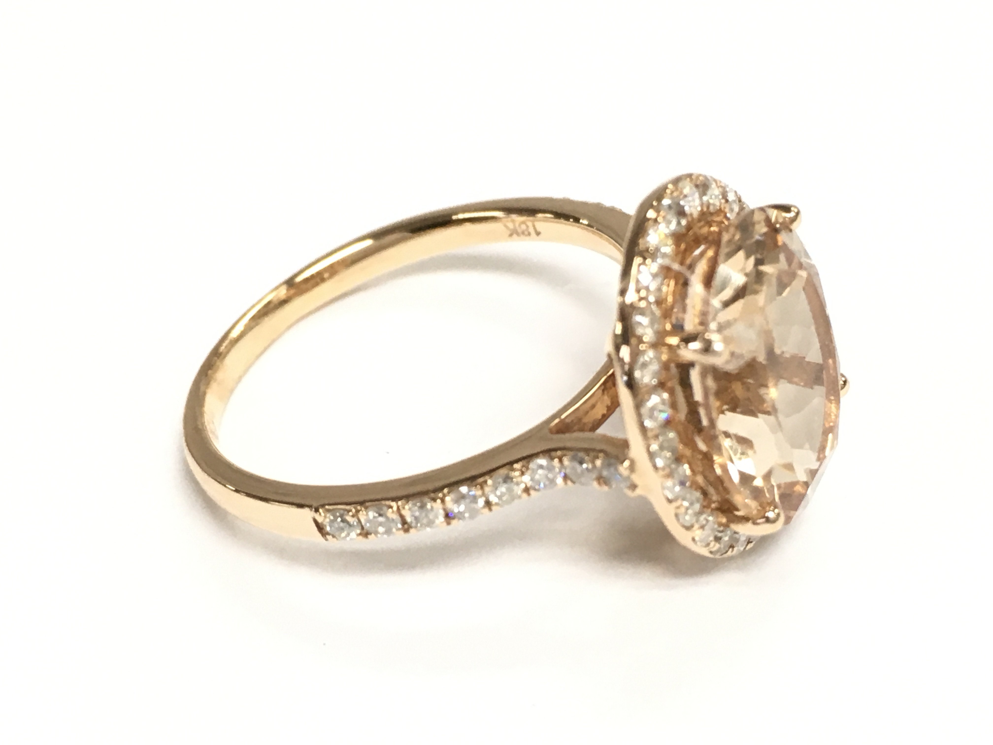 An 18ct rose gold ring set with an oval morganite surrounded by a halo of diamonds with diamond shoulders. Morganite 4.26ct and 0.49ct diamonds Approx and size P