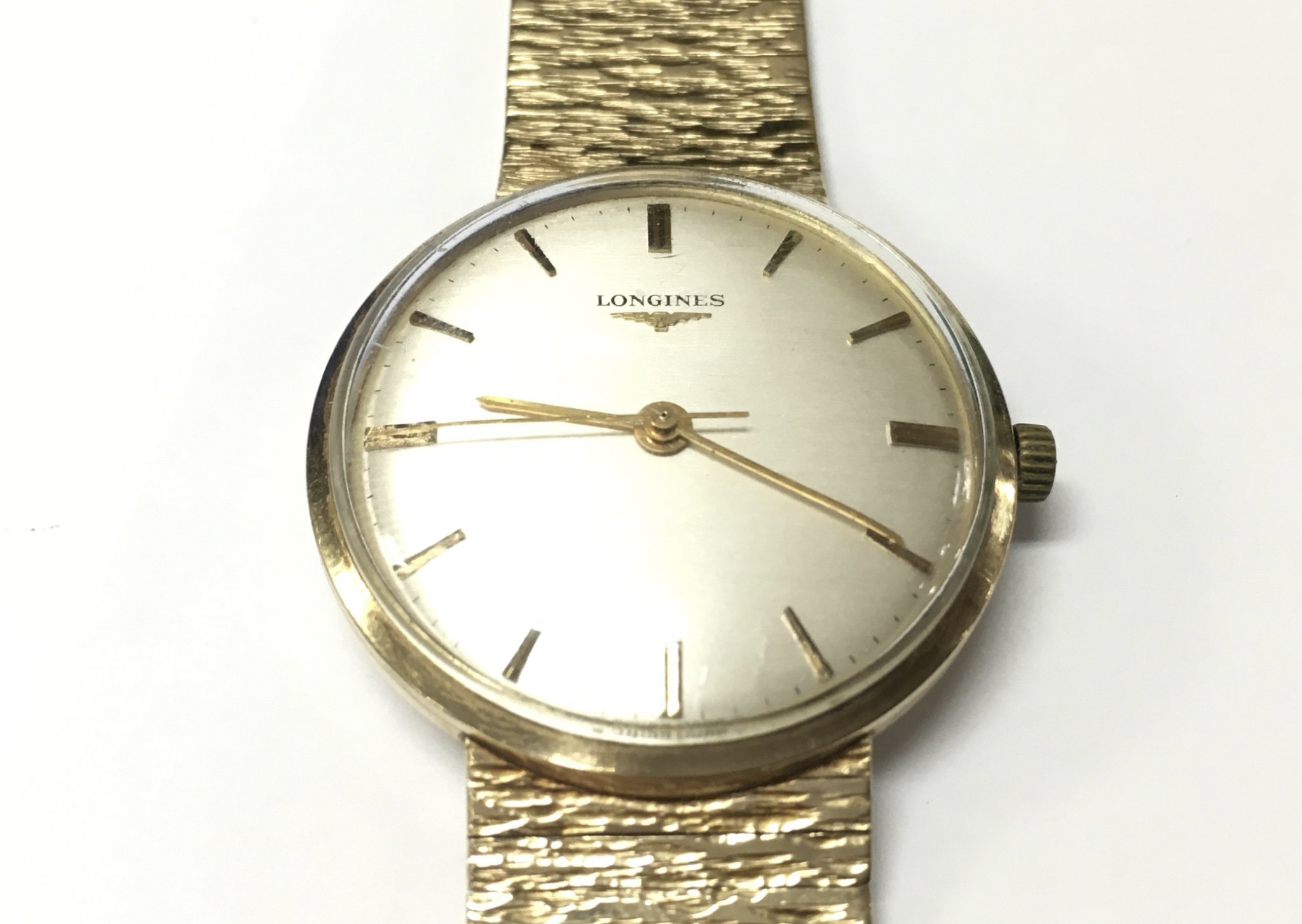 A gents Longines watch with a 9ct gold case and strap. Approx weight 64.55 grams.