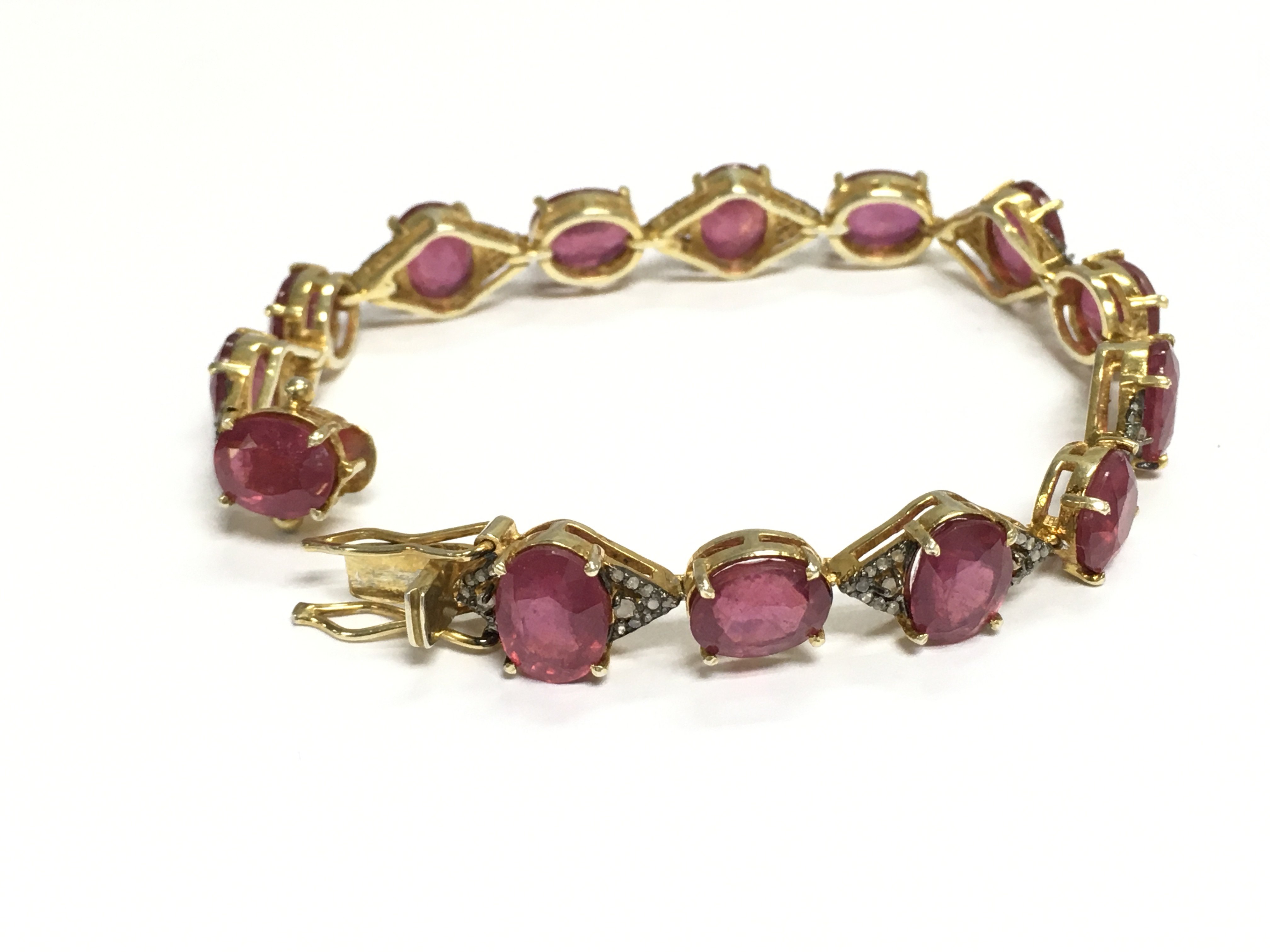 Silver gilt bracelet set with oval rubies (glass filled) and diamonds. Rubies Approx 28ct and 0.70ct diamonds.