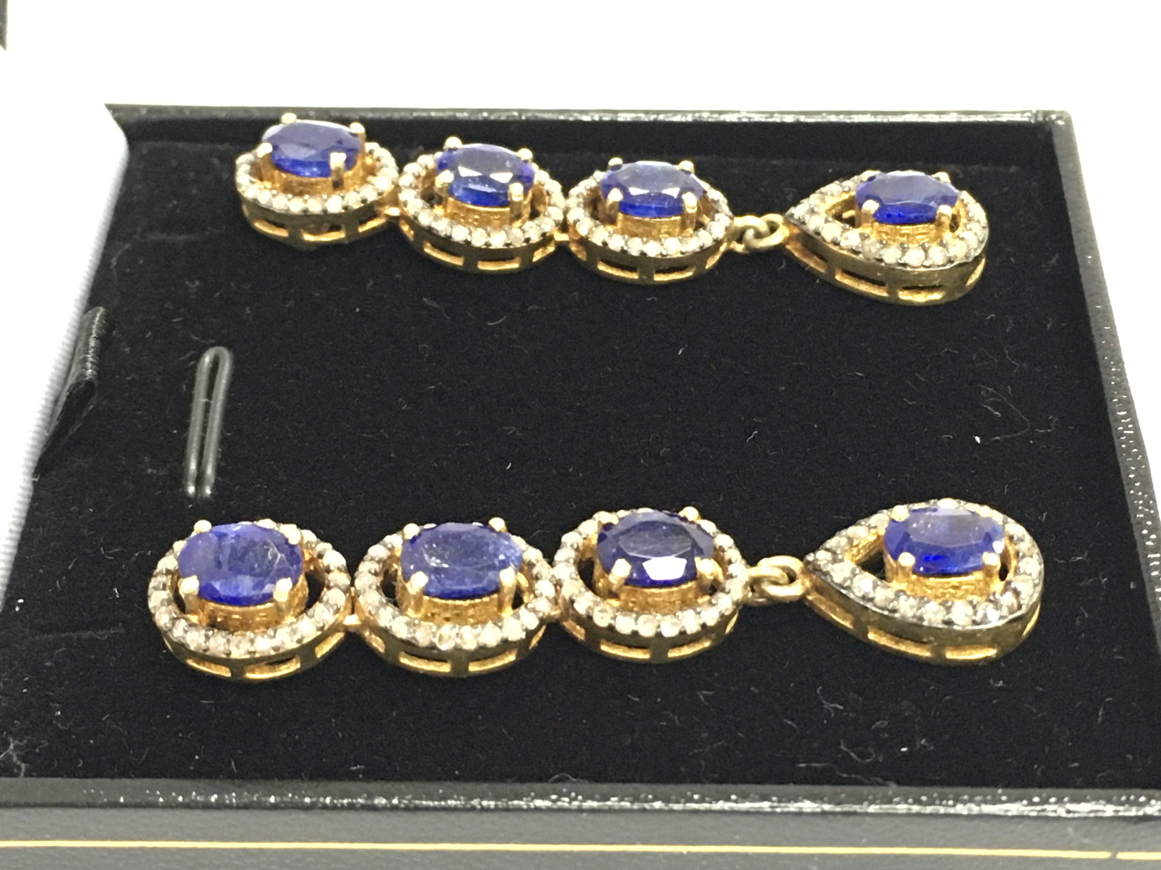 A pair of silver gilt long drop earrings set with oval kyanites each surrounded by diamonds. Kyanites 5ct and 1.65ct diamonds approx