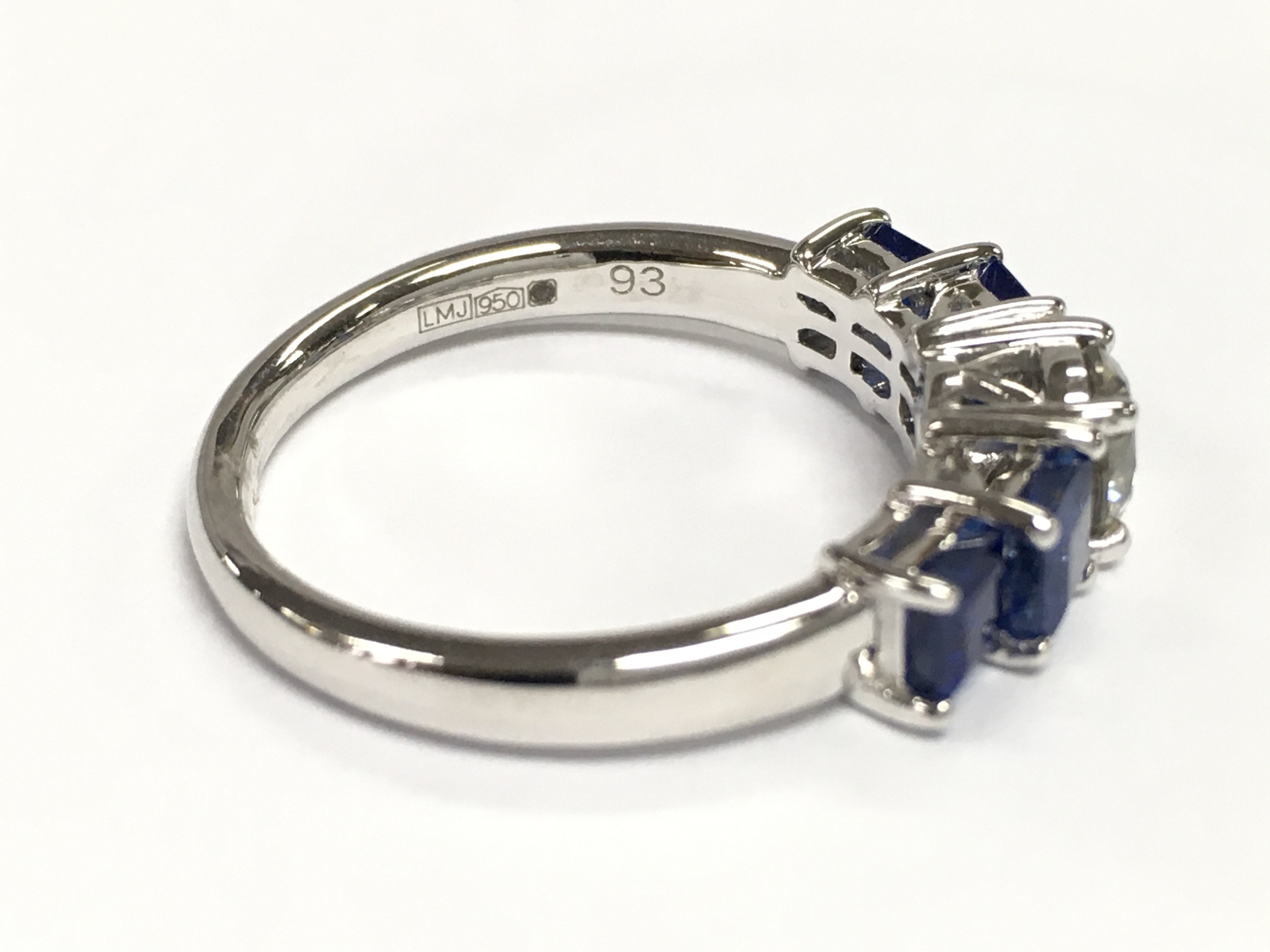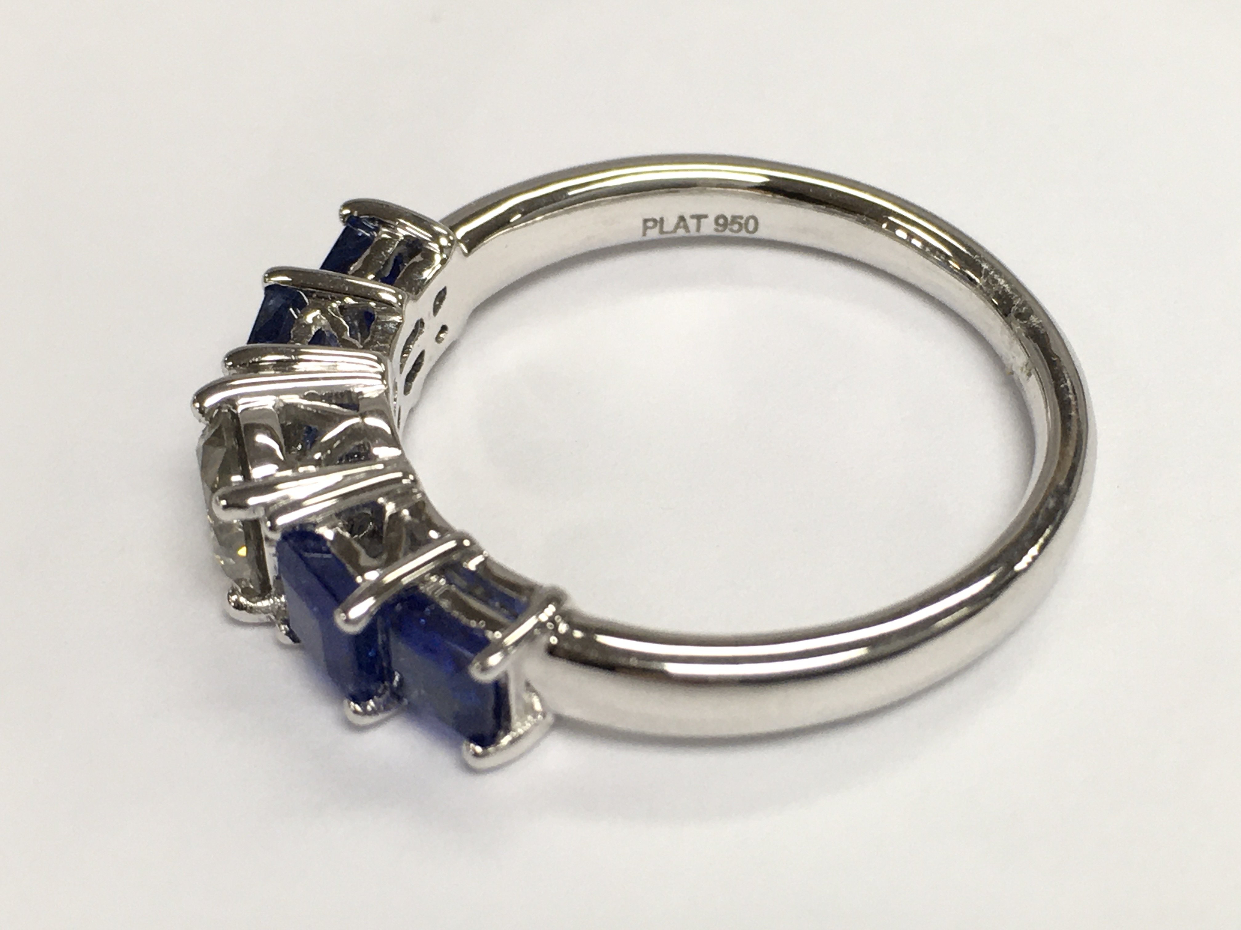A platinum 5 stone ring set with central diamond flanked by Princess cut sapphires. Diamonds 0.53ct and sapphires 1.45ct. Size N