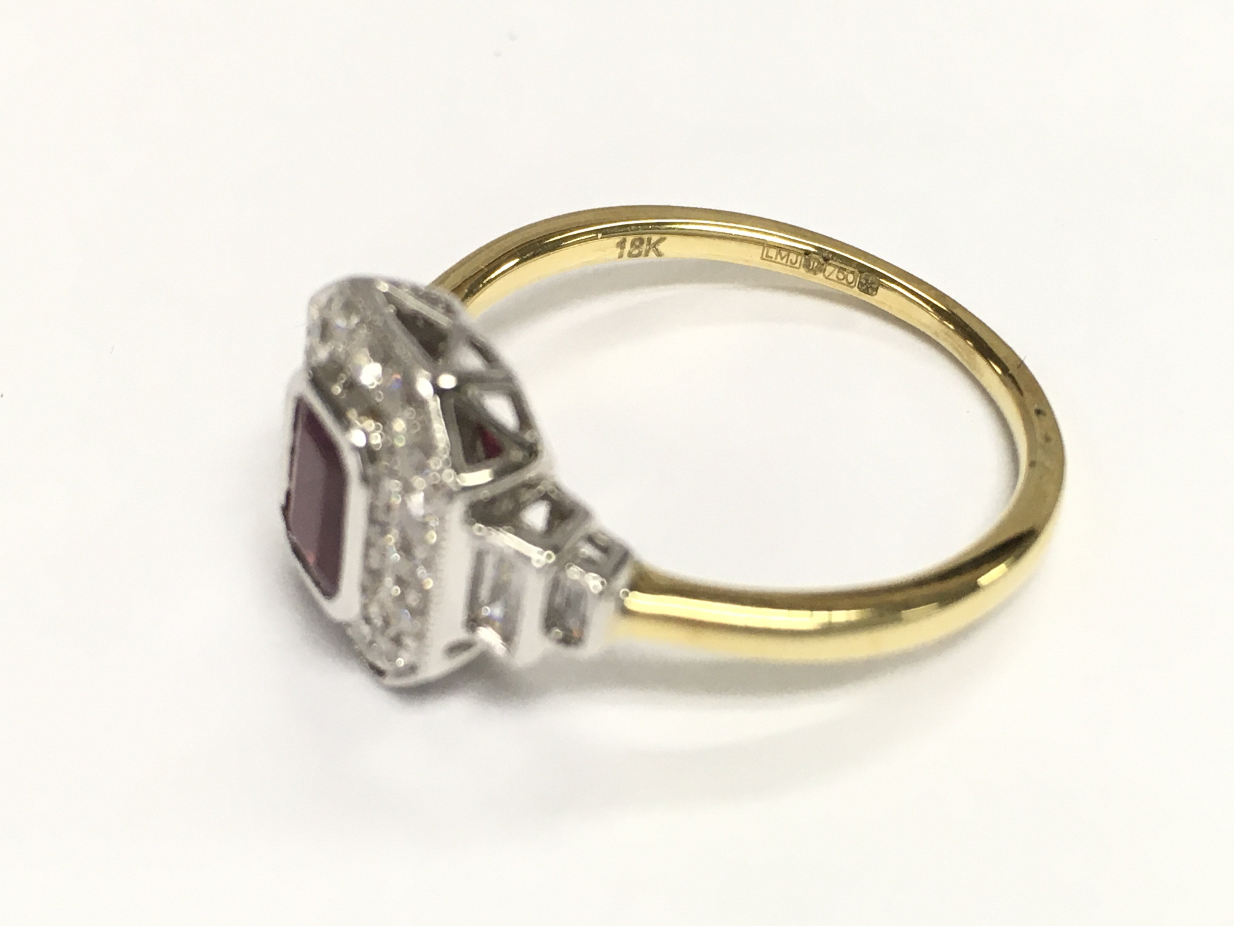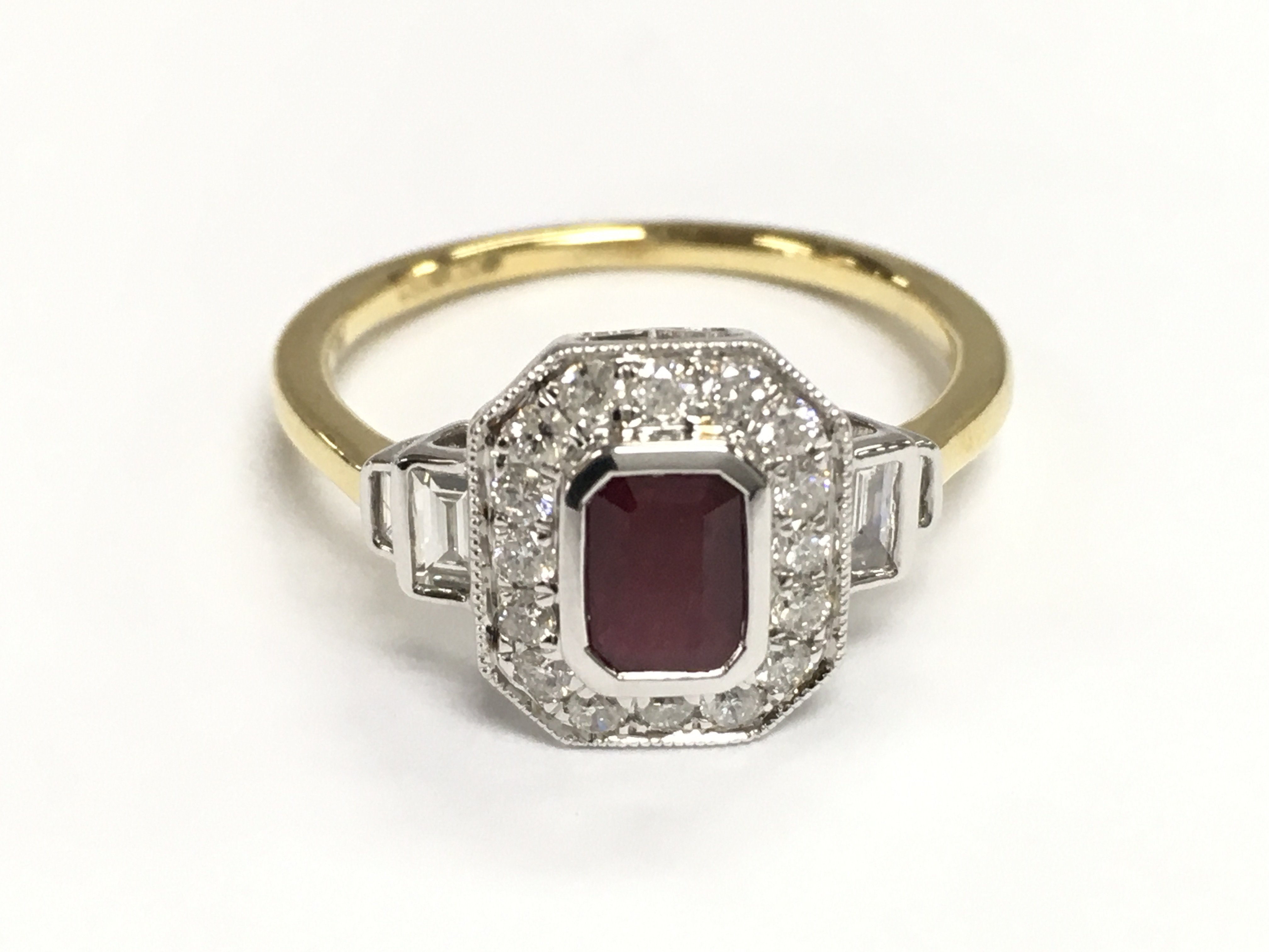 18ct yellow and white gold art deco style ring set with a step cut ruby and round and baguette cut diamonds, ruby 0.43ct and diamonds 0.39ct Approx. Size N