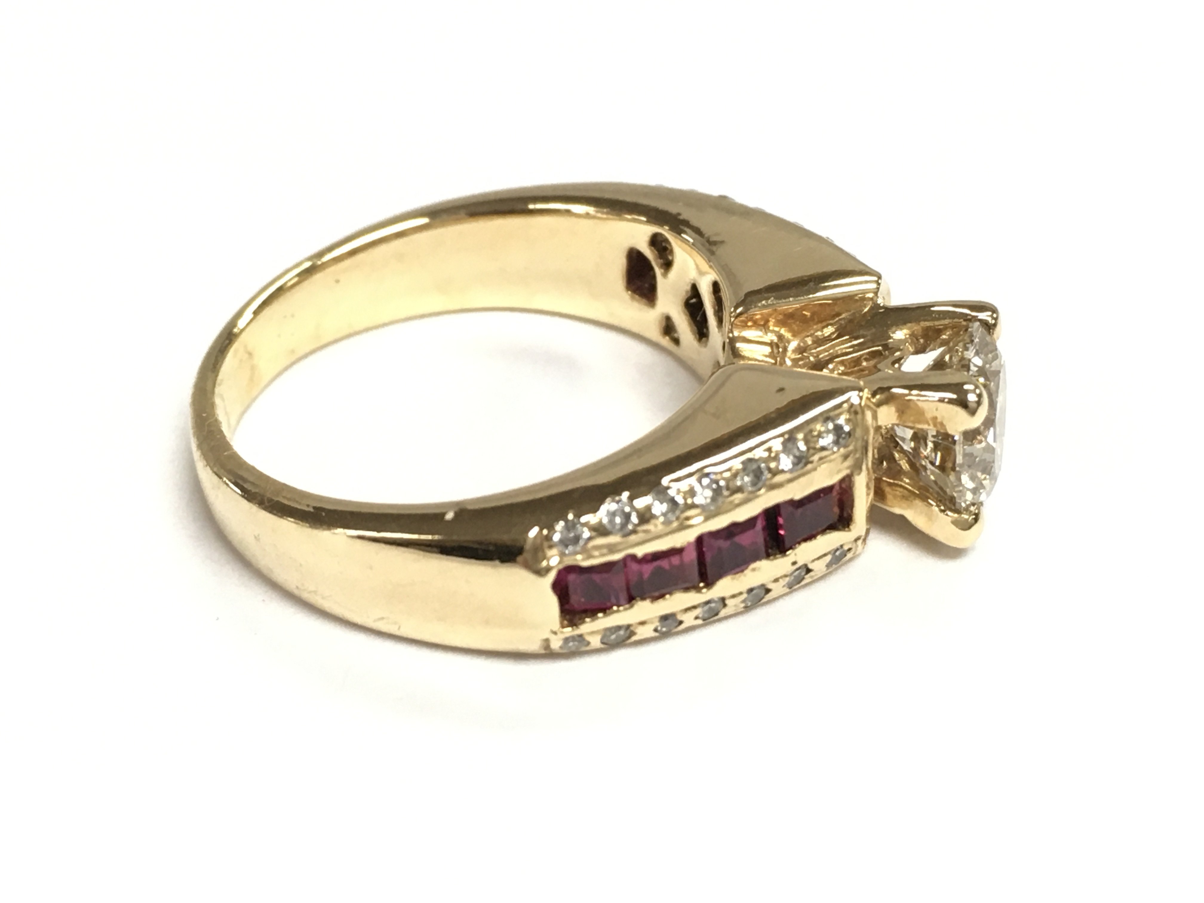 9ct gold ring set with a raised central diamond with further diamonds and red stones on the shoulders. Central diamonds 1.01ct and other diamonds Approx 0.09ct Size M