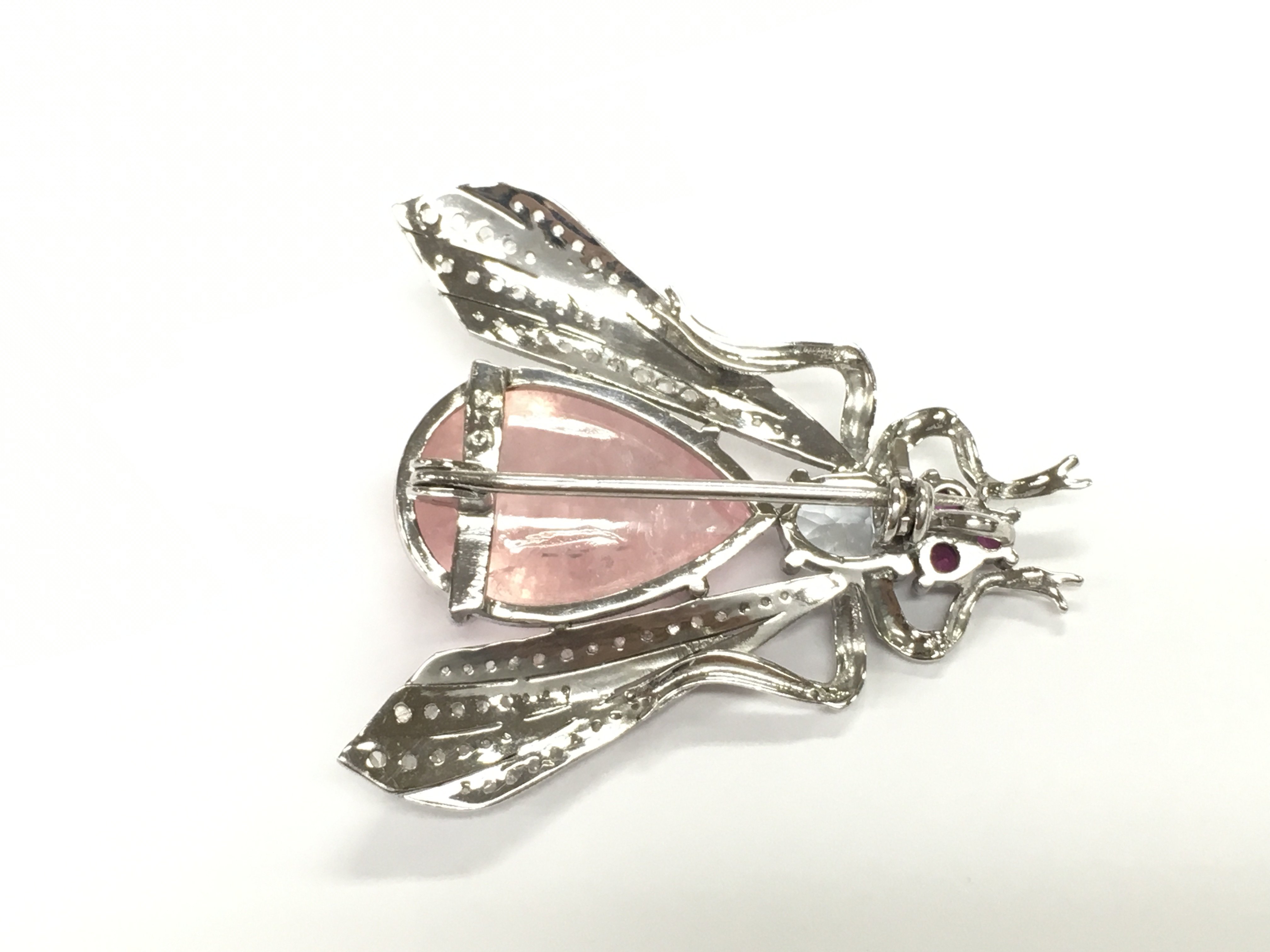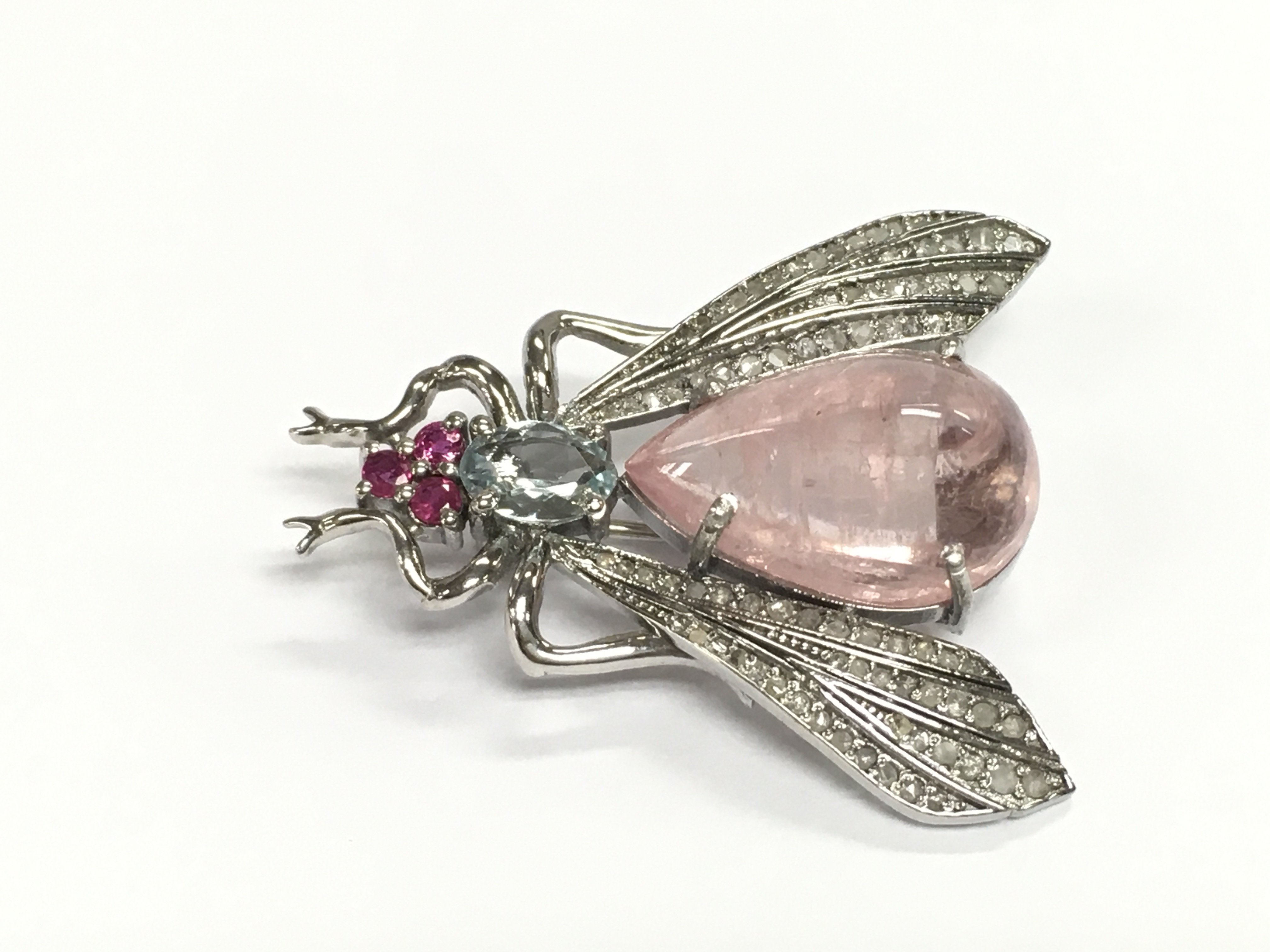 A silver fly brooch / pendant set with pear shaped pink beryl an oval aquamarine rubies and diamonds. Aquamarines 12.10ct and diamonds 0.50ct some of the very small diamonds missing.