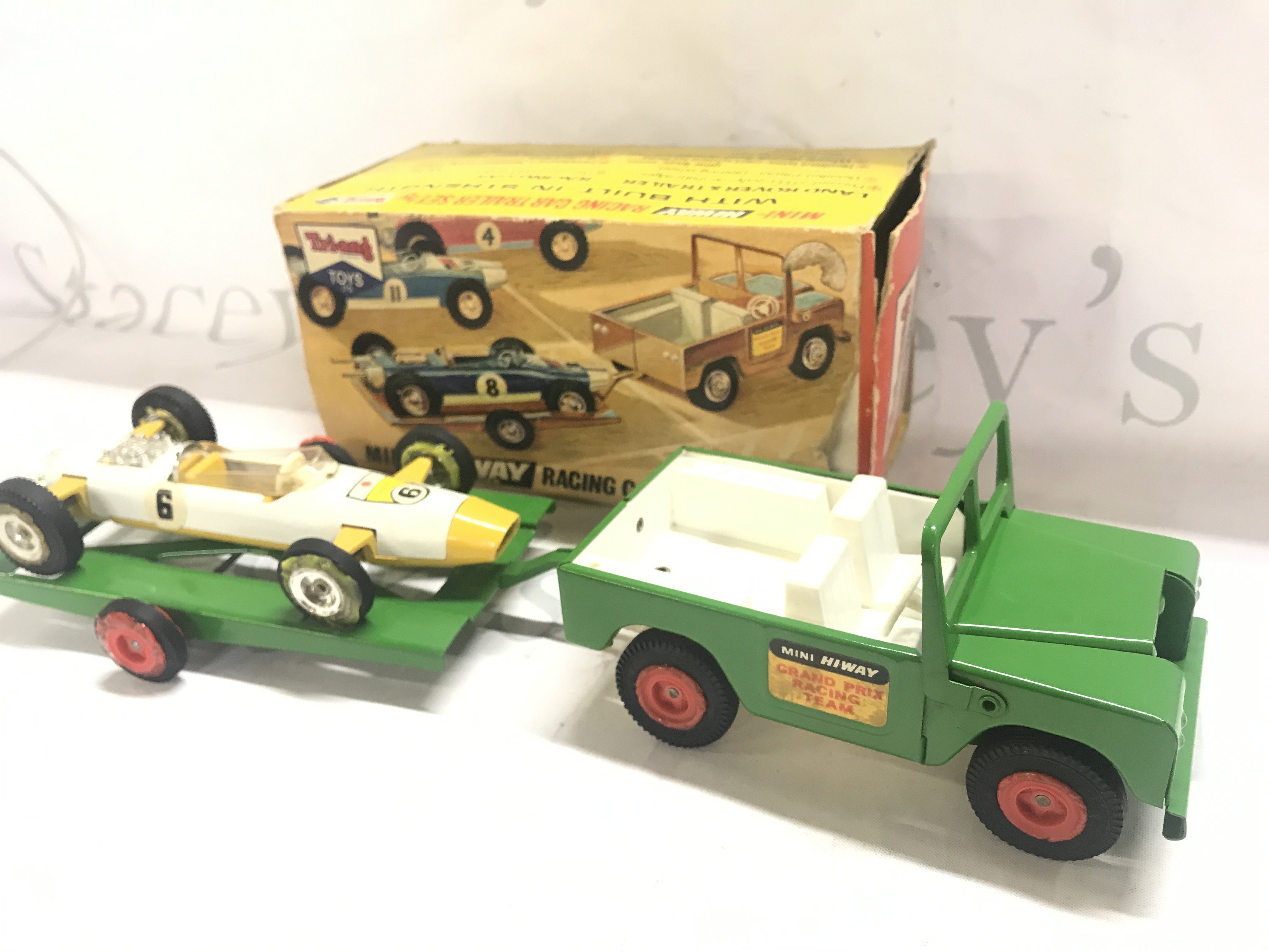 A Boxed Tri-Ang Mini-Hi-Way Racing Car And Trailer set. Box Is Worn.