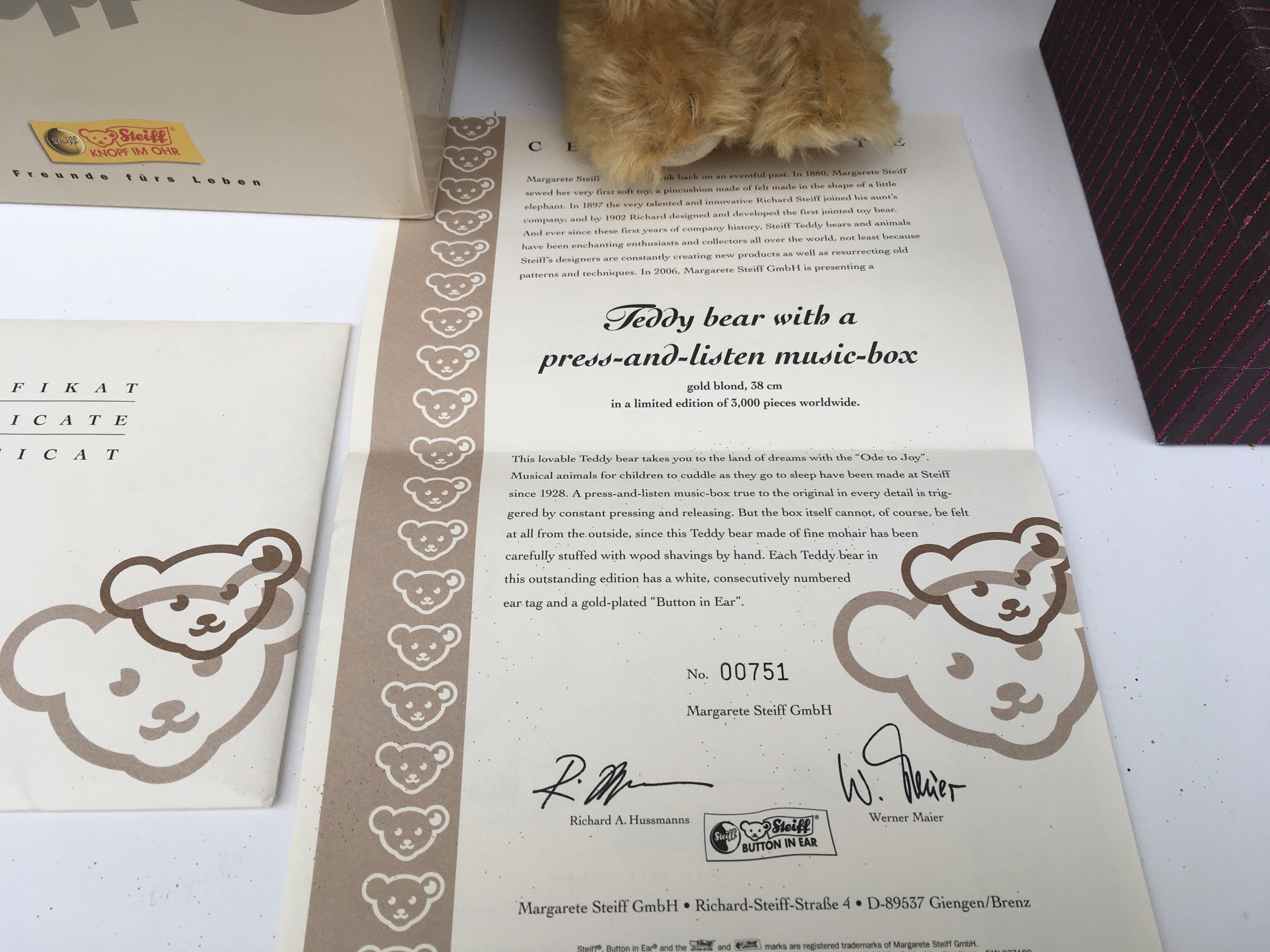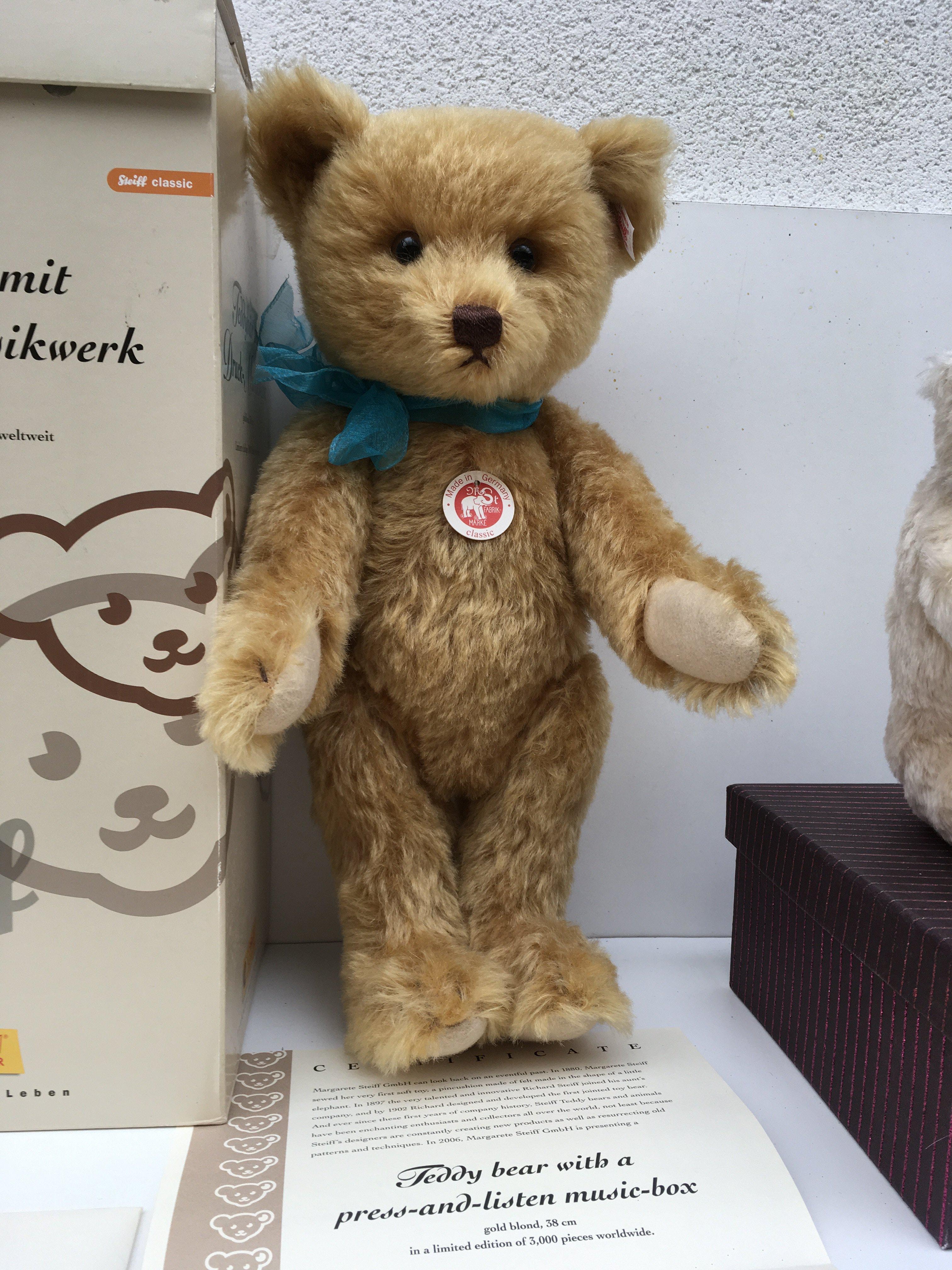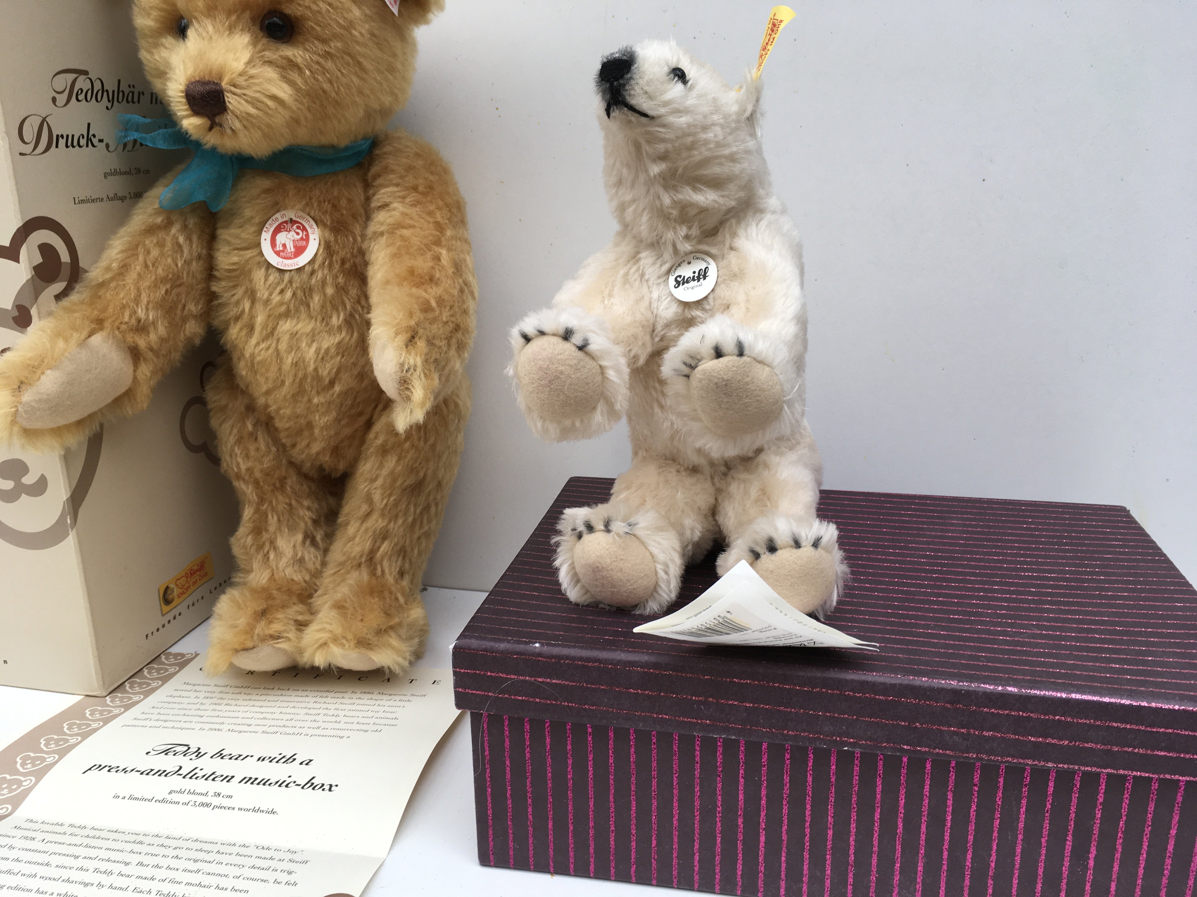 Two boxed Steiff toys featuring a gold blond Teddy bear 38cms with a press me music box and a white Polar bear. The teddy bear is no.751 of 3000. Certicate included. No reserve. (2)