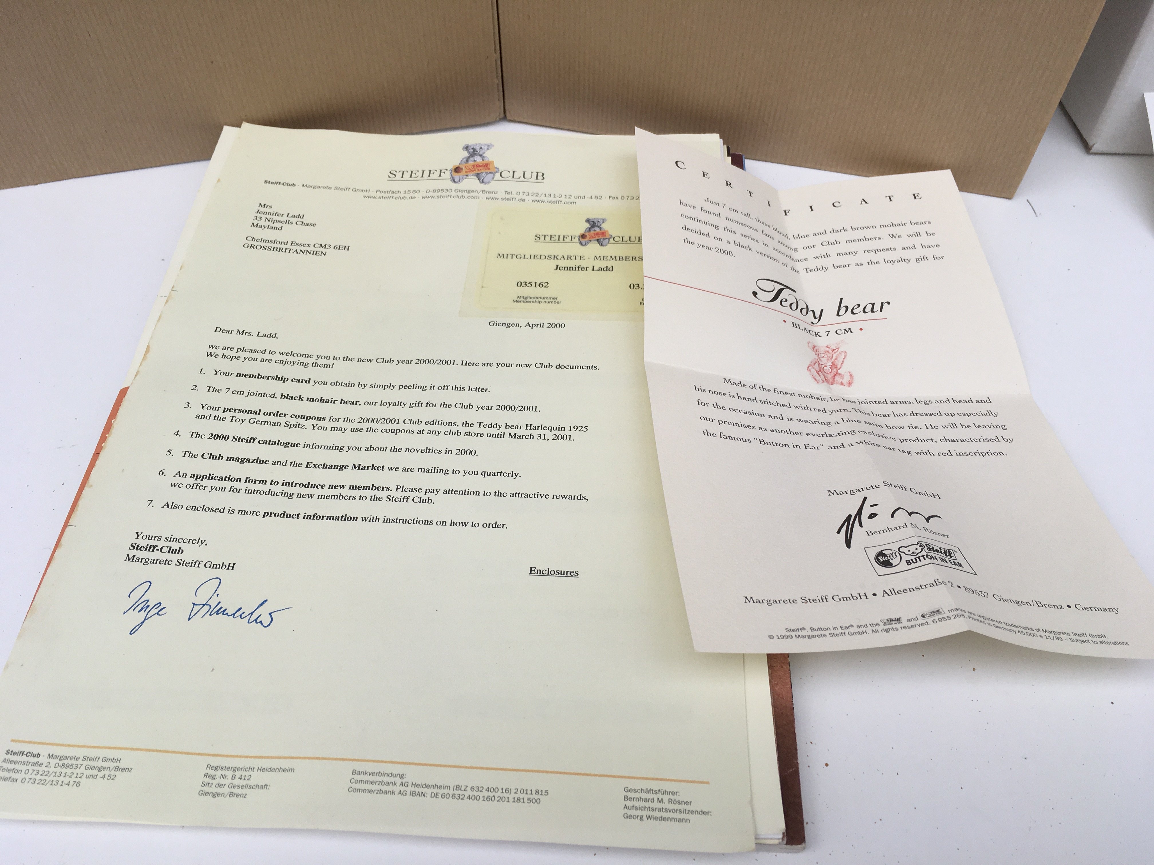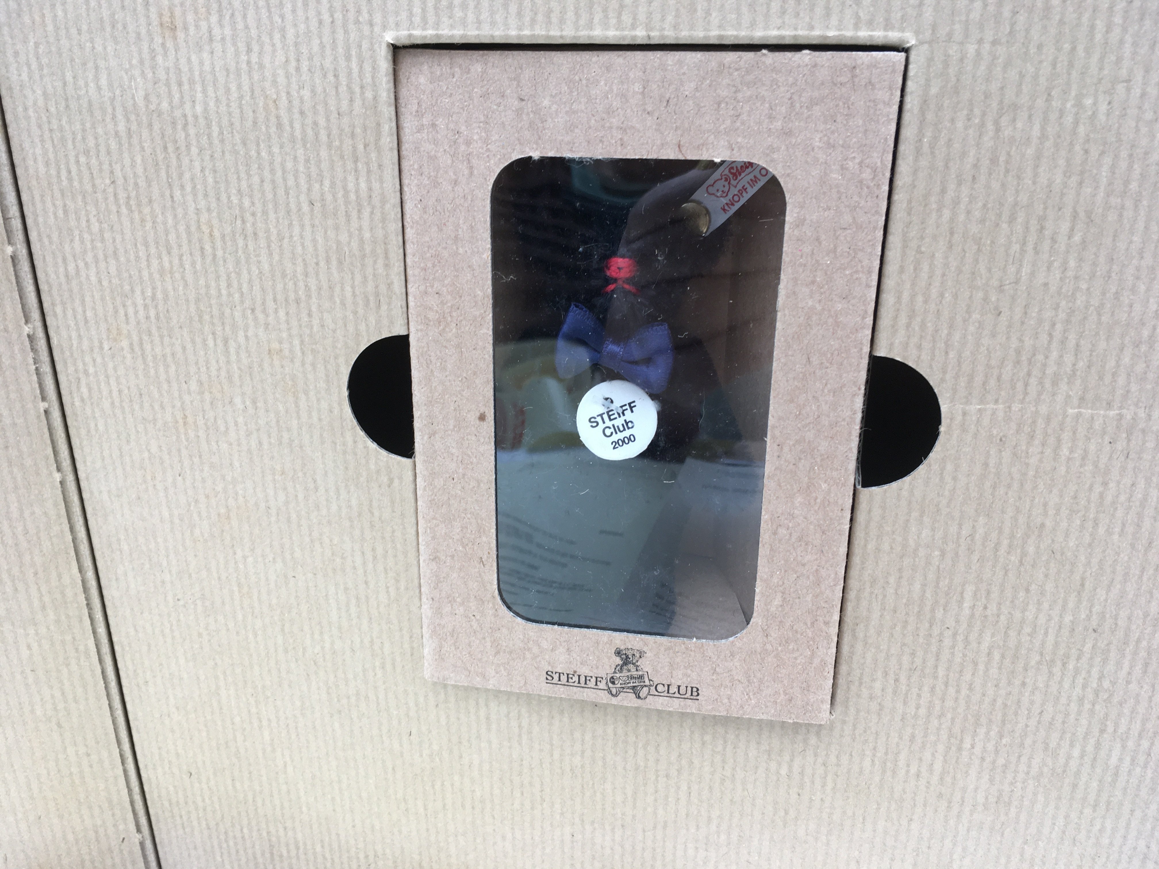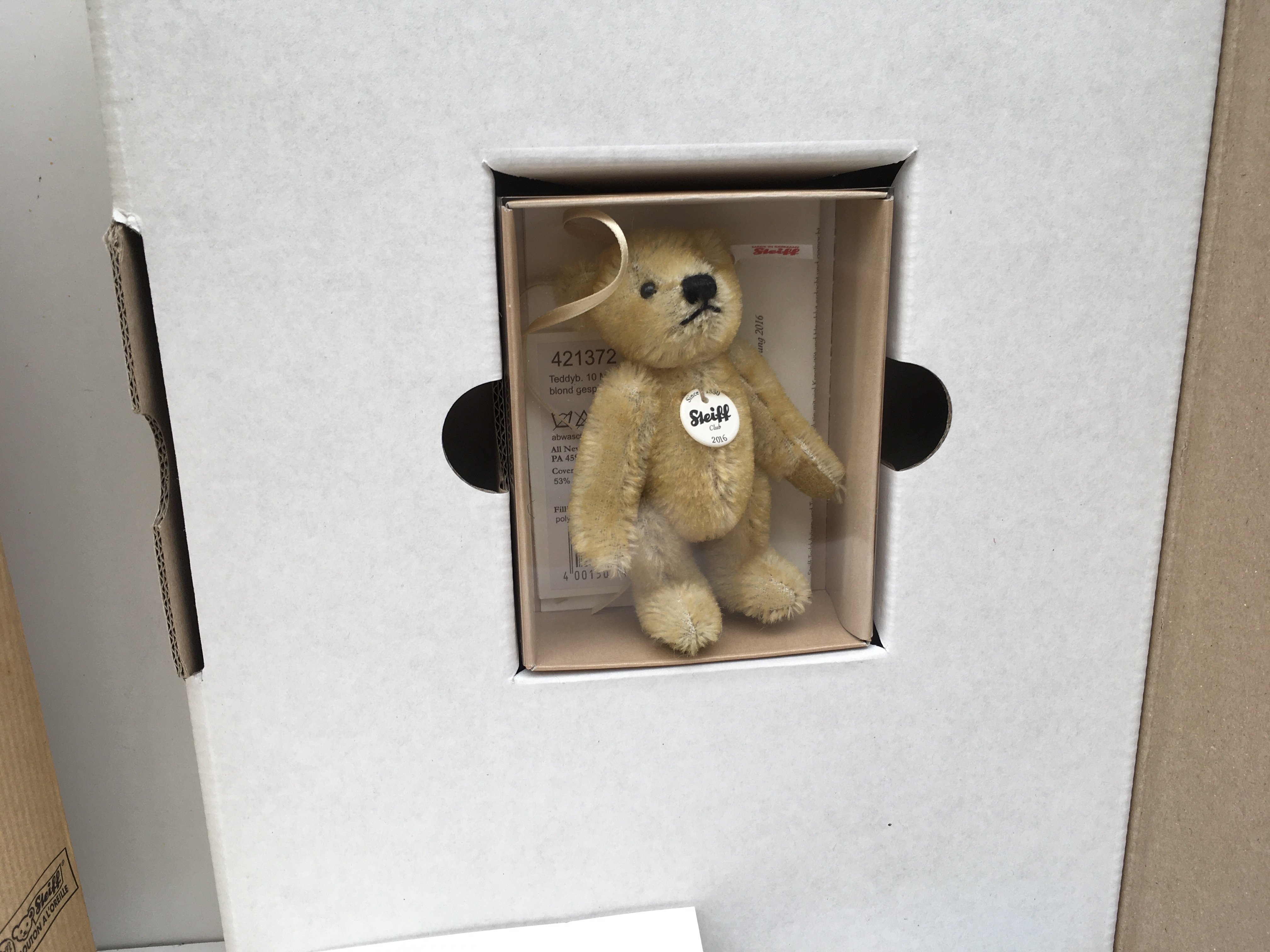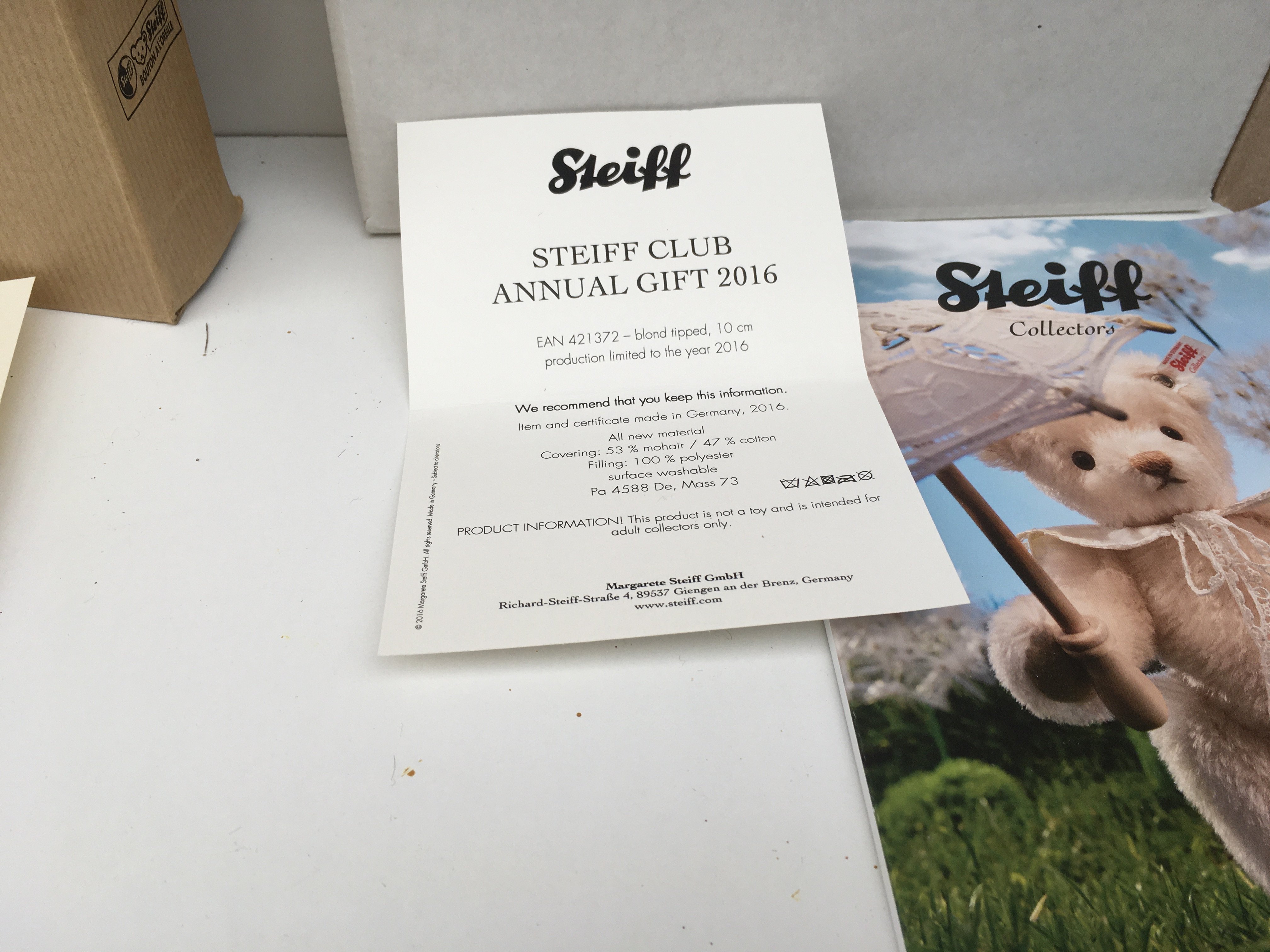 Two boxed Steiff minature teddy bears produced as annual gifts to Steiff Club members. Featuring a 7cms black mohair bear for 2000 and a 10cms blond tipped bear for 2016. Both with certificates and other paperwork. No reserve. (2)