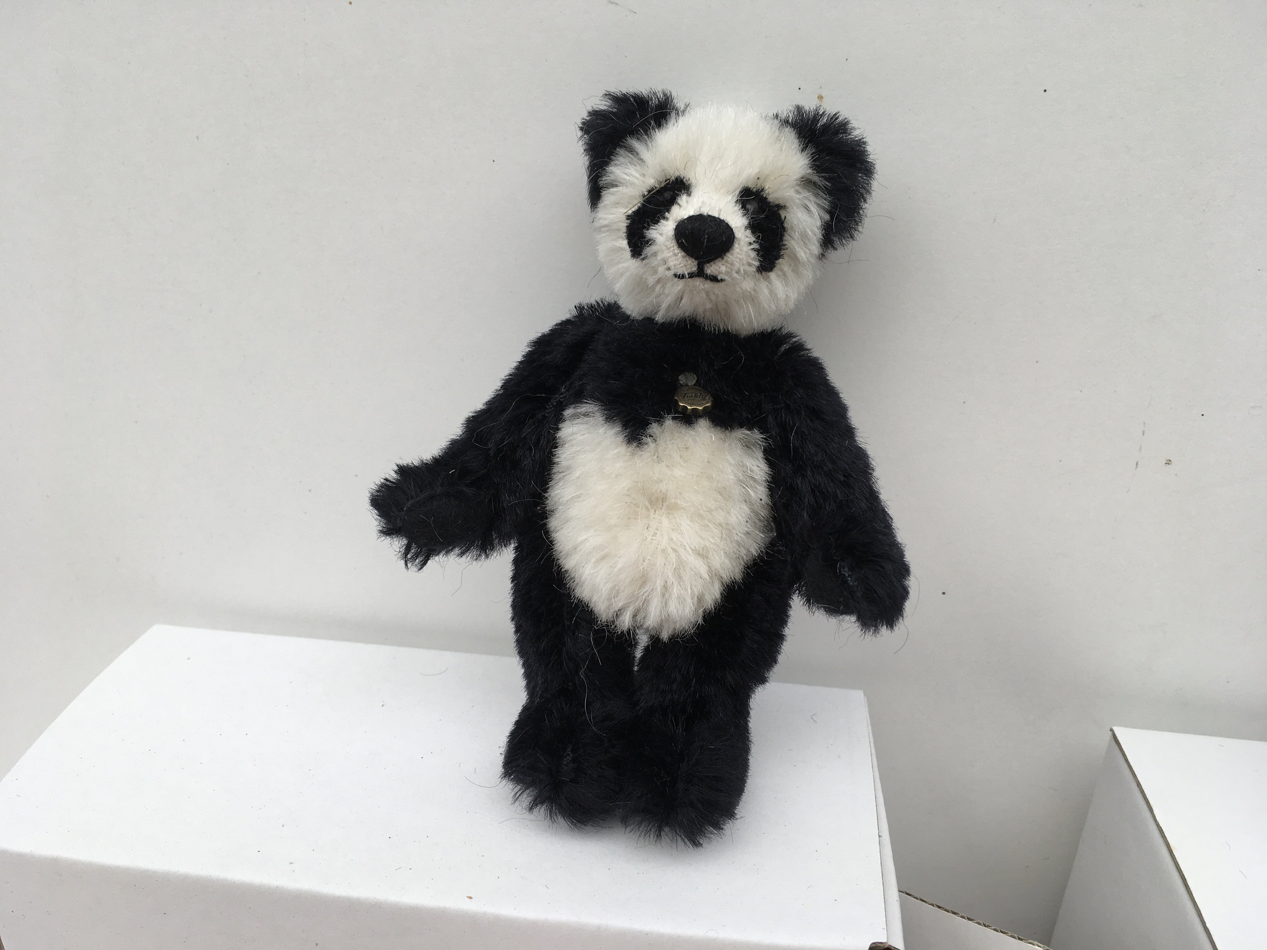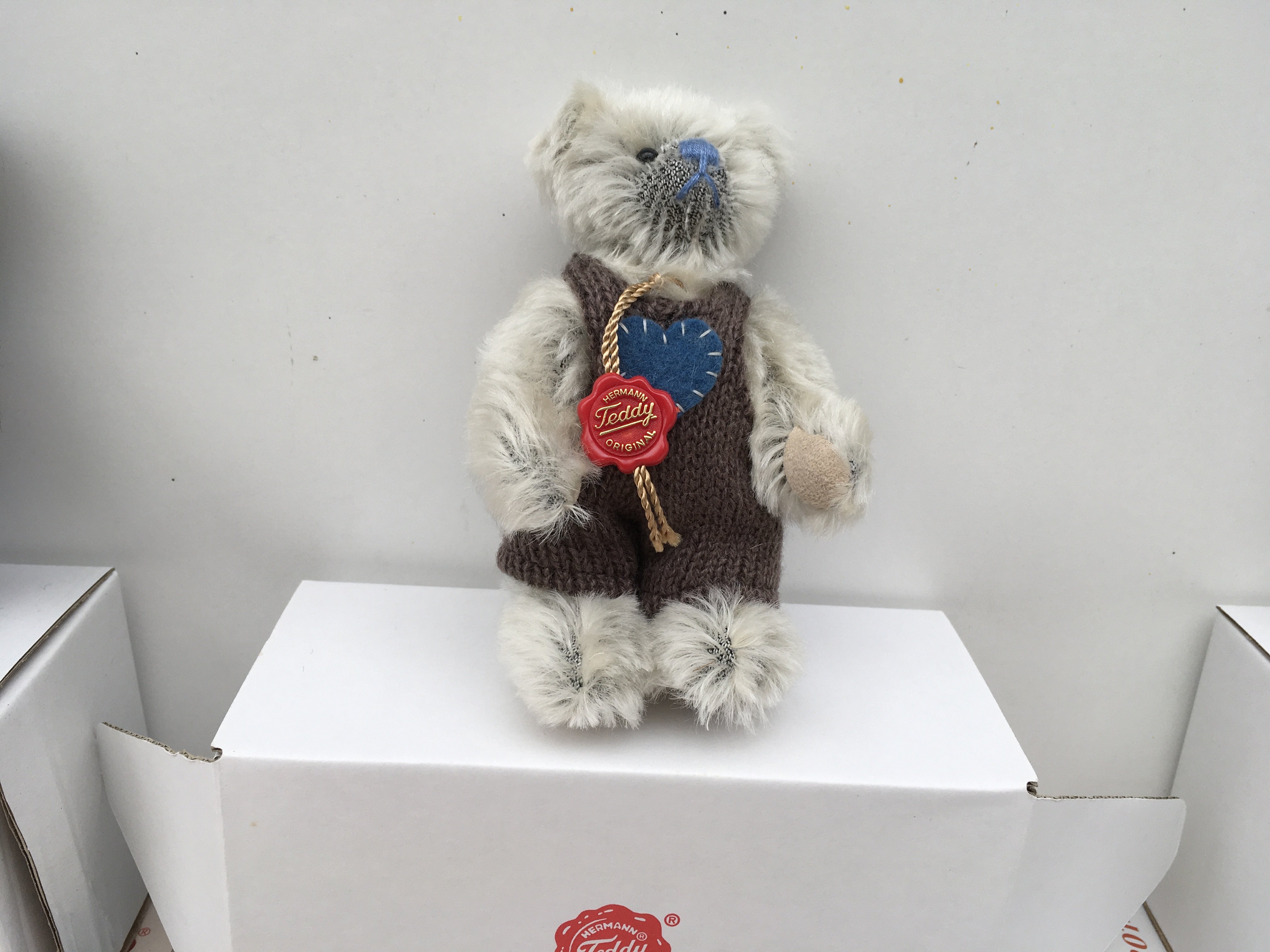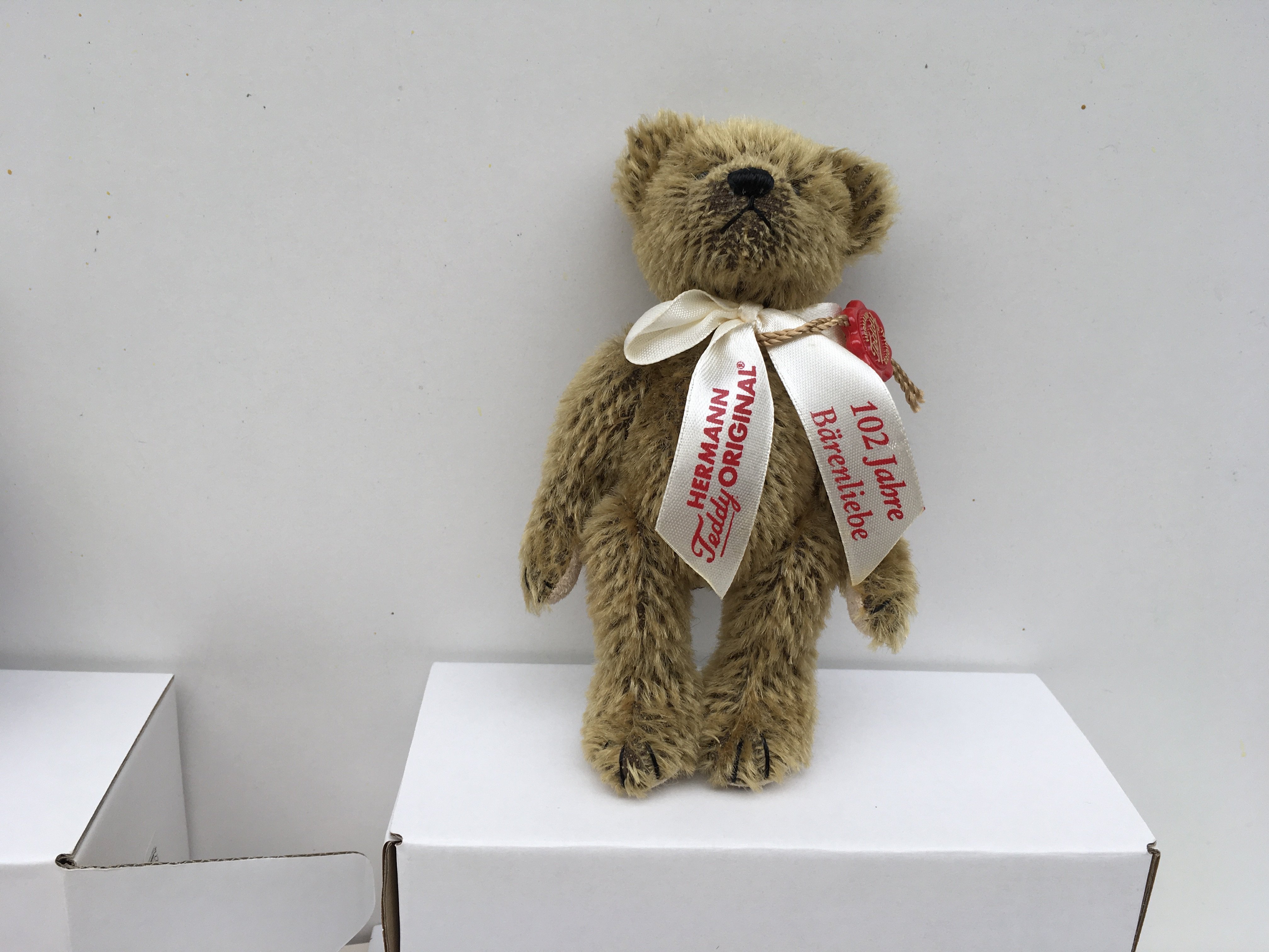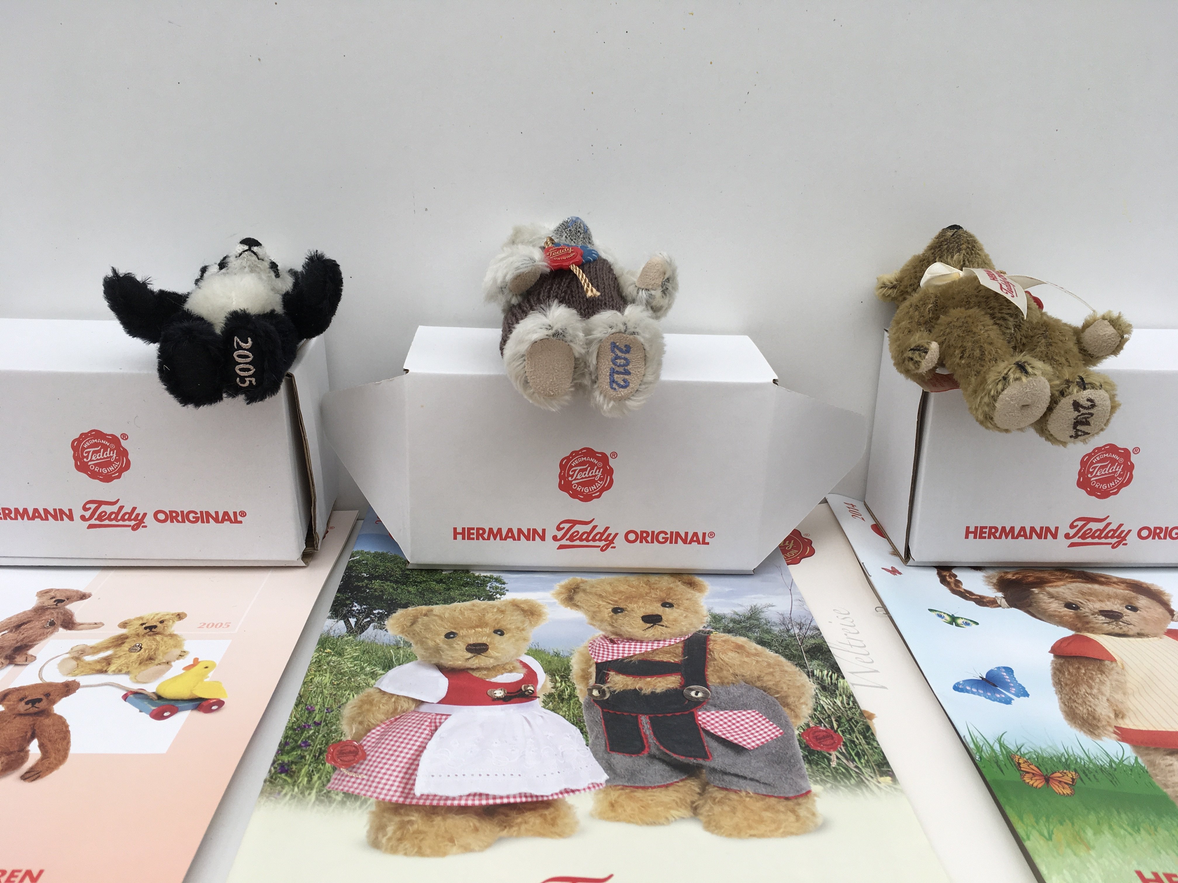 Three boxed Herman minature teddies featuring a Panda bear from 2005 a light grey bear from 2012 and a golden brown bear from 2014. Includes associated magazines. No reserve