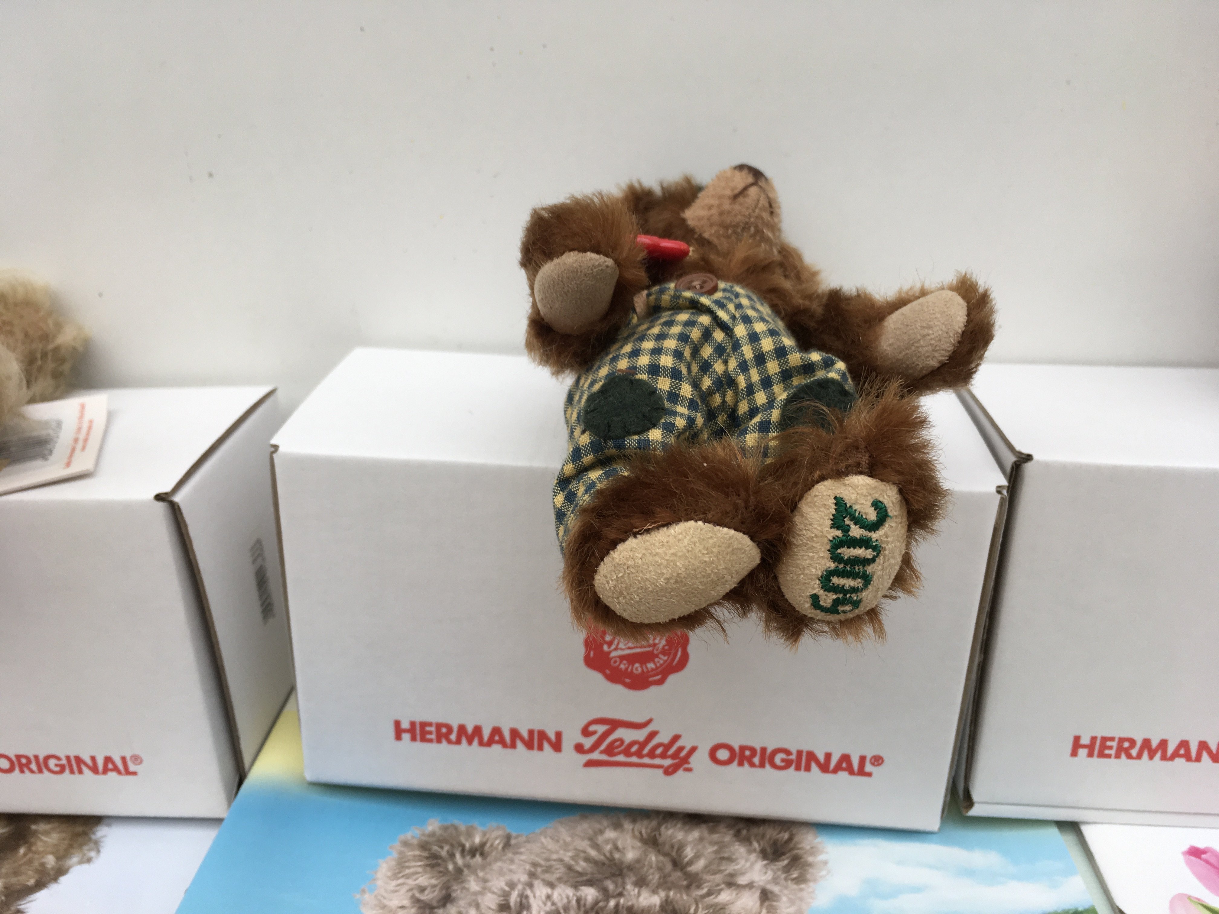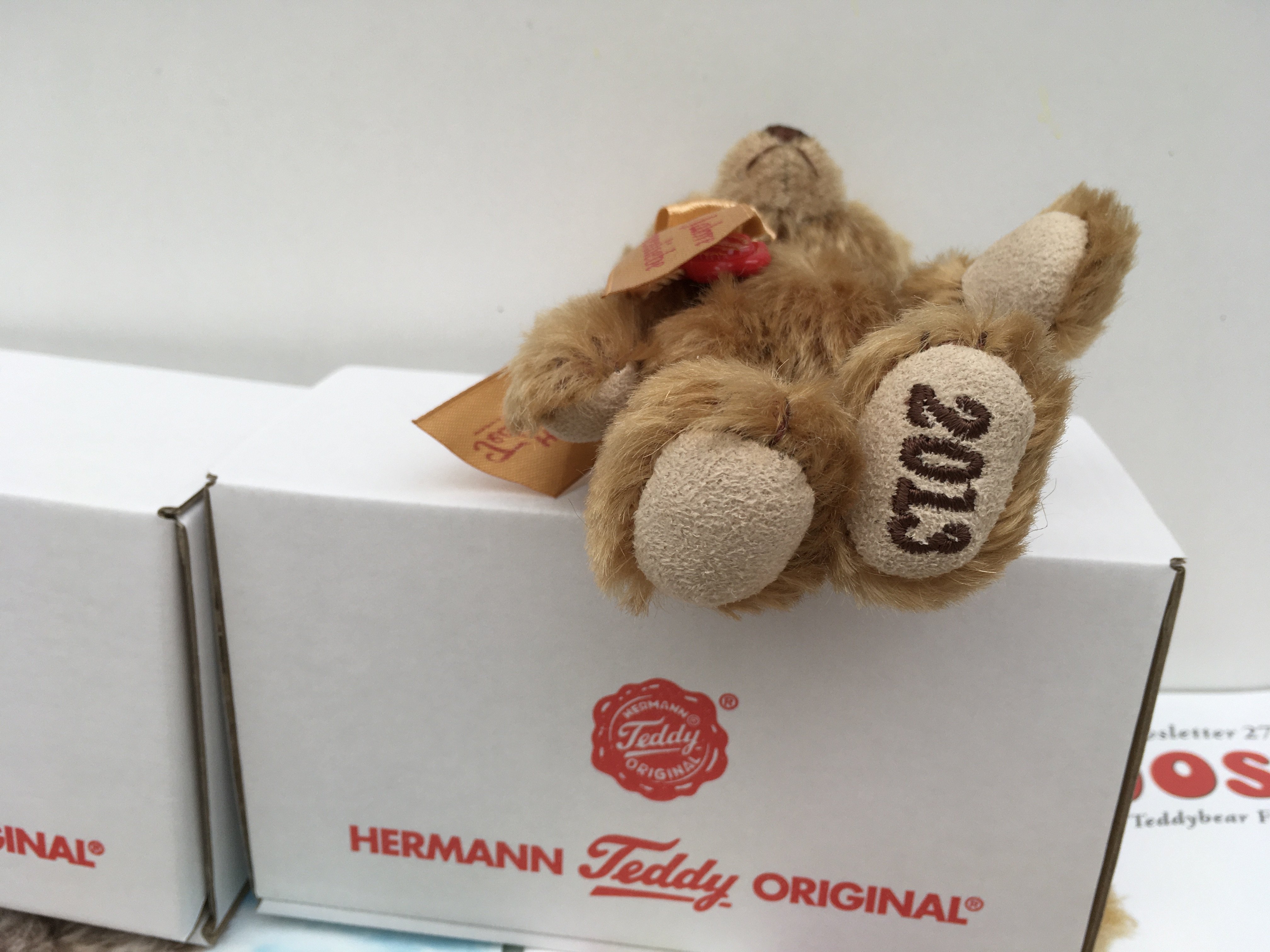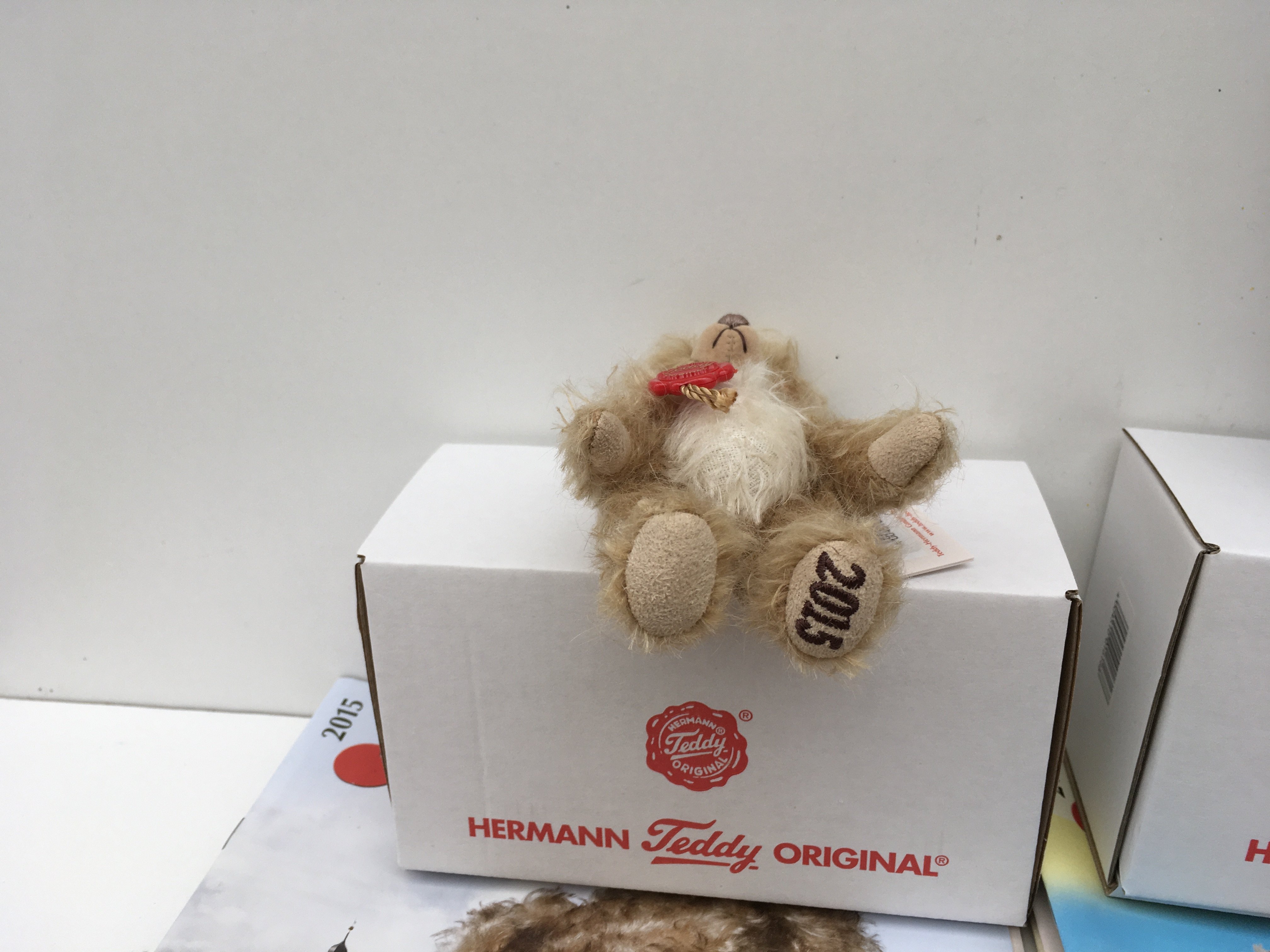 Three boxed Herman minature Teddy bears featuring 2009 dark brown bear a 2013 golden brown bear and a 2015 light brown white tippled bear, includes associated magazine. No reserve.