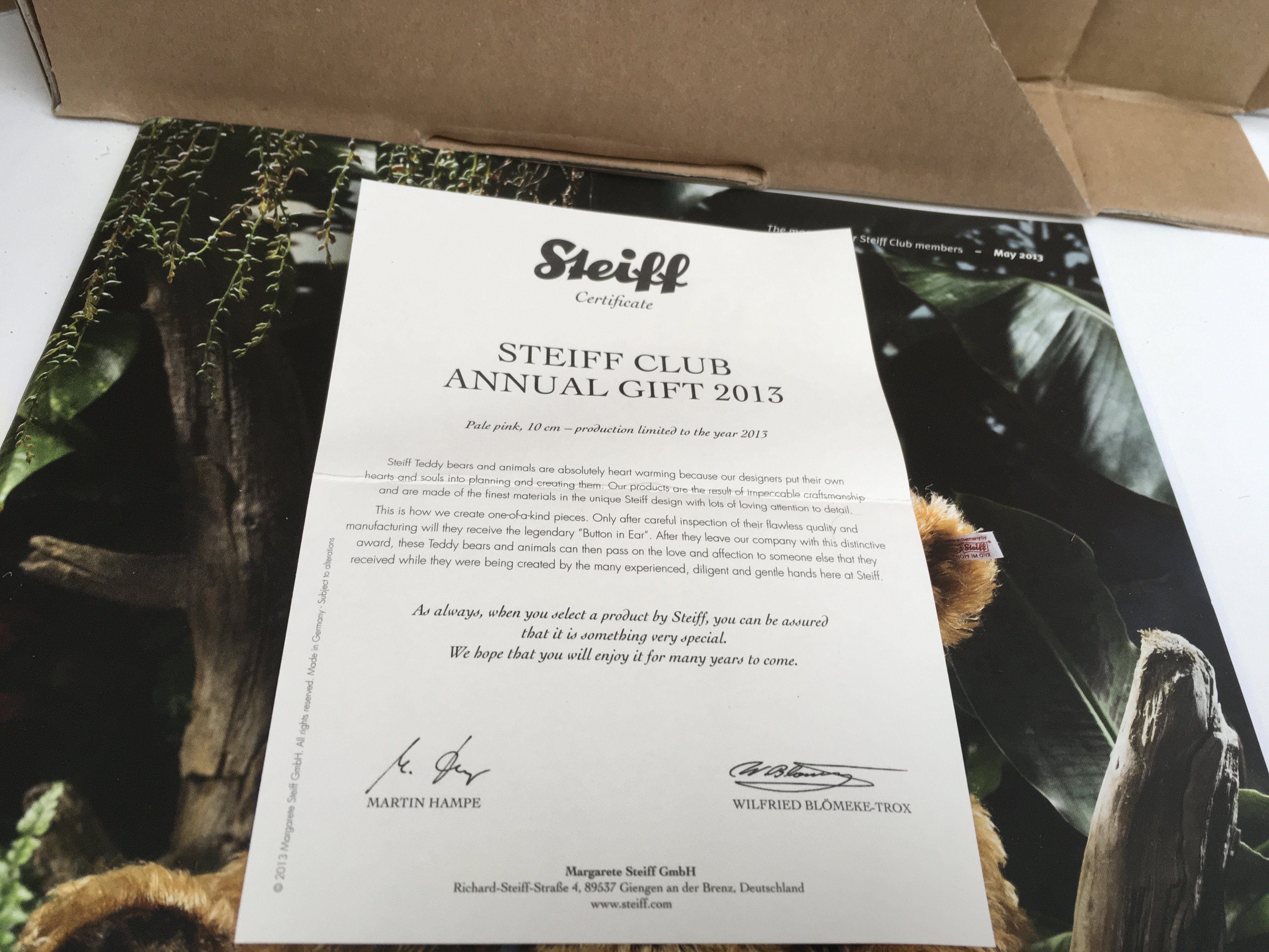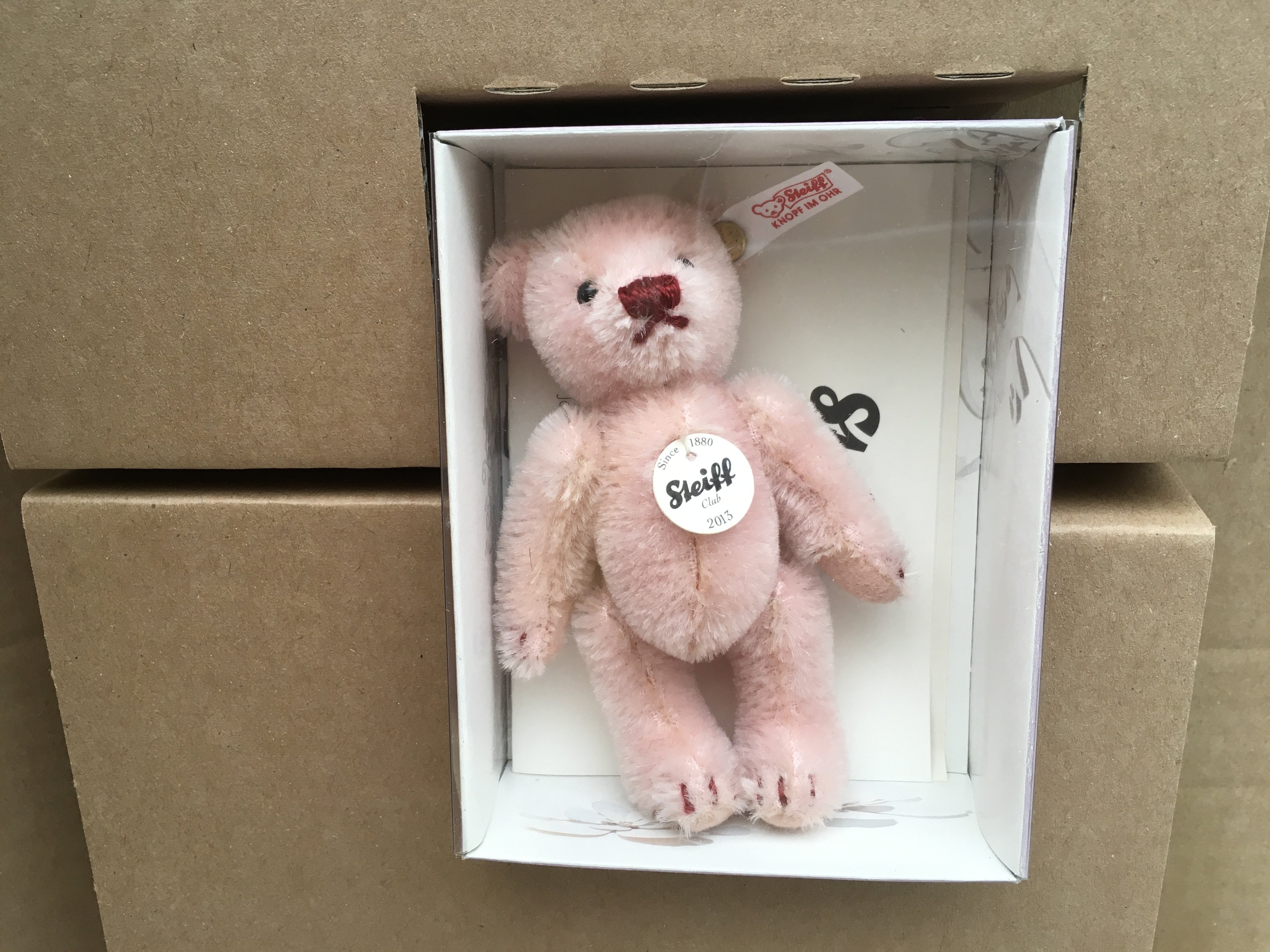 A boxed minature Steiff teddy bear featuring a pale pink 10cms bear from 2013. Certificate included. No reserve