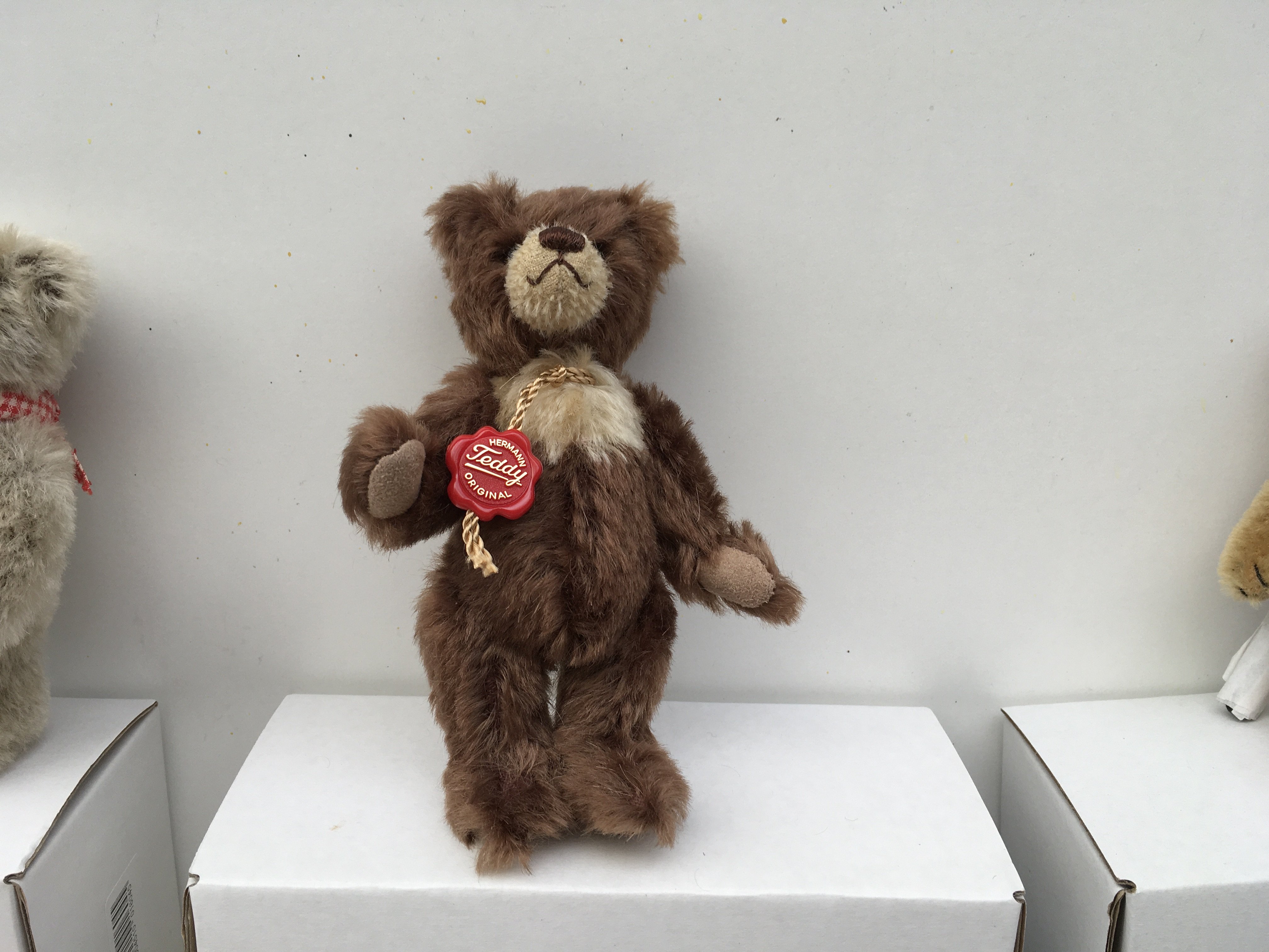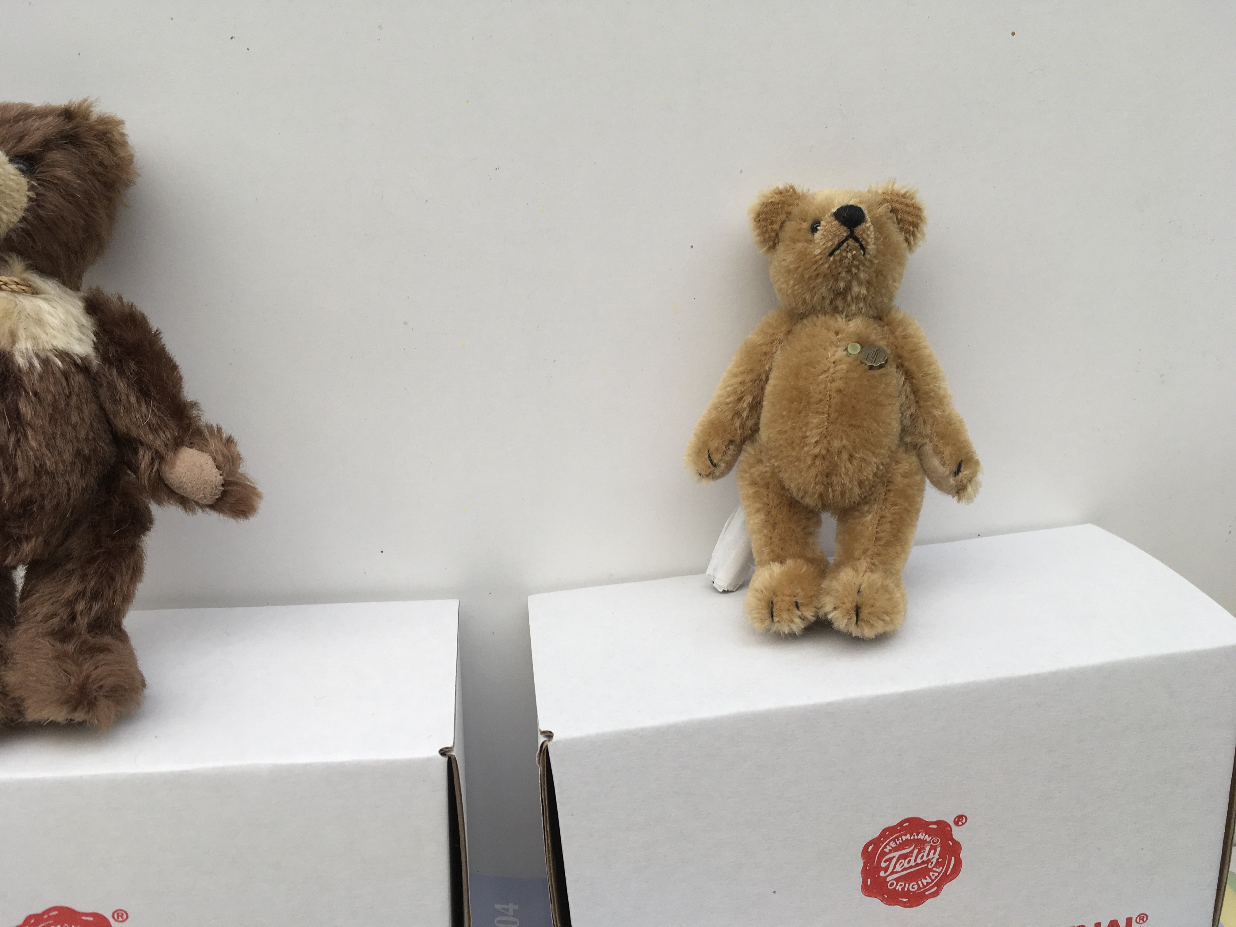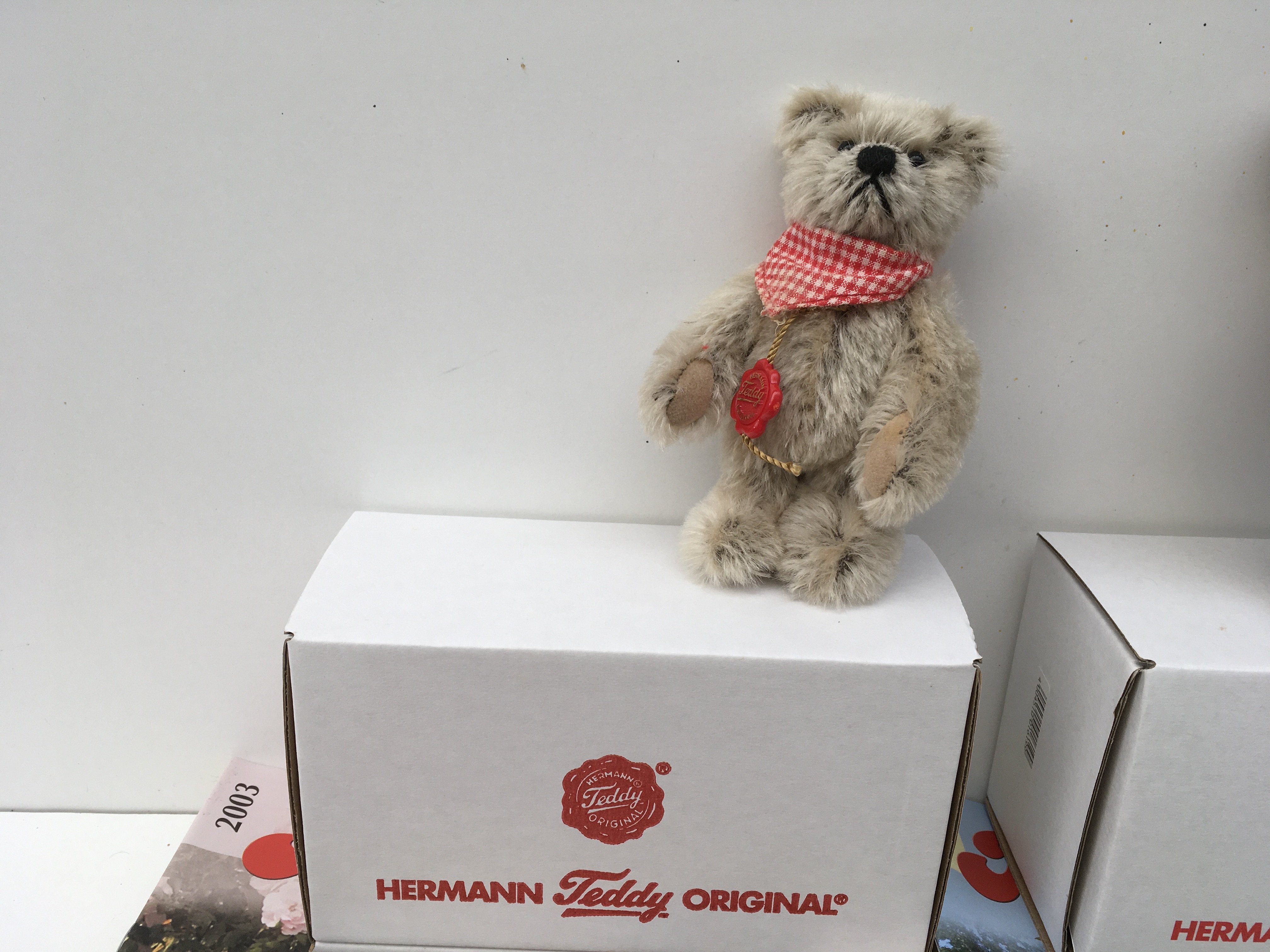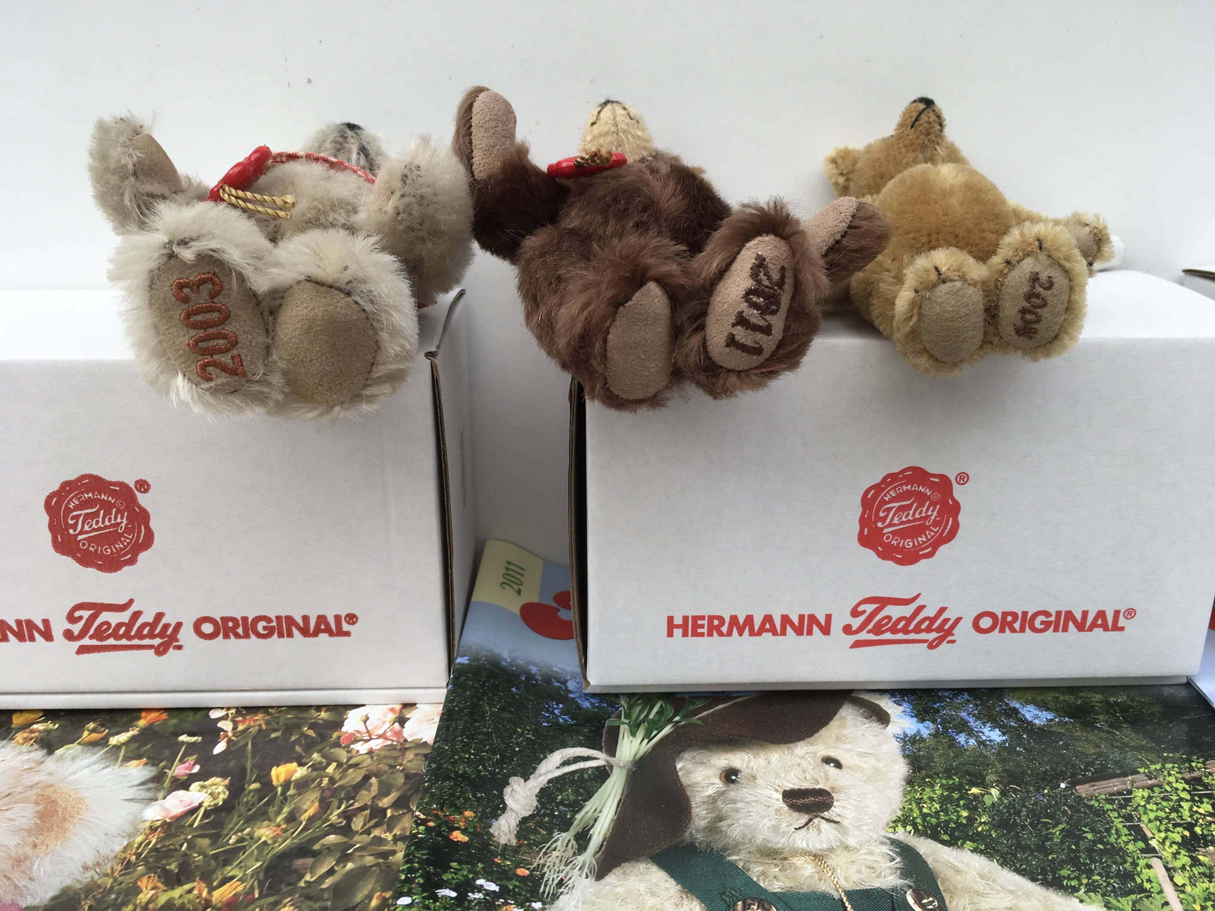 Three boxed minature Herman teddy bears given as a gift to club members. Includes 2003 a 12cms light brown ..2004 11cms golden brown..2011 13cms dark brown with light chest. No reserve