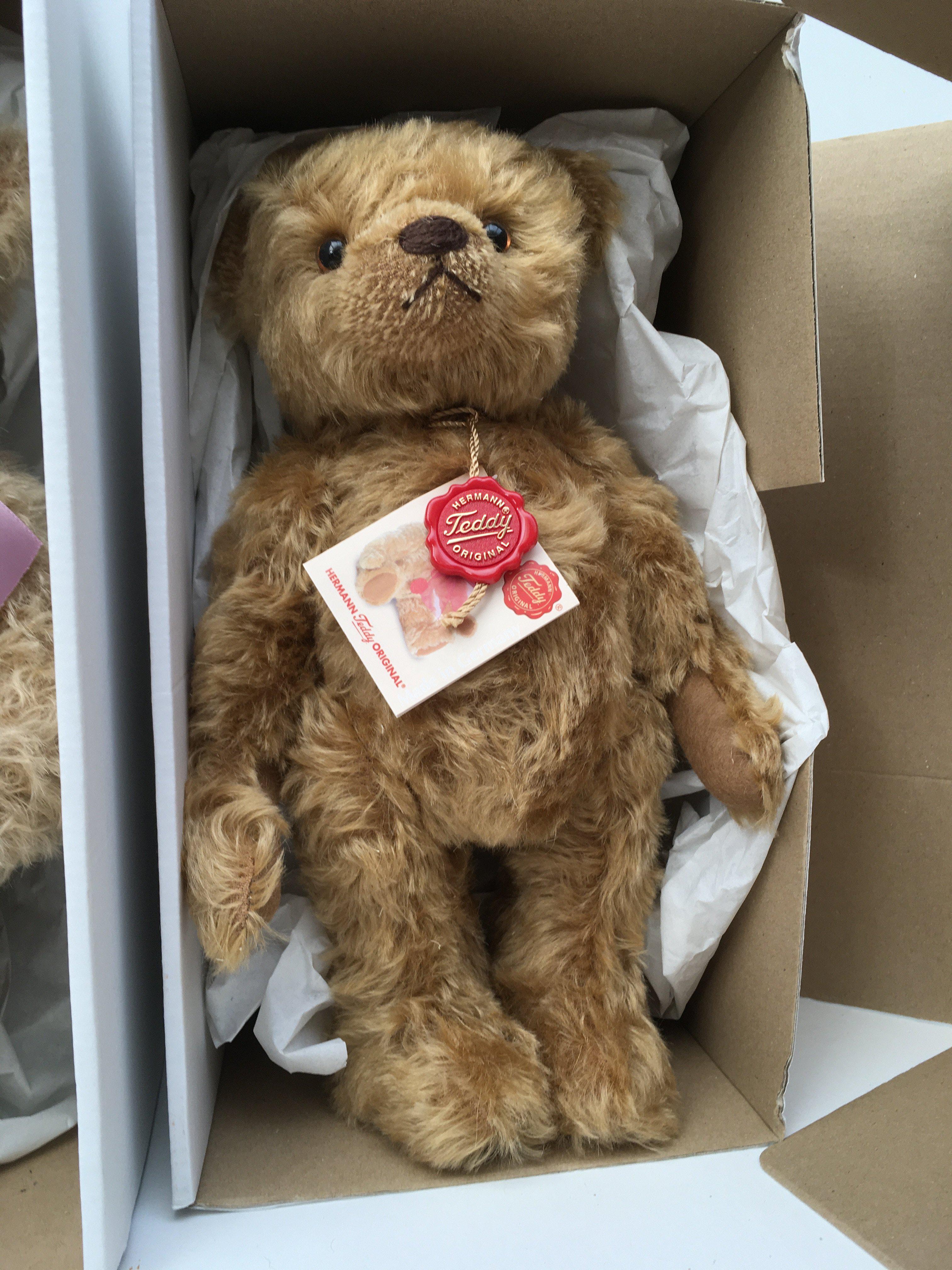 Two boxed windup musical Herman teddy bears. 1x 2011 golden brown 27 cms UK Bear no.41 of 300 and 1x 2009 light brown 30cms UK Bear no.6 of 250. No reserve (2)