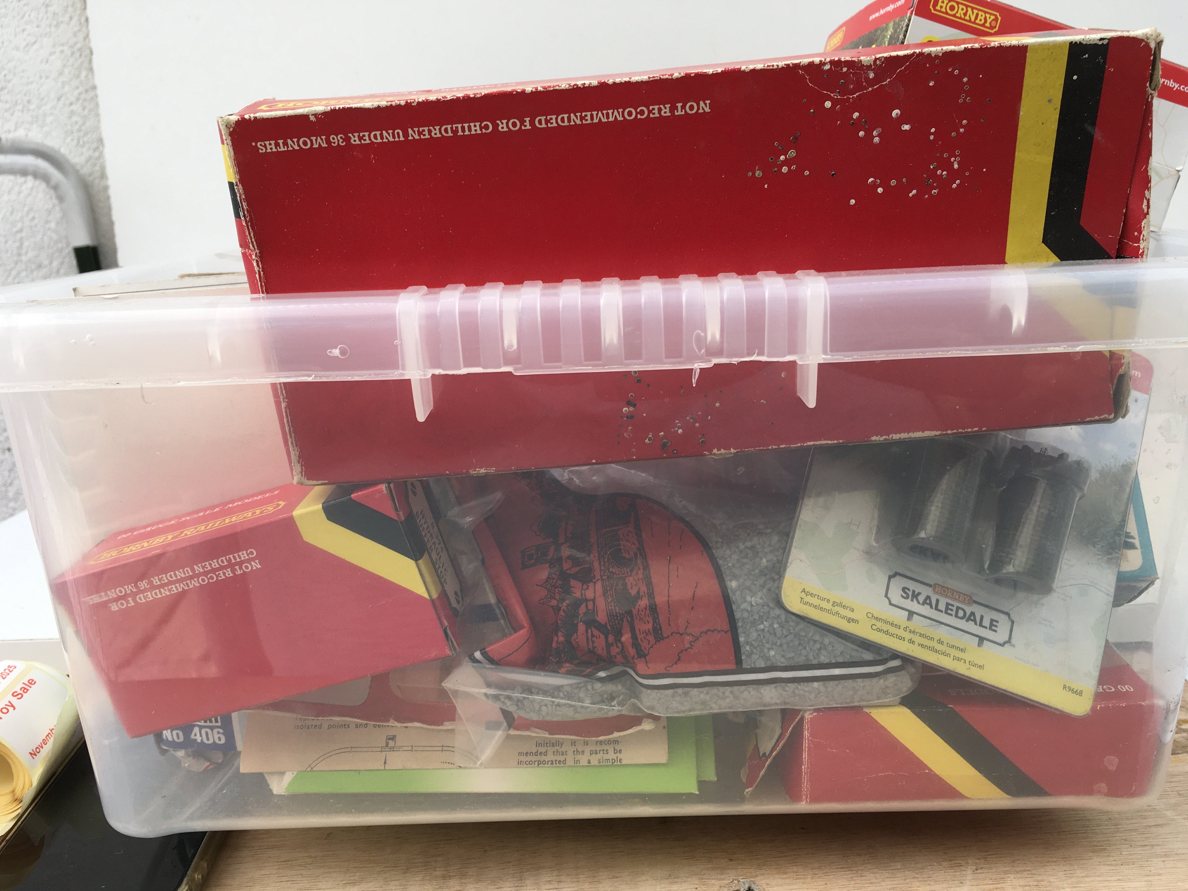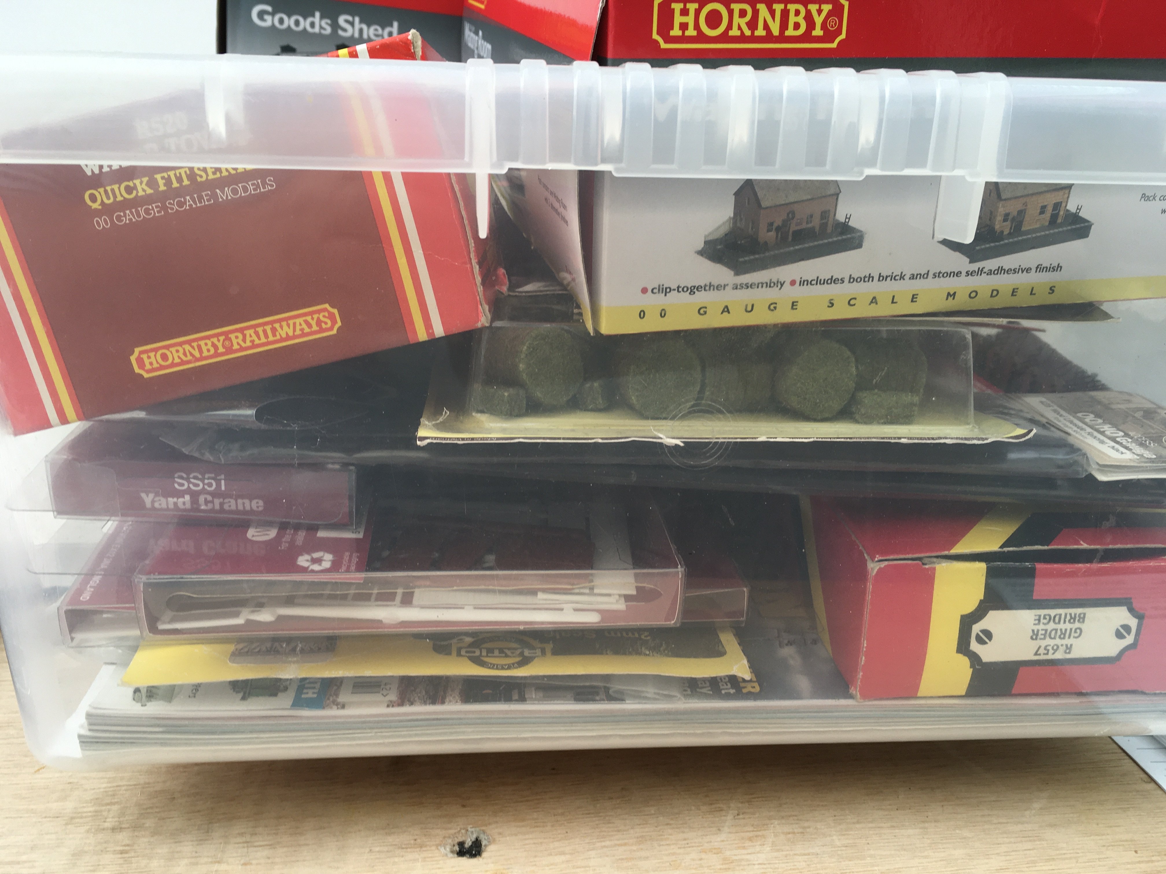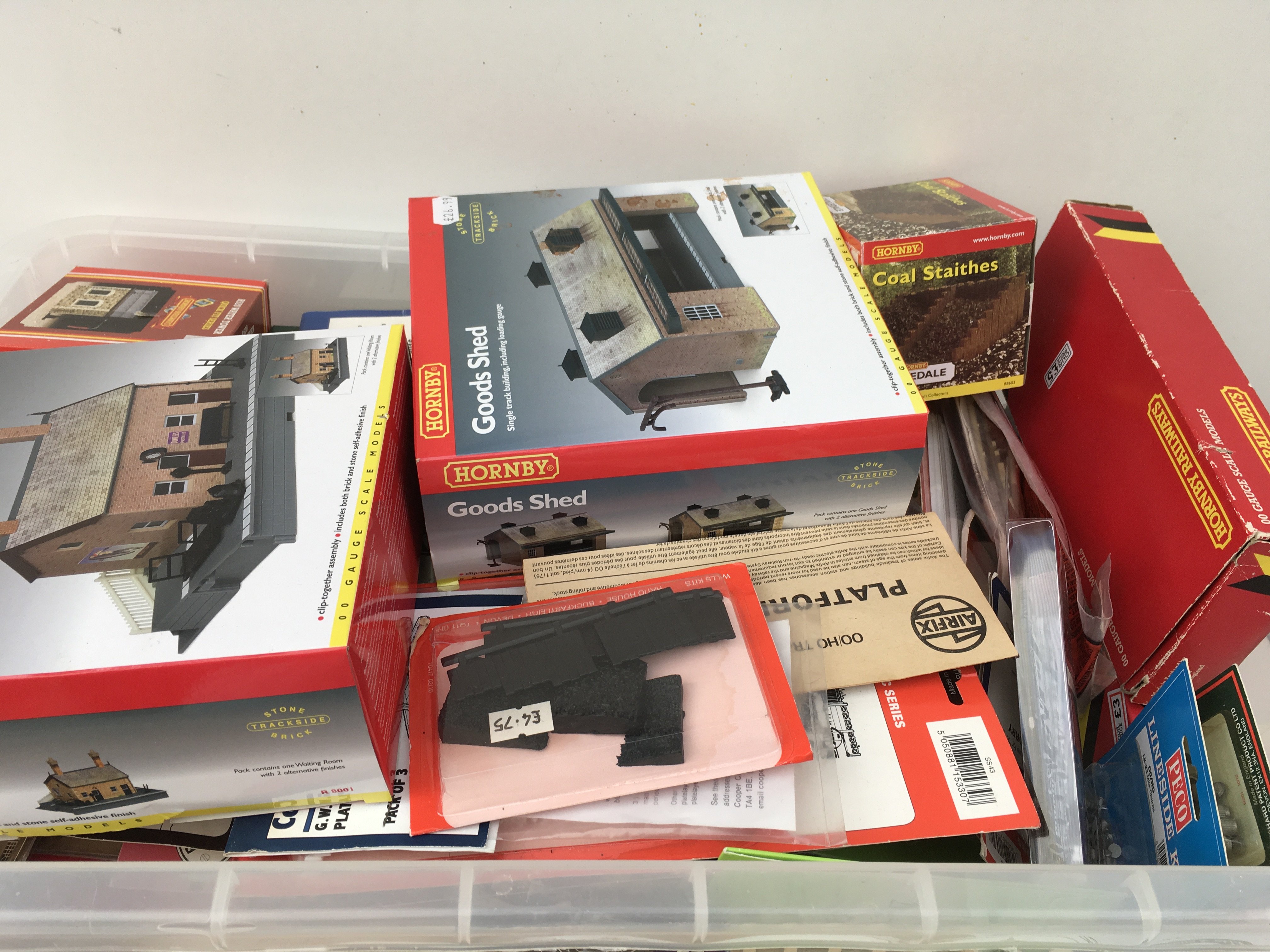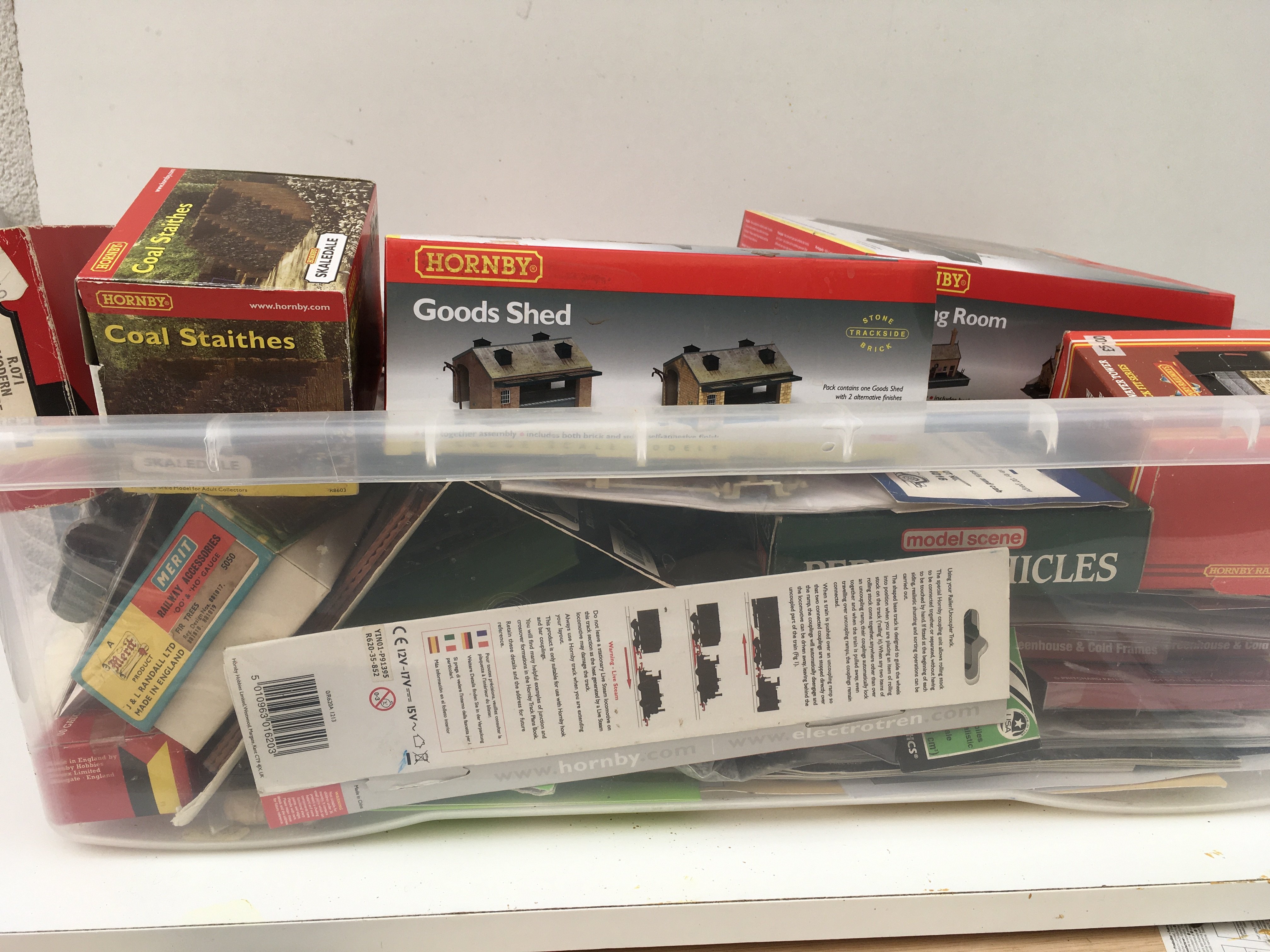 A box containing a large selection of model railway accessories mostly new and unused. Includes buildings..scenery..vehicles etc. multiple manufacturers including Hornby..Metcalfe..Ratio plus others. No reserve