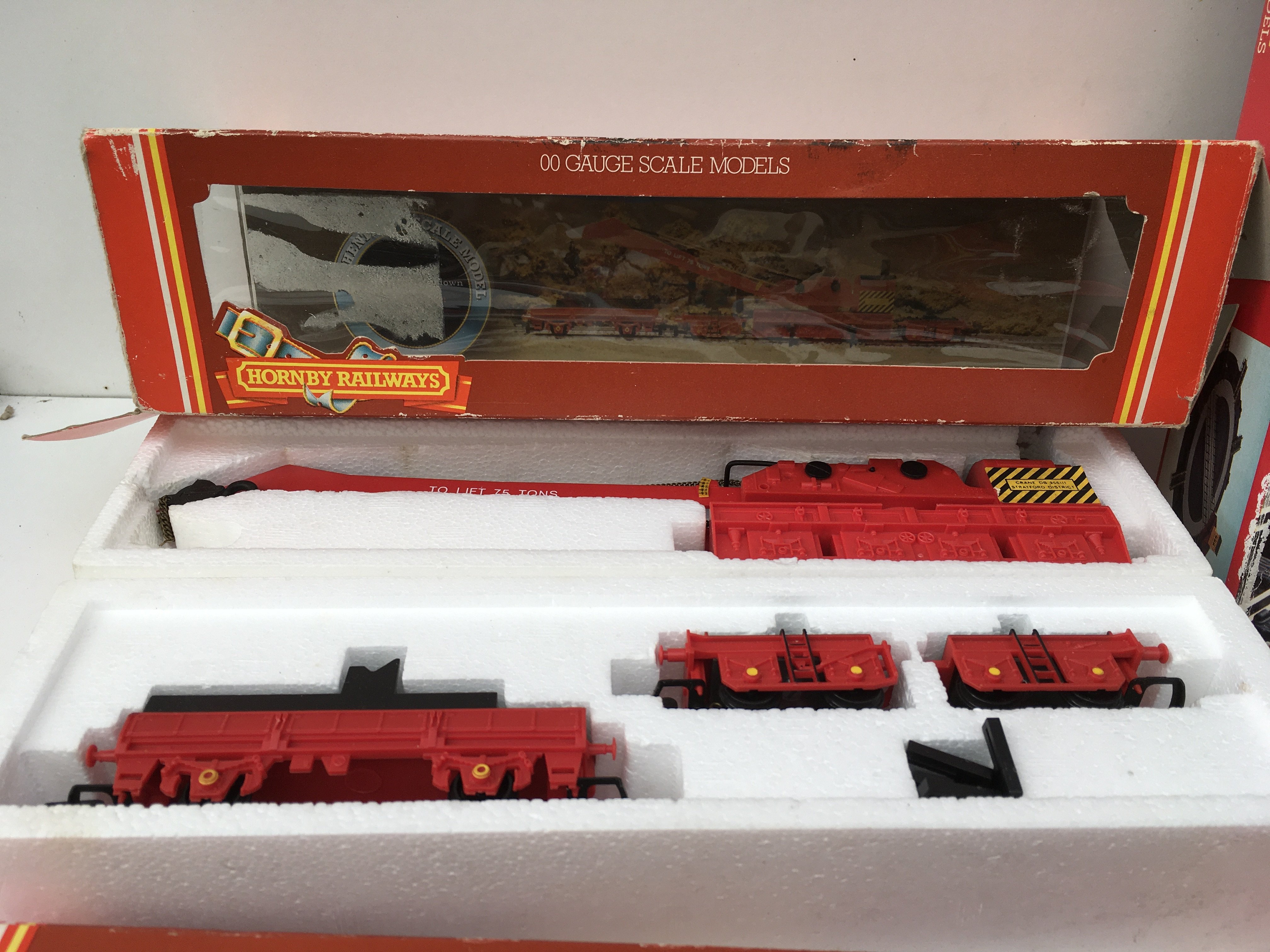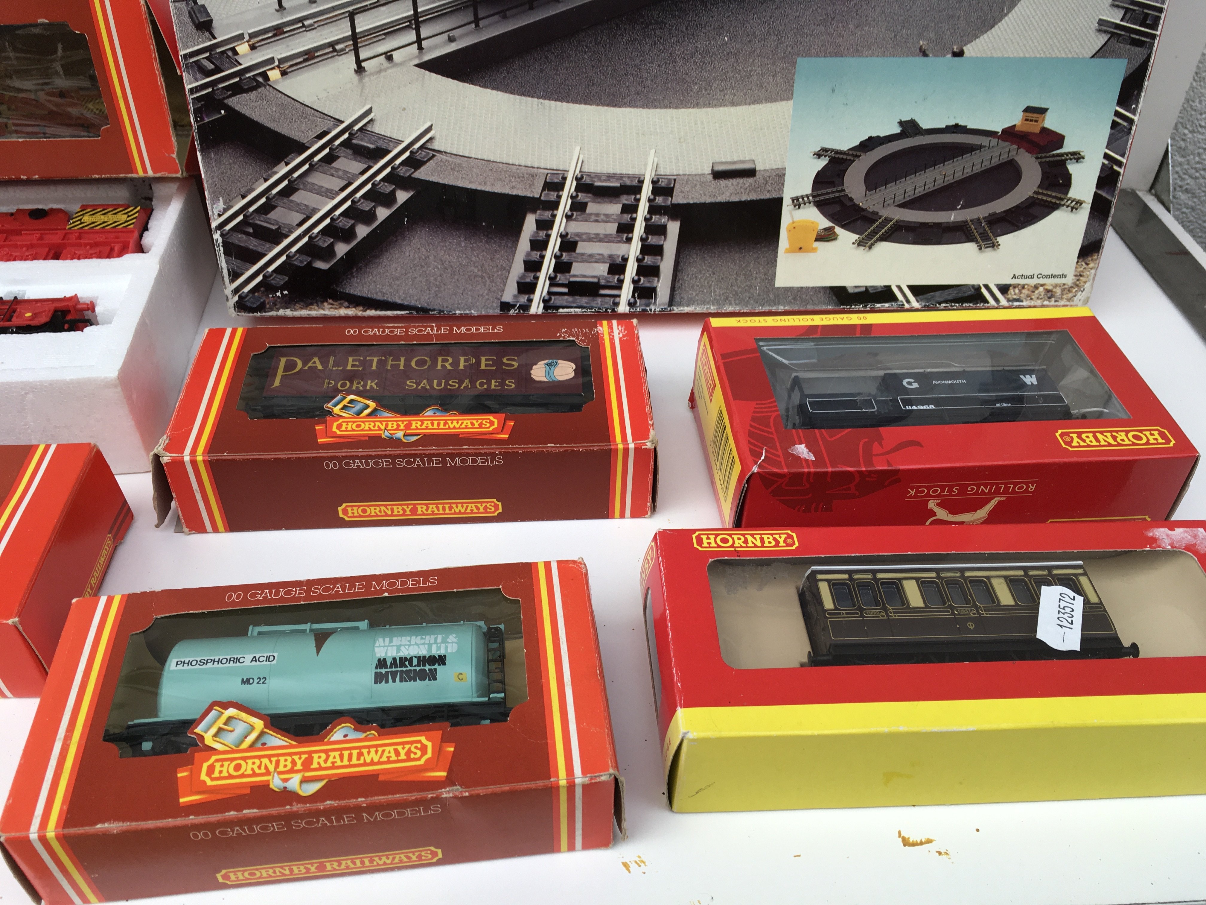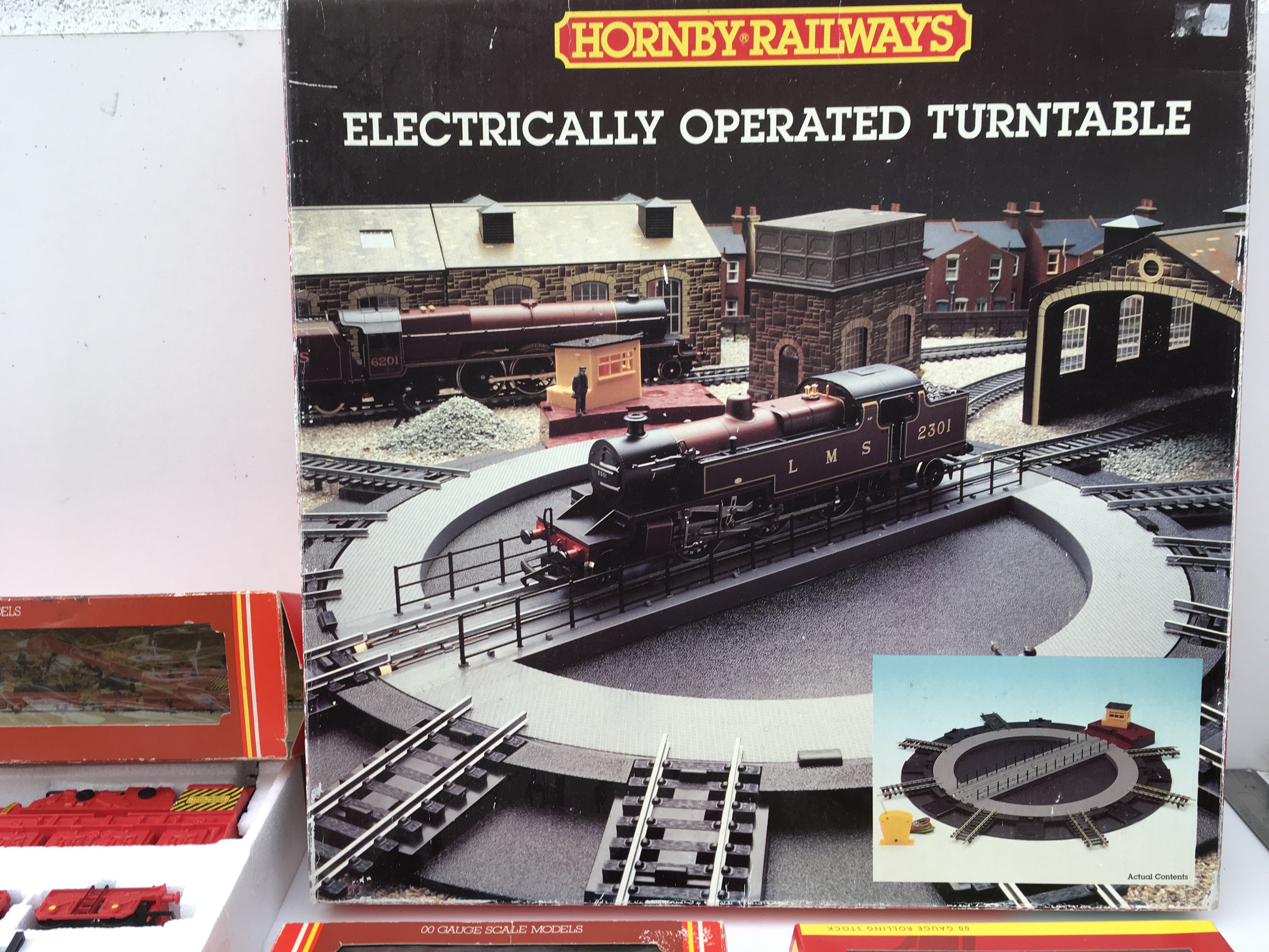 A collection of boxed 00 gauge model railway accessories by Hornby includes electrically operated turntable and vehicles. R026 _R446_R6693_R733_R126 No reserve