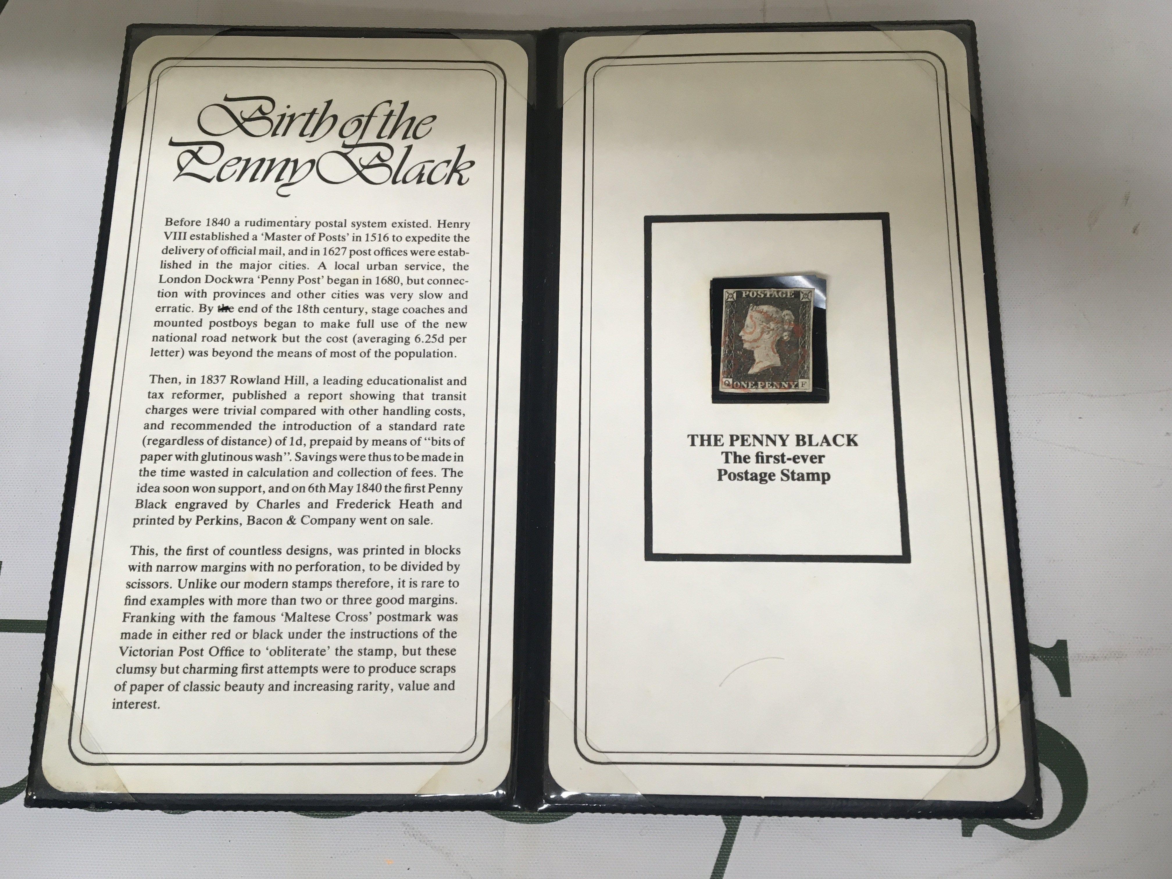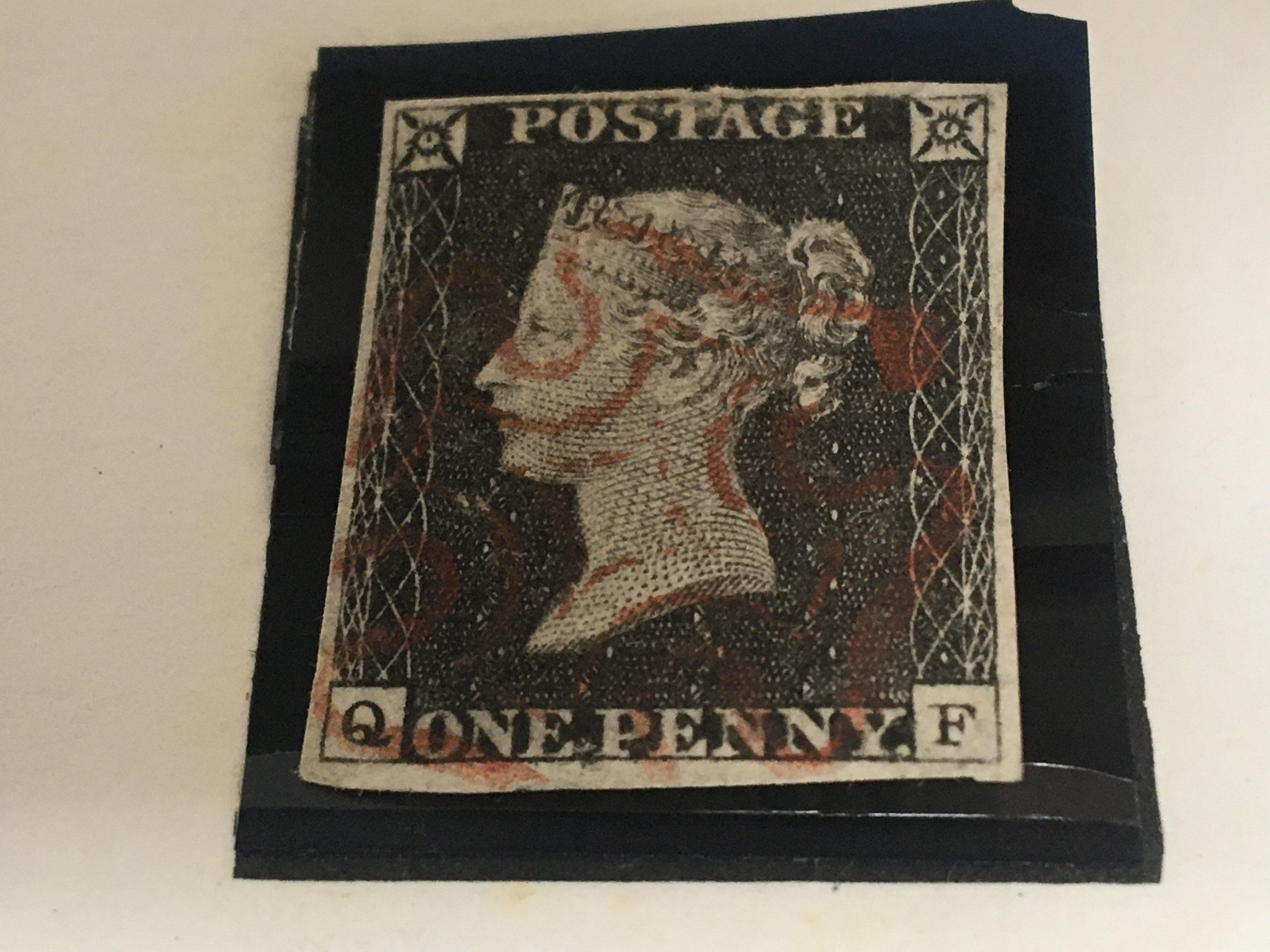 An 1840 Victorian penny black back stamp with red Maltese cross good margins in a black presentation wallet with stamp history.